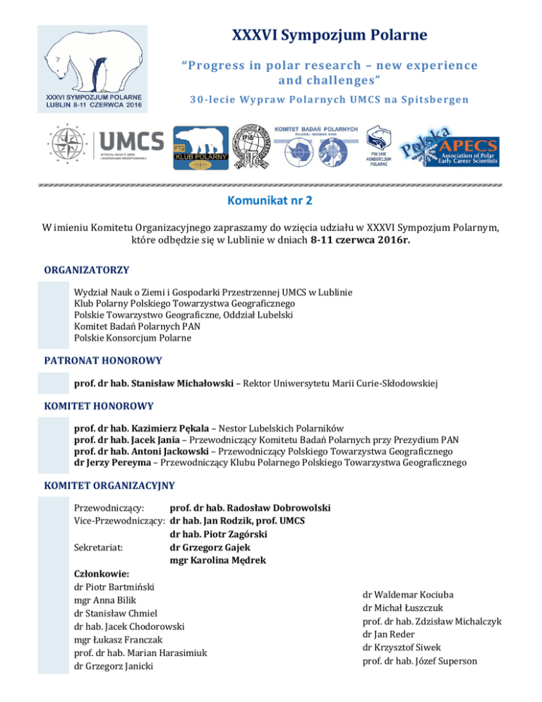 XXXVI Sympozjum Polarne “Progress in polar research – new experience and challenges” 3 0 -le cie Wy praw Polarny ch UMCS na Spitsb e rge n Komunikat nr 2 W imieniu Komitetu Organizacyjnego zapraszamy do wzięcia udziału w XXXVI Sympozjum Polarnym, które odbędzie się w Lublinie w dniach 8-11 czerwca 2016r. ORGANIZATORZY Wydział Nauk o Ziemi i Gospodarki Przestrzennej UMCS w Lublinie Klub Polarny Polskiego Towarzystwa Geograficznego Polskie Towarzystwo Geograficzne, Oddział Lubelski Komitet Badań Polarnych PAN Polskie Konsorcjum Polarne PATRONAT HONOROWY prof. dr hab. Stanisław Michałowski – Rektor Uniwersytetu Marii Curie-Skłodowskiej KOMITET HONOROWY prof. dr hab. Kazimierz Pękala – Nestor Lubelskich Polarników prof. dr hab. Jacek Jania – Przewodniczący Komitetu Badań Polarnych przy Prezydium PAN prof. dr hab. Antoni Jackowski – Przewodniczący Polskiego Towarzystwa Geograficznego dr Jerzy Pereyma – Przewodniczący Klubu Polarnego Polskiego Towarzystwa Geograficznego KOMITET ORGANIZACYJNY Przewodniczący: prof. dr hab. Radosław Dobrowolski Vice-Przewodniczący: dr hab. Jan Rodzik, prof. UMCS dr hab. Piotr Zagórski Sekretariat: dr Grzegorz Gajek mgr Karolina Mędrek Członkowie: dr Piotr Bartmiński mgr Anna Bilik dr Stanisław Chmiel dr hab. Jacek Chodorowski mgr Łukasz Franczak prof. dr hab. Marian Harasimiuk dr Grzegorz Janicki dr Waldemar Kociuba dr Michał Łuszczuk prof. dr hab. Zdzisław Michalczyk dr Jan Reder dr Krzysztof Siwek prof. dr hab. Józef Superson KOMITET NAUKOWY dr hab. inż. Katarzyna Chwedorzewska – Instytut Biochemii i Biofizyki PAN w Warszawie prof. dr hab. Ryszard Michał Czarny – Uniwersytet Jana Kochanowskiego w Kielcach dr hab. Wojciech Dobiński – Uniwersytet Śląski prof. dr hab. Andrzej Gaździcki – Instytut Paleobiologii PAN w Warszawie dr hab. Piotr Głowacki, prof. PAN – Instytut Geofizyki PAN w Warszawie dr Mariusz Grabiec – Uniwersytet Śląski dr inż. Małgorzata Korczak-Abshire – APECS Polska/Instytut Biochemii i Biofizyki PAN w Warszawie dr hab. Krzysztof Kubiak, prof. UJK – Uniwersytet Jana Kochanowskiego w Kielcach dr hab. Leszek Łęczyński, prof. UG – Uniwersytet Gdański dr Maja Lisowska – PKPol/Centrum Studiów Polarnych, Uniwersytet Śląski dr hab. Wojciech Majewski, prof. PAN – Instytut Paleobiologii PAN w Warszawie dr hab. inż. Maciej Manecki, prof. AGH – Akademia Górniczo-Hutnicza w Krakowie prof. dr hab. Krzysztof Migała – Uniwersytet Wrocławski prof. dr hab. Rajmund Przybylak – Uniwersytet Mikołaja Kopernika w Toruniu dr hab. Grzegorz Rachlewicz, prof. UAM – Uniwersytet Adama Mickiewicza w Poznaniu dr hab. Ireneusz Sobota – Uniwersytet Mikołaja Kopernika w Toruniu dr Mateusz Strzelecki – Uniwersytet Wrocławski dr hab. Anna Styszyńska, prof. PG – Politechnika Gdańska dr hab. Witold Szczuciński – Uniwersytet Adama Mickiewicza w Poznaniu dr hab. Waldemar Walczowski, prof. PAN – Instytut Oceanologii PAN w Sopocie prof. dr hab. Jan Marcin Węsławski – Instytut Oceanologii PAN w Sopocie prof. dr hab. Wiesław Ziaja – Uniwersytet Jagielloński RAMOWY PROGRAM po południu Warsztaty APECS Rejestracja przed południem 8 czerwca (środa) 9 czerwca (czwartek) 10 czerwca (piątek) SESJA PLENARNA SESJA PLENARNA Przerwa kawowa Przerwa kawowa I Sesja problemowa II Sesja problemowa III Sesja problemowa Obiad Obiad Sesja posterowa Prezentacje komercyjne IV Sesja problemowa V Sesja problemowa VI Sesja problemowa Przerwa kawowa Przerwa kawowa Spotkania: KBP PAN PKPol SESJA JUBILEUSZOWA 30-lecie Wypraw Polarnych UMCS Spotkanie Klubu Polarnego Ice-breaker Uroczysta kolacja Uroczyste zamknięcie Sympozjum 11 czerwca (sobota) Wycieczka „Lublin i okolice” ZGŁOSZENIA Rejestracja udziału w Sympozjum możliwa będzie wyłącznie za pomocą formularza elektronicznego, dostępnego od 2 stycznia 2016 r. na stronie internetowej: www.sympozjumpolarne2016.umcs.lublin.pl Abstrakty wystąpień w języku polskim i angielskim (maks. po 300 słów) należy zgłaszać elektronicznie pod wyżej wymienionym adresem w terminie 2 stycznia – 31 marca 2016 r. Organizatorzy zastrzegają sobie prawo do zmiany ostatecznej formy wystąpienia (referat lub poster). KOSZTY UCZESTNICTWA Opłata konferencyjna dokonana do 30.04.2016 wynosi: 500,- zł – normalna 350,- zł – doktoranci i studenci Opłata konferencyjna dokonana po 30.04.2016 wynosi: 600,- zł – normalna 400,- zł – doktoranci i studenci Opłata konferencyjna obejmuje: materiały konferencyjne, obiady, udział w Ice-breaker i uroczystej kolacji. Inne koszty: 70,- zł – koszt wycieczki Wpłaty prosimy kierować na konto: Polskie Towarzystwo Geograficzne Oddział Lubelski, al. Kraśnicka 2cd, 20-718 Lublin Bank Pekao S.A., 63 1240 5497 1111 0010 5713 0311 W tytule przelewu należy podać: „2016/Sympozjum Polarne, imię i nazwisko” ZAKWATEROWANIE Organizatorzy nie zapewniają zakwaterowania. W sąsiedztwie Miasteczka Akademickiego znajdują się liczne, zróżnicowane pod względem standardu i ceny obiekty noclegowe: o o o o o o o o o o Victoria, ul. Narutowicza 58/60 Agit Hotel, ul. Wojciechowska 29 Campanile, ul. Lubomelska 14-16 Focus, al. Kraśnicka 80 Huzar, ul. Spadochroniarzy 9 Logos ZNP, ul. Akademicka 4 Młyn, al. Racławickie 32a Mercure, al. Racławickie 12 NaRogatce, ul. Sielankowa 1 Domy Studenckie UMCS: 30-120 zł (ustalenia indywidualne: tel. +48 815375787) MIEJSCE OBRAD Wydział Nauk o Ziemi i Gospodarki Przestrzennej Uniwersytet Marii Curie-Skłodowskiej al. Kraśnicka 2cd 20-718 Lublin WAŻNE TERMINY Nadsyłanie zgłoszeń i abstraktów: 2 stycznia – 31 marca 2016 r. Opłata konferencyjna: 30 kwietnia 2016 r. Sympozjum Polarne: 8-11 czerwca 2016 r. WYDAWNICTWA Planowane jest wydanie tomu streszczeń referatów i posterów – Book of abstracts. Wystąpienia sympozjalne będą kwalifikowane do druku w czasopismach z listy A i B Ministerstwa Nauki i Szkolnictwa Wyższego. Szczegółowe informacje w Komun