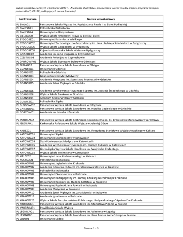 Wykaz wniosków złożonych w konkursie 2017 r.: „Mobilność studentów i pracowników uczelni między krajami programu i krajami partnerskimi”, KA107, podlegających ocenie formalnej Kod Erasmusa Nazwa wnioskodawcy PL BIALA01 PL BIALYST01 PL BIALYST04 PL BIELSKO04 PL BYDGOSZ01 PL BYDGOSZ02 PL BYDGOSZ06 PL BYDGOSZ08 PL CZESTOC02 PL CZESTOC03 PL DABROWA01 PL ELBLAG01 PL GDANSK01 PL GDANSK02 PL GDANSK03 PL GDANSK04 PL GDANSK05 Państwowa Szkoła Wyższa im. Papieża Jana Pawła II w Białej Podlaskiej Politechnika Białostocka Uniwersytet w Białymstoku Wyższa Szkoła Finansów i Prawa w Bielsku-Białej Uniwersytet Kazimierza Wielkiego Uniwersytet Technologiczno-Przyrodniczy im. Jana i Jędrzeja Śniadeckich w Bydgoszczy Wyższa Szkoła Gospodarki w Bydgoszczy Kujawsko-Pomorska Szkoła Wyższa w Bydgoszczy Akademia im. Jana Dlugosza w Częstochowie Akademia Polonijna w Częstochowie Wyższa Szkoła Biznesu w Dąbrowie Górniczej Państwowa Wyższa Szkoła Zawodowa w Elblągu Uniwersytet Gdański Politechnika Gdańska Gdański Uniwersytet Medyczny Akademia Muzyczna im. Stanisława Moniuszki w Gdańsku Akademia Sztuk Pięknych w Gdańsku PL GDANSK06 PL GDANSK08 PL GDANSK11 PL GLIWICE01 PL GLOGOW02 PL GNIEZNO01 PL GORZOW01 Akademia Wychowania Fizycznego i Sportu im. Jędrzeja Śniadeckiego w Gdańsku Wyższa Szkoła Bankowa w Gdańsku Ateneum-Szkoła Wyższa w Gdańsku Politechnika Śląska Państwowa Wyższa Szkoła Zawodowa w Głogowie Państwowa Wyższa Szkoła Zawodowa im. Hipolita Cegielskiego w Gnieźnie Akademia im. Jakuba z Paradyża PL JAROSLA02 PL JELENIA01 Państwowa Wyższa Szkoła Techniczno-Ekonomiczna im. ks. Bronisława Markiewicza w Jarosławiu Karkonoska Państwowa Szkoła Wyższa w Jeleniej Górze PL KALISZ01 PL KATOWIC01 PL KATOWIC02 PL KATOWIC03 PL KATOWIC05 PL KATOWIC07 PL KATOWIC15 PL KIELCE02 PL KOSZALI01 PL KRAKOW01 PL KRAKOW02 PL KRAKOW03 PL KRAKOW04 PL KRAKOW05 PL KRAKOW06 PL KRAKOW08 PL KRAKOW09 PL KRAKOW10 PL KRAKOW19 Państwowa Wyższa Szkoła Zawodowa im. Prezydenta Stanisława Wojciechowskiego w Kaliszu Uniwersytet Śląski Uniwersytet Ekonomiczny w Katowicach Śląski Uniwersytet Medyczny w Katowicach Akademia Wychowania Fizycznego im. Jerzego Kukuczki w Katowicach Gornośląska Wyższa Szkoła Handlowa im. Wojciecha Korfantego Wyższa Szkoła Techniczna w Katowicach Uniwersytet Jana Kochanowskiego w Kielcach Politechnika Koszalińska Uniwersytet Jagielloński w Krakowie Akademia Górniczo-Hutnicza im. Stanisława Staszica w Krakowie Politechnika Krakowska Uniwersytet Ekonomiczny w Krakowie Uniwersytet Pedagogiczny im. Komisji Edukacji Narodowej w Krakowie Uniwersytet Rolniczy im. Hugona Kołłątaja w Krakowie Uniwersytet Papieski Jana Pawła II w Krakowie Akademia Muzyczna w Krakowie Akademia Sztuk Pięknych im. Jana Matejki w Krakowie Akademia Ignatianum w Krakowie PL KRAKOW25 PL KROSNO01 PL KWIDZYN01 PL LEGNICA01 PL LESZNO01 PL LODZ01 Wyższa Szkoła Bezpieczeństwa Publicznego i Indywidualnego "Apeiron" w Krakowie Państwowa Wyższa Szkoła Zawodowa im. Stanisława Pigonia w Krośnie Powiślańska Szkoła Wyższa Państwowa Wyższa Szkoła Zawodowa im. Witelona w Legnicy Państwowa Wyższa Szkoła Zawodowa im. Jana Amosa Komeńskiego w Lesznie Uniwersytet Łódzki Strona 1 z 3 Wykaz wniosków złożonych w konkursie 2017 r.: „Mobilność studentów i pracowników uczelni między krajami programu i krajami partnerskimi”, KA107, podlegających ocenie formalnej PL LODZ02 PL LODZ03 PL LODZ09 PL LOMZA03 PL LOMZA05 PL LUBLIN01 PL LUBLIN02 PL LUBLIN03 PL LUBLIN05 PL LUBLIN06 PL LUBLIN08 PL NOWY-TA01 PL NYSA01 PL OLSZTYN01 PL OPOLE01 PL OPOLE02 PL OPOLE04 PL OSWIECI01 PL PILA02 PL PLOCK02 PL POZNAN01 PL POZNAN02 PL POZNAN03 PL POZNAN04 PL POZNAN05 PL POZNAN13 PL POZNAN14 PL POZNAN15 PL POZNAN22 PL POZNAN25 PL PRZEMYS01 PL RACIBOR01 Politechnika Łódzka Uniwersytet Medyczny w Łodzi Społeczna Akademia Nauk w Łodzi Państwowa Wyższa Szkoła Informatyki i Przedsiębiorczości w Łomży Academy of Agrobusiness in Łomża Uniwersytet Marii Curie-Skłodowskiej Katolicki Uniwersytet Lubelski Jana Pawła II Politechnika Lubelska Uniwersytet Medyczny w Lublinie Wyższa Szkoła Przedsiębiorczości i Administracji w Lublinie Wyższa Szkoła Społeczno-Przyrodnicza im. Wincentego Pola w Lublinie Podhalańska Państwowa Wyższa Szkoła Zawodowa w Nowym Targu Państwowa Wyższa Szkoła Zawodowa w Nysie Uniwersytet Warmińsko-Mazurski w Olsztynie Uniwersytet Opolski Politechnika Opolska Państwowa Medyczna Wyższa Szkoła Zawodowa w Opolu Państwowa Wyższa Szkoła Zawodowa im. rtm. W. Pileckiego w Oświęcimiu Państwowa Wyższa Szkoła Zawodowa im. Stanisława Staszica w Pile Państwowa Wyższa Szkoła Zawodowa w Płocku Uniwersytet im. Adama Mickiewicza w Poznaniu Politechnika Poznańska Uniwersytet Ekonomiczny w Poznaniu Uniwersytet Przyrodniczy w Poznaniu Uniwersytet Medyczny im. Karola Marcinkowskiego w Poznaniu Wyższa Szkoła Bankowa w Poznaniu Wyższa Szkoła Handlu i Usług w Poznaniu Wyższa Szkoła Komunikacji i Zarządzania Wyższa Szkoła Logistyki z siedzibą w Poznaniu Wyższa Szkoła Bezpieczeństwa z siedzibą w Poznaniu Wyższa Szkoła Prawa i Administracji Rzeszowska Szkoła Wyższa Państwowa Wyższa Szkoła Zawodowa w Raciborzu PL RADOM01 PL RZESZOW01 PL RZESZOW02 PL SLUPSK01 PL SOPOT01 PL SOSNOWI01 PL SUCHA-B01 PL SZCZECI01 PL SZCZECI02 PL SZCZECI03 PL SZCZECI15 PL TARNOW02 PL TORUN01 PL TORUN04 PL WARSZAW01 PL WARSZAW02 PL WARSZAW03 PL WARSZAW05 PL WARSZAW07 PL WARSZAW10 PL WARSZAW14 PL WARSZAW21 PL WARSZAW23 PL WARSZAW35 Uniwersytet Technologiczno-Humanistyczny im. Kazimierza Pułaskiego w Radomiu Politechnika Rzeszowska im. Ignacego Lukasiewicza Uniwersytet Rzeszowski Akademia Pomorska w Słupsku Sopocka Szkoła Wyższa Wyższa Szkoła Humanitas Wyższa Szkoła Turystyki i Ekologii Uniwersytet Szczeciński Zachodniopomorski Uniwersytet Technologiczny w Szczecinie Akademia Morska w Szczecinie Akademia Sztuki w Szczecinie Państwowa Wyższ