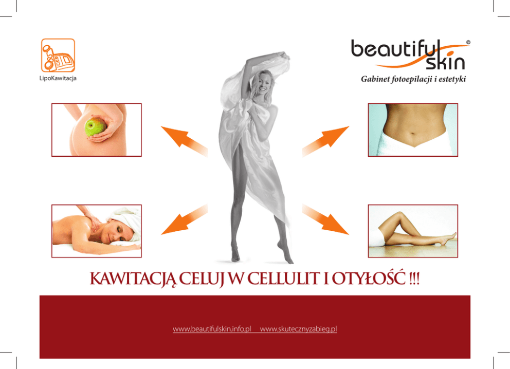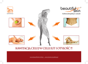 Gabinet fotoepilacji i estetyki LipoKawitacja KAWITACJĄ CELUJ W CELLULIT I OTYŁOŚĆ !!! www.beautifulskin.info.pl www.skutecznyzabieg.pl LipoKawitacja LipoKawitacja – nowej generacji lipoliza kawitacyjna tkanki tłuszczowej LipoKawitacja to nowoczesna technologia wykorzystująca kawitację ultradźwiękową do zabiegów odchudzających. To jedyna nieinwazyjna metoda służąca do likwidacji miejscowo nagromadzonej tkanki tłuszczowej i zmniejszenia cellulitu. Działanie urządzenia opiera się na efekcie kawitacji, która wytworzona jest przez falę ultradźwiękową o niskiej częstotliwości 30 – 40 kHz . W skutek rozszerzania się cząsteczek płynu powstają tzw. mikropęcherzyki próżni, które pod wpływem znacznego przyrostu ciśnienia ulegają implozji, a następnie oddziałują w sposób mechaniczny na otaczające je tkanki. Zakres zastosowania u mężczyzn i kobiet: kształtowanie całego ciała, redukcja cellulitu i tkanki tłuszczowej ( szczególnie miejscowo zlokalizowany tłuszcz: uda, pośladki, biodra, talia, brzuch) Szybkie działanie – Bez chirurga – Najlepsze efekty • • • • • • • • • brak uszkodzeń tkanek otaczających fale ultradźwiękowe o niskiej częstotliwości, selektywnie oddziaływujące na komórki tłuszczowe trwałe zmniejszenie ilości komórek tłuszczowych na wybranym obszarze technologia o skuteczności potwierdzonej w badaniach klinicznych niezależnych bezpieczeństwo i skuteczność potwierdzona klinicznie usuwanie zawartości zniszczonych komórek tłuszczowych poprzez naturalne mechanizmy ciała Cennik zabiegów LipoKawitacji zmniejszenie obwodu średnio o dwa centymetry po jednym zabiegu urządzenie wykorzystujące stabilną kawitacje Przedramię (prawe, lewe) satysfakcjonujące efekty dla większości pacjentów Uda (prawe, lewe) Brzuch Pośladki (prawe, lewe) www.beautifulskin.info.pl Gabinet Ceny w innych gabinetach od 95 pln 250 pln 95 pln x 2 500 pln 95 pln 250 pln 95 pln x 2 500 pln www.skutecznyzabieg.pl