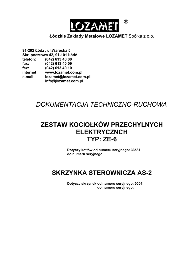 LOZAMEt Łódzkie Zakłady Metalowe LOZAMET Spółka z o.o. 91-202 Łódź , ul.Warecka 5 Skr. pocztowa 42, 91-101 Łódź telefon: (042) 613 40 00 fax: (042) 613 40 09 fax: (042) 613 40 10 internet: www.lozamet.com.pl e-mail: [email protected] [email protected] DOKUMENTACJA TECHNICZNO-RUCHOWA ZESTAW KOCIOŁKÓW PRZECHYLNYCH ELEKTRYCZNCH TYP: ZE-6 Dotyczy kotłów od numeru seryjnego: 33581 do numeru seryjnego: SKRZYNKA STEROWNICZA AS-2 Dotyczy skrzynek od numeru seryjnego; 0001 do numeru seryjnego; SPIS TREŚCI strona 1 CHARAKTERYSTYKA KOTŁA ..................................................................................................... 3 1.1 Zastosowanie.............................................................................................................................3 1.2 Charakterystyka techniczna .....................................................................................................3 1.3 Ogólny opis zestawu kociołków .............................................................................................3 2 INSTRUKCJA MONTAŻU .............................................................................................................. 4 2.1 Ustawienie zestawu kociołków ................................................................................................4 2.2 Przyłączenie do instalacji .........................................................................................................4 2.2.1 Przyłączenie do instalacji elektrycznej ................................................................................4 2.2.2 Przyłączenie do instalacji wodnej.........................................................................................6 3 INSTRUKCJA OBSŁUGI................................................................................................................ 6 3.1 Przygotowanie kotła do pracy..................................................................................................6 3.2 Próbny rozruch ..........................................................................................................................6 3.3 Czynności podczas pracy zestawu kociołków .......................................................................6 3.4 Czynności po zakończeniu pracy zestawu kociołków...........................................................7 3.4.1 Zakończenie gotowania w jednym kociołku ........................................................................7 3.4.2 Zakończenie gotowania we wszystkich kociołkach............................................................7 3.5 Uwagi eksploatacyjne ...............................................................................................................8 3.6 Instrukcja uzupełniania poziomu wody w wytwornicy pary ..................................................8 4 4.1 5 WSKAZANIA BEZPIECZEŃSTWA I HIGIENY PRACY ................................................................ 8 Dozór Techniczny......................................................................................................................9 INSTRUKCJA KONSERWACJI I NAPRAWY. ............................................................................ 10 5.1 Konserwacja bieżąca. .............................................................................................................10 5.2 Konserwacja okresowa...........................................................................................................10 5.3 Naprawy i remonty ..................................................................................................................11 5.4 Wykaz typowych uszkodzeń i zalecane sposoby naprawy ................................................11 6 WYPOSAŻENIE STANARDOWE ................................................................................................ 12 7 WYKAZ CZĘŚCI ZAMIENNYCH.................................................................................................. 13 8 OPISY ZAŁĄCZONYCH RYSUNKÓW ........................................................................................ 14 2 1 CHARAKTERYSTYKA KOTŁA 1.1 Zastosowanie Zestaw trzech kociołków przechylnych wykonanych ze stali kwasoodpornej gat. 1.4301, przeznaczony jest do gotowania i podgrzewania potraw w zakładach zbiorowego żywienia (restauracje, szpitale, hotele, stołówki, itp.). Gotowanie może przebiegać w trzech kociołkach jednocześnie lub pojedynczo w każdym. 1.2 Charakterystyka techniczna Dane techniczne Wymiary gabarytowe - szerokość - głębokość - wysokość podstawy - wysokość całkowita Pojemność zbiorników warzelnych Pojemność całkowita wytwornicy pary Pojemność nominalna wytwornicy pary Masa Moc znamionowa Moce sekcji grzejnych Napięcie zasilania Rodzaj prądu Ciśnienie sieci wodociągowej Zalecana twardość wody * Przyłącze wody Najwyższe ciśnienie robocze pary wodnej Sprawność cieplna Czas rozgrzewania 90l wody /20÷90ºC/ Stopień ochrony IP Stopień zabezpieczenia przed porażeniem prądem Jedn. mm dm3 dm3 dm3 kg kW kW V MPa ºN cal MPa % min ZE-6 1600 560 500 1400 3 x 30 20 14 105 18 6 / 12 / 18 400 3N ~ 50 Hz 0,15 ÷ 0,6 3÷5ºN /stopnie niemieckie/ G ½’’ 0,05 82 40 IP32 kl.I wg PN-EN 60335-1 * Stosowanie wody o większej twardości niż zalecana może spowodować zakamienienie kociołków i wytwornicy pary oraz uszkodzenie elementów osprzętu zestawu. 1.3 Ogólny opis zestawu kociołków Zestaw kociołków przechylnych składa się z trzech kociołków przechylnych /rys.8, rys.1 poz.1/ i podstawy /rys.1 poz5/. Kociołki umieszczone są nad podstawą na krzyżakach /rys.7/, które umożliwiają przechylanie każdego kociołka w celu opróżnienia oraz służą do doprowadzenia pary grzewczej i odprowadzenia kondensatu. Podstawa jest konstrukcją nośną zestawu wykonaną z kształtowanych blach. Pod płytą podstawy umieszczono wytwornicę pary, instalację pary, instalację kondensatu i prz