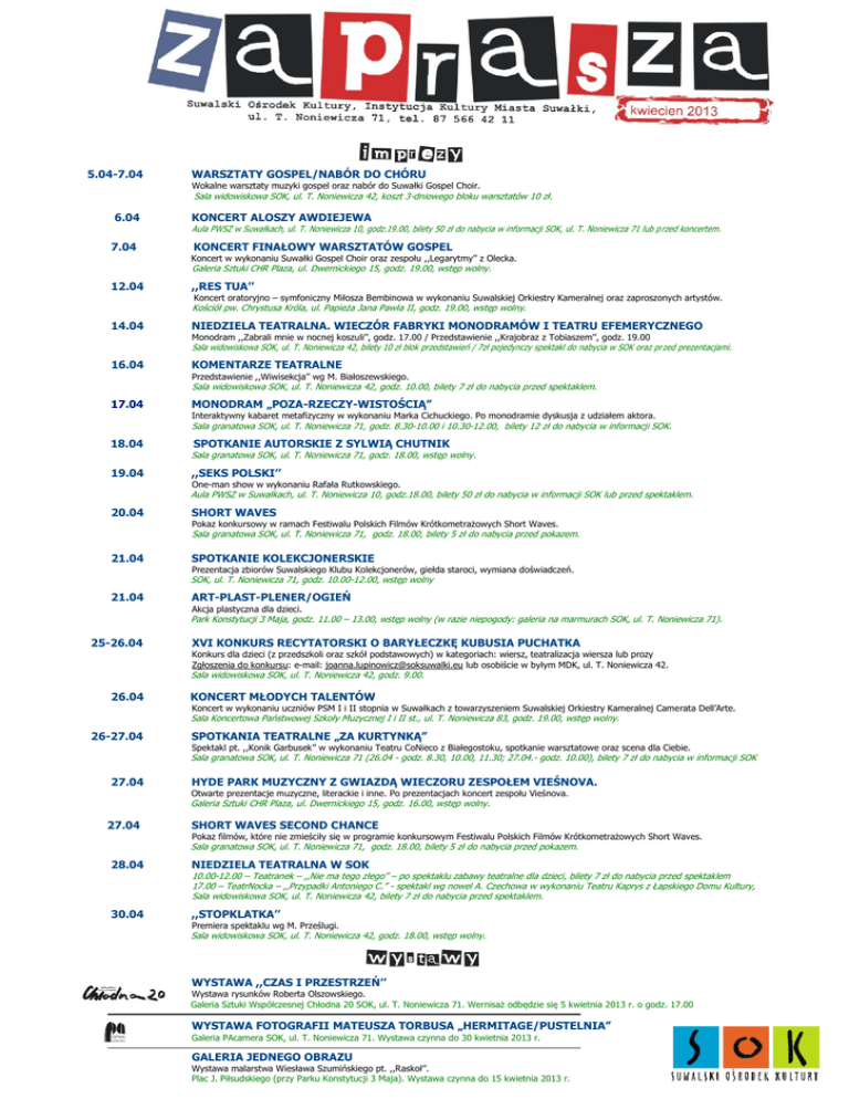 5.04-7.04 WARSZTATY GOSPEL/NABÓR DO CHÓRU Wokalne warsztaty muzyki gospel oraz nabór do Suwałki Gospel Choir. Sala widowiskowa SOK, ul. T. Noniewicza 42, koszt 3-dniowego bloku warsztatów 10 zł. 6.04 7.04 KONCERT ALOSZY AWDIEJEWA Aula PWSZ w Suwałkach, ul. T. Noniewicza 10, godz.19.00, bilety 50 zł do nabycia w informacji SOK, ul. T. Noniewicza 71 lub p rzed koncertem. KONCERT FINAŁOWY WARSZTATÓW GOSPEL Koncert w wykonaniu Suwałki Gospel Choir oraz zespołu ,,Legarytmy’’ z Olecka. Galeria Sztuki CHR Plaza, ul. Dwernickiego 15, godz. 19.00, wstęp wolny. 12.04 ,,RES TUA’’ Koncert oratoryjno – symfoniczny Miłosza Bembinowa w wykonaniu Suwalskiej Orkiestry Kameralnej oraz zaproszonych artystów. Kościół pw. Chrystusa Króla, ul. Papieża Jana Pawła II, godz. 19.00, wstęp wolny. 14.04 NIEDZIELA TEATRALNA. WIECZÓR FABRYKI MONODRAMÓW I TEATRU EFEMERYCZNEGO Monodram ,,Zabrali mnie w nocnej koszuli’’, godz. 17.00 / Przedstawienie ,,Krajobraz z Tobiaszem’’, godz. 19.00 Sala widowiskowa SOK, ul. T. Noniewicza 42, bilety 10 zł blok przedstawień / 7zł pojedynczy spektakl do nabycia w SOK oraz pr zed prezentacjami. 16.04 KOMENTARZE TEATRALNE Przedstawienie ,,Wiwisekcja’’ wg M. Białoszewskiego. Sala widowiskowa SOK, ul. T. Noniewicza 42, godz. 10.00, bilety 7 zł do nabycia przed spektaklem. 17.04 MONODRAM „POZA-RZECZY-WISTOŚCIĄ” Interaktywny kabaret metafizyczny w wykonaniu Marka Cichuckiego. Po monodramie dyskusja z udziałem aktora. Sala granatowa SOK, ul. T. Noniewicza 71, godz. 8.30-10.00 i 10.30-12.00, bilety 12 zł do nabycia w informacji SOK. 18.04 19.04 SPOTKANIE AUTORSKIE Z SYLWIĄ CHUTNIK Sala granatowa SOK, ul. T. Noniewicza 71, godz. 18.00, wstęp wolny. ,,SEKS POLSKI’’ One-man show w wykonaniu Rafała Rutkowskiego. Aula PWSZ w Suwałkach, ul. T. Noniewicza 10, godz.18.00, bilety 50 zł do nabycia w informacji SOK lub przed spektaklem. 20.04 SHORT WAVES Pokaz konkursowy w ramach Festiwalu Polskich Filmów Krótkometrażowych Short Waves. Sala granatowa SOK, ul. T. Noniewicza 71, godz. 18.00, bilety 5 zł do nabycia przed pokazem. 21.04 SPOTKANIE KOLEKCJONERSKIE Prezentacja zbiorów Suwalskiego Klubu Kolekcjonerów, giełda staroci, wymiana doświadczeń. SOK, ul. T. Noniewicza 71, godz. 10.00-12.00, wstęp wolny 21.04 ART-PLAST-PLENER/OGIEŃ Akcja plastyczna dla dzieci. Park Konstytucji 3 Maja, godz. 11.00 – 13.00, wstęp wolny (w razie niepogody: galeria na marmurach SOK, ul. T. Noniewicza 71). 25-26.04 XVI KONKURS RECYTATORSKI O BARYŁECZKĘ KUBUSIA PUCHATKA Konkurs dla dzieci (z przedszkoli oraz szkół podstawowych) w kategoriach: wiersz, teatralizacja wiersza lub prozy Zgłoszenia do konkursu: e-mail: [email protected] lub osobiście w byłym MDK, ul. T. Noniewicza 42. Sala widowiskowa SOK, ul. T. Noniewicza 42, godz. 9.00. 26.04 KONCERT MŁODYCH TALENTÓW Koncert w wykonaniu uczniów PSM I i II stopnia w Suwałkach z towarzyszeniem Suwalskiej Orkiestry Kameralnej Camerata Dell’Arte. Sala Koncertowa Państwowej Szkoły Muzycznej I i II st., ul. T. Noniewicza 83, godz. 19.00, wstęp wolny. 26-27.04 SPOTKANIA TEATRALNE „ZA KURTYNKĄ” Spektakl pt. ,,Konik Garbusek’’ w wykonaniu Teatru CoNieco z Białegostoku, spotkanie warsztatowe oraz scena dla Ciebie. Sala granatowa SOK, ul. T. Noniewicza 71 (26.04 - godz. 8.30, 10.00, 11.30; 27.04.- godz. 10.00), bilety 7 zł do nabycia w informacji SOK 27.04 HYDE PARK MUZYCZNY Z GWIAZDĄ WIECZORU ZESPOŁEM VIEŚNOVA. Otwarte prezentacje muzyczne, literackie i inne. Po prezentacjach koncert zespołu Vieśnova. Galeria Sztuki CHR Plaza, ul. Dwernickiego 15, godz. 16.00, wstęp wolny. 27.04 SHORT WAVES SECOND CHANCE Pokaz filmów, które nie zmieściły się w programie konkursowym Festiwalu Polskich Filmów Krótkometrażowych Short Waves. Sala granatowa SOK, ul. T. Noniewicza 71, godz. 18.00, bilety 5 zł do nabycia przed pokazem. 28.04 NIEDZIELA TEATRALNA W SOK 30.04 ,,STOPKLATKA’’ 10.00-12.00 – Teatranek – ,,Nie ma tego złego’’ – po spektaklu zabawy teatralne dla dzieci, bilety 7 zł do nabycia przed spektaklem 17.00 – TeatrNocka – ,,Przypadki Antoniego C.’’ - spektakl wg nowel A. Czechowa w wykonaniu Teatru Kaprys z Łapskiego Domu Kultury, Sala widowiskowa SOK, ul. T. Noniewicza 42, bilety 7 zł do nabycia przed spektaklem. Premiera spektaklu wg M. Prześlugi. Sala widowiskowa SOK, ul. T. Noniewicza 42, godz. 18.00, wstęp wolny. WYSTAWA ,,CZAS I PRZESTRZEŃ’’ Wystawa rysunków Roberta Olszowskiego. Galeria Sztuki Współczesnej Chłodna 20 SOK, ul. T. Noniewicza 71. Wernisaż odbędzie się 5 kwietnia 2013 r. o godz. 17.00 WYSTAWA FOTOGRAFII MATEUSZA TORBUSA „HERMITAGE/PUSTELNIA” Galeria PAcamera SOK, ul. T. Noniewicza 71. Wystawa czynna do 30 kwietnia 2013 r. GALERIA JEDNEGO OBRAZU Wystawa malarstwa Wiesława Szumińskiego pt. ,,Raskoł’’. Plac J. Piłsudskiego (przy Parku Konstytucji 3 Maja). Wystawa czynna do 15 kwietnia 2013 r.