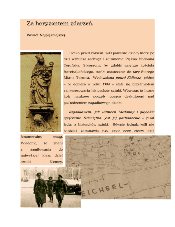 Za horyzontem zdarzeń. Powrót Najpiękniejszej. Krótko przed rokiem 1400 powstało dzieło, które po dziś wzbudza zachwyt i zdumienie. Piękna Madonna Toruńska. Stworzona, by zdobić wnętrze kościoła franciszkańskiego, trafiła ostatecznie do fary Starego Miasta Torunia. Wychwalana ponad Fidiasza, późno – bo dopiero w roku 1909 – stała się przedmiotem zainteresowania historyków sztuki. Wówczas to liczne koła naukowe poczęły gorąco dyskutować nad pochodzeniem zagadkowego dzieła. Zagadkowem, jak uśmiech Madonny i głębokie spojrzenie Dzieciątka, jest jej pochodzenie – pisał jeden z historyków sztuki. Równie jednak, jeśli nie bardziej, zastanawia nas, czyje oczy cieszy dziś fenomenalny Wiadomo, z posąg. że znani zamiłowania najwyższej sztuki klasy do dzieł Niemcy, postanowili „zaopiekować się” Madonną. Był rok 1944, kiedy w obawie przed nadciągającą Armią Czerwoną, ukryli unikatową rzeźbę w ciężkiej okutej skrzyni, po czym przewieźli do okolicznego Grębocina. W tym miejscu wszystko, co pewne, urywa się. Wiele wskazuje na to, iż figura trafiła do Niemiec. Najpewniej – do Jeny. W roku 1962, podczas spotkania dwu wybitnych badaczy sztuki – profesorów Świechowskiego i Carla Heinza Clasena, miały paść słowa, które na długo pozostały w pamięci polskiego naukowca: Proszę się nie martwić, Piękna Madonna jest w dobrych rękach. Było więc jasne, że posąg nie padł ofiarą bezmyślnego wandalizmu. Wedle informacji, których nie udało się potwierdzić, Madonnę zdeponowano w opuszczonej kopalni soli. Pojawiły się nawet pogłoski o Ermitażu, jako jej rzekomym miejscu przechowywania. 15 maja 2015 roku środowisko historyków sztuki zelektryzowała wieść o cudownie odnalezionej figurze. Zgodnie z doniesieniami medialnymi – Piękna Madonna należy do zbiorów prywatnego kolekcjonera dzieł sztuki. Steven Podolansky, polskiego Australijczyk pochodzenia, od blisko pięćdziesięciu lat tropi i nabywa wybitne dzieła zaginione podczas wojny. W posiadłości położonej na przedmieściach Fremantle złożono blisko 1.800 numizmatów, archiwaliów, obrazów i rzeźb – w tym toruńską Madonnę. Krótko po nagłośnieniu sprawy, szanowany toruński przedsiębiorca, działający w branży metalurgicznej, postanawia sprowadzić figurę do miasta. Bartosz Filipiak – Justyński słynie z bajecznie ogromnego majątku, ale i świetnego gustu oraz rozeznania na rynkach sztuki. Po niezbędnych ustaleniach posąg zostaje sprowadzony do Polski. Na 18 listopada 2015 roku zaplanowane są uroczystości związane z powrotem Madonny do Torunia. Imprezę otwierają przemówienia Prezydenta Miasta Torunia, australijskiego kolekcjonera oraz słynnego przedsiębiorcy. Punktualnie o godzinie 12.oo figura trafia na konsolę z popiersiem Mojżesza, na której od kilkudziesięciu lat stała replika Madonny. Podniosła i uroczysta atmosfera zostaje jednak zmącona. Okazuje się, że od blisko piętnastu z lat Fremantle postać jest konesera sztuki doskonale znana polskim i australijskim służbom. Miasto aż huczy od plotek. Starsi torunianie utrzymują, że Podolansky w rzeczywistości nazywa się Eisvogel. Jego ojciec – Jens Eisvogel - pełnił podczas okupacji funkcję kustosza w miejscowym muzeum… © Dom Legend s.c. Toruń 2014