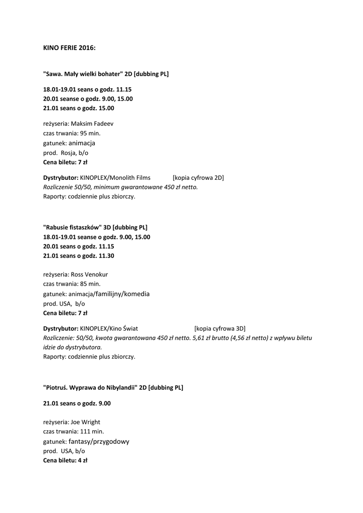 KINO FERIE 2016: "Sawa. Mały wielki bohater" 2D [dubbing PL] 18.01-19.01 seans o godz. 11.15 20.01 seanse o godz. 9.00, 15.00 21.01 seans o godz. 15.00 reżyseria: Maksim Fadeev czas trwania: 95 min. gatunek: animacja prod. Rosja, b/o Cena biletu: 7 zł Dystrybutor: KINOPLEX/Monolith Films [kopia cyfrowa 2D] Rozliczenie 50/50, minimum gwarantowane 450 zł netto. Raporty: codziennie plus zbiorczy. "Rabusie fistaszków" 3D [dubbing PL] 18.01-19.01 seanse o godz. 9.00, 15.00 20.01 seans o godz. 11.15 21.01 seans o godz. 11.30 reżyseria: Ross Venokur czas trwania: 85 min. gatunek: animacja/familijny/komedia prod. USA, b/o Cena biletu: 7 zł Dystrybutor: KINOPLEX/Kino Świat [kopia cyfrowa 3D] Rozliczenie: 50/50, kwota gwarantowana 450 zł netto. 5,61 zł brutto (4,56 zł netto) z wpływu biletu idzie do dystrybutora. Raporty: codziennie plus zbiorczy. "Piotruś. Wyprawa do Nibylandii" 2D [dubbing PL] 21.01 seans o godz. 9.00 reżyseria: Joe Wright czas trwania: 111 min. gatunek: fantasy/przygodowy prod. USA, b/o Cena biletu: 4 zł Dystrybutor: Warner Bros Ryczałt: 600 zł netto Raport: wysyła się. [kopia cyfrowa 2D]