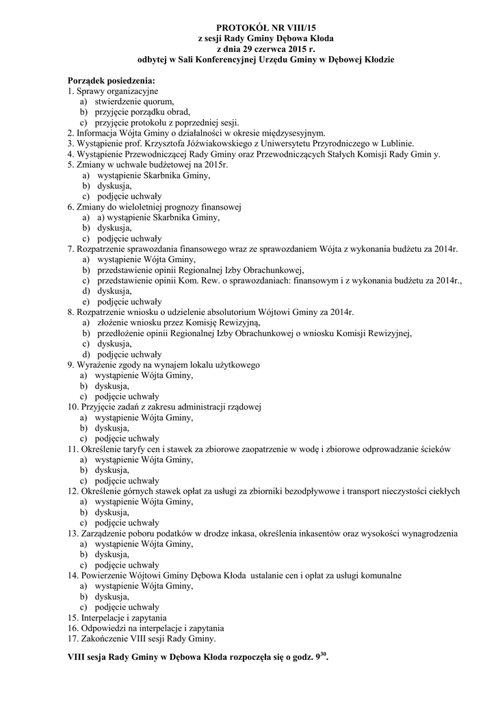PROTOKÓŁ NR VIII/15 z sesji Rady Gminy Dębowa Kłoda z dnia 29