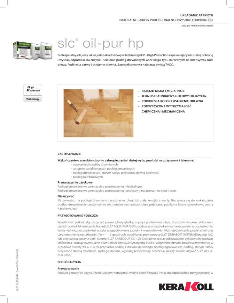Układanie Parkietu Naturalne lakiery profesjonalne o wysokiej odporności LINIA DO PARKIETU I WYKŁADZIN slc oil-pur hp ® Profesjonalny, olejowy lakier jednoskładnikowy w technologii HP - High Protection zapewniający naturalną ochronę i wysoką odporność na zużycie i ścieranie podłóg drewnianych wszelkiego typu narażonych na intensywny ruch pieszy. Podkreśla barwę i usłojenie drewna. Zaprojektowany z najniższą emisją TVOC. igh rotection • bardzo niska emisja TVOC • jednoskładnikowy, gotowy do użycia Technology • podkreśla kolor i usłojenie drewna • podwyższona wytrzymałość chemiczna i mechaniczna ZASTOSOWANIE Wykończenie o wysokim stopniu zabezpieczenia i dużej wytrzymałości na zużywanie i ścieranie: - tradycyjnych podłóg drewnianych - wstępnie wyszlifowanych podłóg drewnianych - podłóg drewnianych, którym należy przywrócić dawną świetność - podłóg bambusowych Przeznaczenie użytkowe Podłogi drewniane we wnętrzach o przeznaczeniu mieszkalnym. Podłogi drewniane we wnętrzach o przeznaczeniu handlowym narażonych na średni ruch. Nie używać Na zewnątrz; na podłogi drewniane narażone na długi lub stały kontakt z wodą. Nie zaleca się do wykańczania podłóg drewnianych narażonych na ekstremalny ruch pieszy (biura publiczne, publiczne lokale rozrywkowe, centra handlowe, itp.). SLC® OIL-PUR HP - Code SLC114 2008/05-PL PRZYGOTOWANIE PODŁOŻA Wyszlifować parkiet, aby otrzymać powierzchnię gładką, czystą i pozbawioną oleju, tłuszczów, wosków, silikonów i starych powłok lakierniczych. Nanieść SLC® AQUA-PUR FLEX (zgodnie ze wskazówkami zamieszczonymi w odpowiedniej karcie technicznej produktu) w celu zaszpachlowania szczelin i nieregularności i/lub ujednolicenia powierzchni oraz ujednorodnienia nasiąkliwości. Po ≈ 1 – 2 godzinach wyszlifować przy pomocy SLC® DURASOFT SYSTEM (Duragrip 120) lub przy użyciu tarczy z siatki ściernej SLC® CARBODUR SIC 120. Dokładnie zebrać odkurzaczem pył powstały podczas szlifowania i usunąć ewentualne pozostałości ścierką antystatyczną PULEX. Wilgotność drewna powinna zawierać się w przedziale między 9% a 11%. W przypadku podłóg z drewna dębowego, podłóg ogrzewanych, podłóg, którym należy przywrócić dawną świetność, suchego drewna, wysokiej temperatury otoczenia, należy zawsze używać SLC® AQUAPUR BASIC. SPOSÓB UŻYCIA Przygotowanie Produkt gotowy do użycia. Przed użyciem wstrząsnąć, włożyć korek filtrujący i wlać do odpowiednio przygotowanej w tym celu kuwety. Usunąć korek filtrujący przed zamknięciem kanistra. Pozostawić na 5 minut, a następnie przystąpić do nakładania produktu. Nanoszenie Nakładać dwie lub trzy warstwy SLC® OIL-PUR HP za pomocą SLC® ROLLER PLUS, zachowując wydajność ≈ 80 – 100 ml/m2 na warstwę, w zależności od zamierzonego wyglądu wykończenia. Nanoszenie dwóch warstw: efekt naturalny Nanieść SLC® OIL-PUR HP lub SLC® AQUA-PUR BASIC, gdy jest to zalecone; po ≈ 10 – 12 godzinach wyszlifować przy pomocy SLC® DURASOFT SYSTEM (Duragrip 220) lub przy użyciu tarczy z siatki ściernej SLC® CARBODUR SIC 220, dokładnie zebrać odkurzaczem pył powstały podczas szlifowania, usunąć ewentualne pozostałości ścierką antystatyczną PULEX, a następnie nanieść SLC® OIL-PUR HP. Nanoszenie trzech warstw: efekt jedwabisty Nanieść SLC® OIL-PUR HP lub SLC® AQUA-PUR BASIC, gdy jest to zalecone; jak tylko podłoga będzie nadawała się do ruchu pieszego, ale po okresie nie dłuższym niż 3 godziny, nanieść SLC® OIL-PUR HP. Po ≈ 12 godzinach wyszlifować przy pomocy SLC® DURASOFT SYSTEM (Duragrip 220) lub przy użyciu tarczy z siatki ściernej SLC® CARBODUR SIC 220; dokładnie zebrać odkurzaczem pył powstały podczas szlifowania i usunąć ewentualne pozostałości ścierką antystatyczną PULEX, a następnie nanieść SLC® OIL-PUR HP. Czyszczenie Czyszczenie narzędzi i usuwanie resztek SLC® OIL-PUR HP wykonuje się przy użyciu wody przed stwardnieniem produktu. INNE WSKAZÓWKI - przed użyciem pozostawić produkt w pomieszczeniu, aby nabrał temperatury otoczenia - używać czystych pojemników i narzędzi - po otwarciu kanistra jego zawartość musi być zużyta jak najszybciej - w celu uzyskania jednorodnego wykończenia należy nanosić warstwy o takiej samej grubości i przestrzegać zalecanych ilości - zawsze przed zastosowaniem SLC® OIL-PUR HP nanieść SLC® AQUA-PUR FLEX - w przypadku drewna szczególnie nasiąkliwego może okazać się konieczne, aby uzyskać jednorodne wykończenie, naniesienie trzech warstw SLC® OIL-PUR HP, niezależnie od zamierzonego wyglądu wykończenia - w przypadku podłóg fazowanych z jasnych gatunków drewna nakładać SLC® OIL-PUR HP przy pomocy pędzla o odpowiednich rozmiarach w celu uniknięcia gromadzenia się produktu w rowkach Konserwacja parkietu Lakierowane podłogi drewniane muszą być co pewien czas poddawane konserwacji. W celu ich oczyszczenia używać neutralnego detergentu SLC® SILOPARK. W celu okresowej i specjalnej konserwacji używać SLC® SILOLUX lub SLC® SILOWAX, w zależności od warunków używania. DANE TECHNICZNE wg Normy Jakości Kerakoll SLC® OIL-PUR HP - Code SLC114 2008/05-PL Wygląd Opakowanie Przechowywanie Uwagi Temperatura użycia Stopień połysku Pyłosuchość Oddanie do użytku Czas oczekiwania między nanoszeniem warstw Wydajność (2-3 warstwy) Bursztynowa, przeźroczysta ciecz Kanistry 5 l ≈ 12 miesięcy w oryginalnym opakowaniu Chronić przed mrozem. Chronić przed bezpośrednim nasłonecznieniem i źródłami ciepła od +5 °C do +30 °C Satynowy ≈ 45 gloss Matowy ≈ 30 gloss ≈ 30 min. ≈ 36 h ≈ 10 – 12 h ≈ 80 – 100 ml/m2 na warstwę Dane uzyskane w temp. +23 °C, przy wilgotności względnej 50% i przy braku wentylacji. Dane mogą ulec zmianie w zależności od warunków panujących na budowie: temperatury, wentylacji i nasiąkliwości podłoża. Uwagi - Prod
