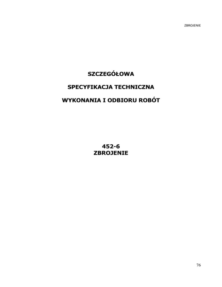 ZBROJENIE SZCZEGÓŁOWA SPECYFIKACJA TECHNICZNA WYKONANIA I ODBIORU ROBÓT 452-6 ZBROJENIE 76 ZBROJENIE SPIS TREŚCI 1. WSTĘP ....................................................................................................................... 78 1.1. Przedmiot SST ........................................................................................................... 78 1.2. Zakres stosowania SST ............................................................................................... 78 1.3. Określenia podstawowe .............................................................................................. 78 1.4. Zakres robót objętych SST .......................................................................................... 78 1.5. Ogólne wymagania dotyczące robót ............................................................................ 78 2. MATERIAŁY................................................................................................................ 78 2.1. Wymagania ogólne .................................................................................................... 78 2.2. Materiały potrzebne do wykonania robót...................................................................... 78 3. SPRZĘT ...................................................................................................................... 80 3.1. Wymagania ogólne .................................................................................................... 80 3.2. Sprzęt do wykonywania robót ..................................................................................... 80 4. TRANSPORT ............................................................................................................... 80 4.1. Wymagania ogólne .................................................................................................... 80 4.2. Transport materiałów ................................................................................................. 80 5. WYKONANIE ROBÓT ................................................................................................. 80 5.1. Wymagania ogólne .................................................................................................... 80 5.2. Organizacja robot ...................................................................................................... 80 5.3. Przygotowanie zbrojenia:............................................................................................ 81 5.4. MontaŜ zbrojenia ....................................................................................................... 81 6. KONTROLA JAKOŚCI ROBÓT..................................................................................... 82 6.1. Wymagania ogólne .................................................................................................... 82 6.2. Badania w czasie wykonywania robót .......................................................................... 82 7. OBMIAR ROBÓT......................................................................................................... 82 8. ODBIÓR ROBÓT ......................................................................................................... 83 8.1. Ogólne zasady odbioru robót. ..................................................................................... 83 8.2. Odbiór robót zanikających i ulegających zakryciu .......................................................... 83 8.3. Wymagania przy odbiorze........................................................................................... 83 9. PODSTAWA PŁATNOŚCI ............................................................................................ 83 10. PRZEPISY ZWIĄZANE ............................................................................................. 84 77 ZBROJENIE 1. WSTĘP 1.1.Przedmiot SST Przedmiotem niniejszej szczegółowej specyfikacji technicznej są wymagania dotyczące wykonania i odbioru zbrojenia betonu w konstrukcjach Ŝelbetowych wykonywanych na mokro w związku z inwestycją polegająca na dźwigu osobowego w klatce schodowej budynku Pomorskiego Urzędu Wojewódzkiego w Gdańsku. 1.2.Zakres stosowania SST Szczegółowa specyfikacja techniczna jest stosowana jako dokument przetargowy i kontraktowy przy zlecaniu i realizacji robót wymienionych w pkt. 1.1. Odstępstwa od wymagań podanych w niniejszej specyfikacji mogą mieć miejsce tylko w przypadkach małych prostych robot i konstrukcji drugorzędnych o niewielkim znaczeniu, dla których istnieje pewność, Ŝe podstawowe wymagania będą spełnione przy zastosowaniu metod wykonania na podstawie doświadczenia i przy przestrzeganiu zasad sztuki budowlanej. 1.3. Określenia podstawowe Określenia i nazewnictwo uŜyte w niniejszej szczegółowej specyfikacji technicznej są zgodne z obowiązującymi podanymi w normach PN i przepisach Prawa budowlanego. Pręty stalowe wiotkie - pręty stalowe o przekroju kołowym Ŝebrowane o średnicy do 40 mm Zbrojenie niespręŜające - zbrojenie konstrukcji betonowej nie wprowadzające do niej napręŜeń w sposób czynny. 1.4. Zakres robót objętych SST Ustalenia zawarte w niniejszej specyfikacji obejmują wszystkie czynności umoŜliwiające i mające na celu wykonanie robót związanych z: przygotowaniem zbrojenia, montaŜem zbrojenia, kontrolą jakości robot i materiałów. 1.5. Ogólne wymagania dotyczące robót Wykonawca robót jest odpowiedzialny za jakość wykonania robót, ich zgodność z dokumentacją projektową, SST i poleceniami InŜyniera. Ogólne wymagania dotyczące robót podano w „Wymaganiach ogólnych” pkt 2 2. MATERIAŁY 2.1. Wymagania ogólne Ogólne wymagania dotyczące materiałów, „Wymaganiach ogólnych” pkt 3.1. ich pozyskiwania i składowania podano w 2.2. Materiały potrzebne do wykonania robót Stal zbrojeniowa Stal zbrojeniowa w elementach Ŝelbetowych A-IIIN (BSt500S) Klasy i gatunki stali z