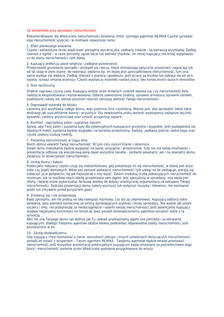 10 wskazówek przy sprzedaży nieruchomości Rekomendowane dla Właściciela nieruchomości działania, które pomogą agentowi RE/MAX Capital sprzedać jego nieruchomość szybciej i w możliwie najwyższej cenie. 1. Efekt pierwszego wrażenia Czyste i odświeżone drzwi wejściowe, porządna wycieraczka, zadbany trawnik - są pierwszą wizytówką. Zadbaj również o ogród – w razie potrzeby zgrab liście lub odśnież chodniki. Im mniej kupujący ma mniej wątpliwości co do stanu nieruchomości, tym lepiej. 2. Kupujący preferują jasne wnętrza i zadbane przestrzenie Przeprowadź gruntowne porządki i pozbądź się rzeczy, które zmniejszają optycznie przestrzeń, zagracają lub od lat stoją w złym stanie, do reperacji, oddania itp. Im lepiej jest uporządkowana nieruchomość, tym ona sama wydaje się większa. Zadbaj również o piwnicę i poddasze. Jeśli ściany są brudne lub odkleja się od nich tapeta, rozważ zmianę wystroju. Często wystarczy niewielki nakład pracy, bez konieczności dużych remontów. 3. Stan techniczny Drobne naprawy czynią cuda. Kupujący widząc dużo drobnych usterek obawia się, czy nieruchomość była należycie eksploatowana i konserwowana. Dobrze zawieszone zasłony, sprawna armatura, sprawne żarówki, podklejone cokoły itd. wbrew pozorom również obniżają wartość Twojej nieruchomości. 5. Doprowadź łazienkę do błysku Łazienka jest wizytówką całego domu, więc powinna lśnić czystością. Ważne jest, aby sprawdzić także takie drobiazgi jak uszczelnienie wanny i prysznica. Dla zwiększenia uroku łazienki wyeksponuj najlepsze ręczniki, dywaniki, zasłony prysznicowe oraz umieść przyjemny zapach. 6. Komfort - zaprojektuj salon i sypialnię marzeń Spraw, aby Twój salon i sypialnia były dla potencjalnych kupujących przytulne i wygodne. Jeśli pozbędziesz się zbędnych mebli, sypialnia będzie wyglądać na bardziej przestronną. Świeża, zadbana pościel, ładna kapa oraz czyste zasłony budują nastrój. 7. Prezentuj nieruchomość w ciągu dnia Niech słońce oświetli Twoją nieruchomość. W tym celu rozsuń firanki i okiennice. Dzięki temu mieszkanie będzie wyglądać na jasne, przyjazne i przestronnie. Gdy nie ma takiej możliwości i prezentacja odbywa się wieczorową porą zapal wszystkie światła - zarówno wewnątrz, jak i na zewnątrz domu. Zwiększy to atrakcyjność nieruchomości. 8. Unikaj tłumu i hałasu Potencjalni nabywcy często czują się niekomfortowo, gdy prezentuje im się nieruchomość, w której jest dużo ludzi czy pupili domowych. Wówczas zamiast poświęcić nieruchomości tyle uwagi na ile zasługuje, starają się zobaczyć ją w pośpiechu, by jak najszybciej z niej wyjść. Zatem zredukuj liczbę pokazujących nieruchomość do minimum. Jak to możliwe niech ofertę przedstawia sam Agent. Jest specjalistą w sprzedaży, zna okoliczne oferty i łatwiej może wykorzystać fachową wiedzę do dobrej, analitycznej argumentacji za zakupem Twojej nieruchomości. Podczas prezentacji domu należy wyciszyć lub wyłączyć muzykę i telewizor, nie nastawiać pralki lub zmywarki przed przyjściem gości 9. Zrelaksuj się i nie przepraszaj Bądź uprzejmy, ale nie próbuj na siłę nawiązać rozmowy, czy też jej zdominować. Kupujący odbiorą takie działania, jako element koniecznej ze strony Sprzedających szybkiej i taniej sprzedaży. Nie ważne jak jesteś szczery i miły, nie przepraszaj za niedociągnięcia i usterki swojej nieruchomości. Jeśli potencjalny kupujący wygłosi negatywny komentarz na temat jej wad, pozwól doświadczonemu agentowi poradzić sobie z tą sytuacją. Nikt nie zna Twojego domu tak dobrze jak Ty, jednak profesjonalny agent zna potrzeby i oczekiwania kupujących, dlatego Twojemu agentowi będzie łatwiej podkreślać odpowiednie zalety nieruchomości, jeśli pozostaniesz w tle. 10. Zaufaj doświadczeniu Gdy kupujący chce rozmawiać o cenie, warunkach zakupu i innych ustaleniach dotyczących nieruchomości, pozwól im mówić z ekspertem – Twoim agentem RE/MAX. Twojemu agentowi będzie łatwiej promować nieruchomość, jeśli wszystkie prezentacje potencjalnym kupującym będą umawiane za pośrednictwem jego biura i nieruchomość zostanie przez Właściciela spokojnie przygotowana do wizyty.