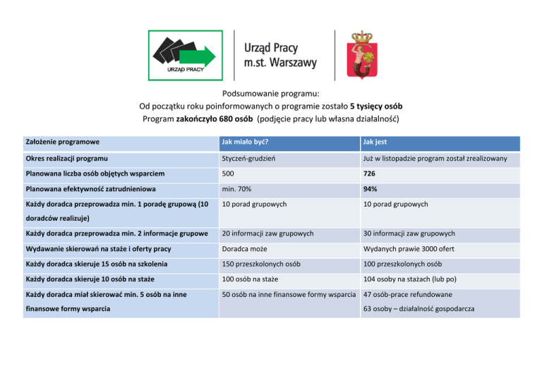 Podsumowanie programu: Od początku roku poinformowanych o programie zostało 5 tysięcy osób Program zakończyło 680 osób (podjęcie pracy lub własna działalność) Założenie programowe Jak miało być? Jak jest Okres realizacji programu Styczeń-grudzień Już w listopadzie program został zrealizowany Planowana liczba osób objętych wsparciem 500 726 Planowana efektywność zatrudnieniowa min. 70% 94% Każdy doradca przeprowadza min. 1 poradę grupową (10 10 porad grupowych 10 porad grupowych Każdy doradca przeprowadza min. 2 informacje grupowe 20 informacji zaw grupowych 30 informacji zaw grupowych Wydawanie skierowań na staże i oferty pracy Doradca może Wydanych prawie 3000 ofert Każdy doradca skieruje 15 osób na szkolenia 150 przeszkolonych osób 100 przeszkolonych osób Każdy doradca skieruje 10 osób na staże 100 osób na staże 104 osoby na stażach (lub po) Każdy doradca miał skierować min. 5 osób na inne 50 osób na inne finansowe formy wsparcia 47 osób-prace refundowane doradców realizuje) finansowe formy wsparcia 63 osoby – działalność gospodarcza