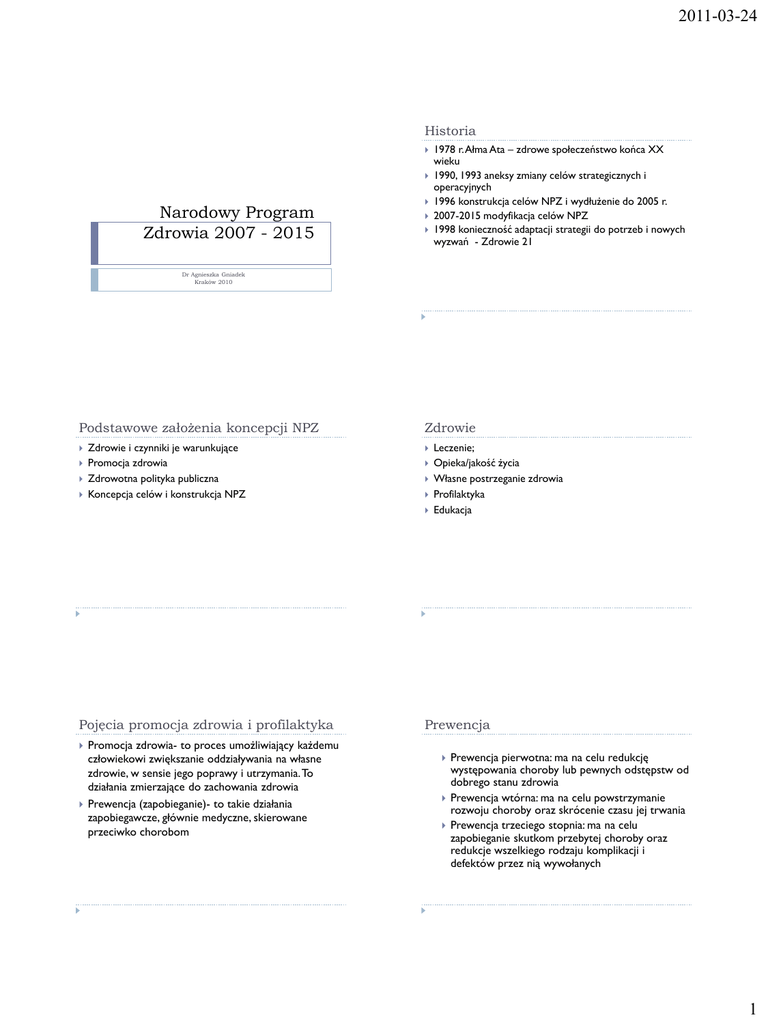 2011-03-24 Historia Narodowy Program Zdrowia 2007 - 2015 1978 r. Ałma Ata – zdrowe społeczeństwo końca XX wieku 1990, 1993 aneksy zmiany celów strategicznych i operacyjnych 1996 konstrukcja celów NPZ i wydłużenie do 2005 r. 2007-2015 modyfikacja celów NPZ 1998 konieczność adaptacji strategii do potrzeb i nowych wyzwań - Zdrowie 21 Dr Agnieszka Gniadek Kraków 2010 Podstawowe założenia koncepcji NPZ Zdrowie i czynniki je warunkujące Promocja zdrowia Zdrowotna polityka publiczna Koncepcja celów i konstrukcja NPZ Zdrowie Pojęcia promocja zdrowia i profilaktyka Promocja zdrowia- to proces umożliwiający każdemu człowiekowi zwiększanie oddziaływania na własne zdrowie, w sensie jego poprawy i utrzymania. To działania zmierzające do zachowania zdrowia Prewencja (zapobieganie)- to takie działania zapobiegawcze, głównie medyczne, skierowane przeciwko chorobom Leczenie; Opieka/jakość życia Własne postrzeganie zdrowia Profilaktyka Edukacja Prewencja Prewencja pierwotna: ma na celu redukcję występowania choroby lub pewnych odstępstw od dobrego stanu zdrowia Prewencja wtórna: ma na celu powstrzymanie rozwoju choroby oraz skrócenie czasu jej trwania Prewencja trzeciego stopnia: ma na celu zapobieganie skutkom przebytej choroby oraz redukcje wszelkiego rodzaju komplikacji i defektów przez nią wywołanych 1 2011-03-24 Podejście do promocji i prewencji Podejście prewencyjne Podejście promocyjne Punkt wyjścia Choroba Zdrowie Cel Uniknięcie choroby Pomnażanie rezerw i potencjału zdrowia Grupa oddziaływania Grupy szczególnego ryzyka Cała populacja w kontekście codziennego życia Podstawowe założenia koncepcji NPZ zdrowie cd. Fundamentalne warunki zapewniające zdrowie: pokój, stabilny system ekonomiczny, odtwarzalne zasoby naturalne, globalne i lokalne bezpieczeństwo obejmujące bezpieczeństwo ekologiczne oraz mieszkanie, żywienie, edukacja, zarobki, sprawiedliwość i równość społeczna Definicje zdrowia a zadania pielęgniarki Zdrowie do dobre funkcjonowanie bio-psychospołeczne i duchowe. (oddziaływanie na kondycje fizyczną, psychiczną, duchową społeczną ( w tym również rodzinne) Pielęgniarka udziela rad o charakterze prewencyjnym, skupia się na sytuacji jednostki, w niewielkim stopniu oddziaływuje na grupę. Do jej zadań włączona jest rola ekspresyjna (ma na celu poprawę kondycji psychicznej). W edukacji zdrowotnej położony jest nacisk na całościowe funkcjonowanie pacjenta Podstawowe założenia koncepcji NPZ zdrowie Podkreślenie istoty zdrowia jako: wartości, zasobu (bogactwa) i środka Zdrowie nie jest stanem statycznym ale dynamicznym i należy je we wszystkich okresach życia: chronić (profilaktyka), doskonalić (promocja zdrowia), przywracać (leczenie, rehabilitacja); Czynniki warunkujące zdrowie: styl życia, środowisko fizyczne oraz społeczne życia i pracy, czynniki genetyczne, służba zdrowia Definicje zdrowia a zadania pielęgniarki Zdrowie to brak choroby (pielęgniarka nie zajmuje się zdrowiem tylko chorobą, koncentruje się na człowieku chorym w celu likwidacji choroby, jest głównym pomocnikiem lekarza) Definicje zdrowia a zadania pielęgniarki Zdrowie to sprawności w wykonywaniu czynności życia codziennego (wzmocnienie sprawności, zastąpienie albo pomoc w czynnościach życia codziennego Pielęgniarka uczy pacjenta i otoczenie jak radzić sobie z problemami dnia codziennego) 2 2011-03-24 Definicje zdrowia a zadania pielęgniarki Zdrowie to samodzielne twórcze życie, nie tylko bez chorób i niepełnej sprawności ale nawet z nimi (do pielęgniarki należy wspieranie zdrowia, jego zabezpieczenie, potęgowanie i ochrona, przywracanie optymalnego poziomu samodzielnego, aktywnego i twórczego życia człowieka). Aktywizowanie i wspomaganie rodziny (otoczenia pacjenta), wspieranie grup pomocy Podstawowe założenia koncepcji NPZ – zdrowotna polityka publiczna To przełożenie w Programie NPZ akcentu z działań najwyższych szczebli zarządzania i administracji państwowej na POWSZECHNE działania z udziałem wszystkich podmiotów życia publicznego (zarobki, podatki, bezpieczeństwo socjalne, edukacja, transport) Podstawowe założenia koncepcji NPZ – promocja zdrowia wg. NPZ To proces umożliwiający ludziom: - Zwiększanie kontroli nad swoim zdrowiem (identyfikacja własnych problemów zdrowotnych) - Poprawę zdrowia – poprzez podejmowanie wyborów i decyzji sprzyjających zdrowiu, kształtowaniu potrzeb i kompetencji w odniesieniu do zdrowia, zwiększanie potencjału zdrowia Główne zagrożenia zdrowia i problemy zdrowotne ludności - - Główne zagrożenia zdrowia i problemy zdrowotne ludności cd. - Główne problemy zdrowotne: choroby układu krążenia; nowotwory złośliwe; urazy i zatrucia; choroby układu oddechowego i trawiennego; choroby zakaźne; choroby zawodowe i związane z wykonywaniem pracy; inwalidztwo i niepełnosprawność; próchnica zębów i choroby przyzębia. Główne zagrożenia zdrowia: - Wadliwy styl życia (mała aktywność fizyczna, nieprawidłowości w sposobie żywienia, palenie tytoniu, nadmierne spożycie alkoholu – zwłaszcza napojów wysokoprocentowych, używanie substancji psychoaktywnych (innych niż alkohol i nikotyna) Zagrożenia w środowisku społecznym (ograniczenie dostępu do podstawowych zasobów niezbędnych dla utrzymania i pomnażania zdrowia: pożywienie, mieszkanie, ubranie i praca), uzależnienie części społeczeństwa od pomocy społecznej, niekorzystna sytuacja w sferze edukacji, nauki i kultury, nasilające się patologie społeczne Zagrożenie w środowisku fizycznym (przekroczenie dopuszczalnych norm czystości powietrza SO2, CO, NO2, brak wodociągów, kanalizacji, hałas, zabezpieczenie stanowisk pracy Główne zagrożenia zdrowia i problemy zdrowotne ludności cd. Nierówności w zdrowiu: - płeć; - miejsce zamieszkania; - region zamieszkania; - zróżnicowanie społeczne 3 2011-03-24 Czynniki wpływające na zdrowie Cel g