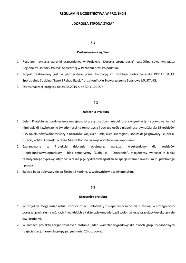 REGULAMIN UCZESTNICTWA W PROJEKCIE „DOROSŁA STRONA ŻYCIA” §1 Postanowienia ogólne 1. Regulamin określa warunki uczestnictwa w Projekcie „Dorosła strona życia”, współfinansowanym przez Regionalny Ośrodek Polityki Społecznej w Poznaniu oraz 1% podatku. 2. Projekt realizowany jest w partnerstwie przez: Fundację im. Doktora Piotra Janaszka PODAJ DALEJ, Spółdzielnię Socjalną "Sport i Rehabilitacja" oraz Konioskie Stowarzyszenie Sportowe MUSTANG. 3. Okres realizacji projektu od 24.08.2015 r. do 30.11.2015 r. §2 Założenia Projektu 1. Celem Projektu jest podniesienie umiejętności pracy z osobami niepełnosprawnymi (w tym sprawowania nad nimi opieki) i zwiększenie świadomości na temat życia i potrzeb osób z niepełnosprawnością dla 15 rodziców i 15 opiekunów/wolontariuszy z obszarów wiejskich i miejskich subregionu konioskiego (powiaty: słupecki, turecki, kolski i konioski) a także Miasta Konina, w województwie wielkopolskim. 2. Zaplanowane w Projekcie działania obejmują: warsztat weekendowy dla rodziców i opiekunów/wolontariuszy - blok tematyczny "Ciało, Ja i Otoczenie", stacjonarny warsztat z bloku tematycznego "Sprawy intymne" a także pięd cyklicznych spotkao ze specjalistami z zakresu m.in. psychologii i prawa. 3. Zajęcia będą odbywały się w: Ślesinie i Koninie, w województwie wielkopolskim. §3 Uczestnicy projektu 1. W projekcie mogą wziąd udział: rodzice dzieci i młodzieży z niepełnosprawnością ruchową, w szczególności poruszających się na wózkach inwalidzkich a także opiekunowie bądź wolontariusze pracujący/opiekujący się ww. osobami. 2. W ramach projektu zorganizowanych zostanie jeden warsztat wyjazdowy dla dwóch grup 15-osobowych i zajęcia stacjonarne dla grupy przynajmniej 20-osobowej. §4 Zasady rekrutacji 1. Rekrutacja odbywad się będzie w dniach: 07.09.2015 – 14.09.2015 rok. 2. Do rekrutacji może przystąpid każda osoba spełniająca wymagania z §3 pkt. 1. niniejszego regulaminu. 3. Rekrutacja może zakooczyd się wcześniej niż wymieniony w §4 pkt. 2 termin, jeżeli zostanie zebranych dwukrotnie więcej zgłoszeo niż jest miejsc. 4. W przypadku wcześniejszego zamknięcia rekrutacji, informacja zostanie podana na stronie Fundacji im. Doktora Piotra Janaszka PODAJ DALEJ: http://podajdalej.org.pl/. 5. O zakwalifikowaniu w projekcie będzie decydowad kolejnośd zgłoszeo, opisana motywacja do wzięcia udziału w warsztatach oraz wiek dziecka (wyżej punktowane będą osoby opiekujące się osobami pełnoletnimi z niepełnosprawnością). 6. Z nadesłanych zgłoszeo Komisja Rekrutacyjna (w składzie trzy-osobowym, w tym Koordynator Projektu) wybierze po 15 zgłoszeo w każdej grupie uczestników zakwalifikowanych do udziału w projekcie – Lista Główna. 7. Osoby zakwalifikowane do projektu zostaną poinformowane mailowo/telefonicznie o pozytywnym wyniku rekrutacji w przeciągu 7 dni od zakooczenia rekrutacji. 8. Osoby, które nie znajdą się na Liście Głównej, zostaną umieszczone na liście rezerwowej. W przypadku, gdy zakwalifikowany uczestnik zgłosi niemożnośd przyjazdu, zostanie poinformowana pierwsza osoba z listy rezerwowej. §5 Uprawnienia i obowiązki uczestników Projektu 1. Każdy uczestników Projektu: a) weźmie udział w zajęciach oferowanych w Projekcie, b) otrzyma materiały warsztatowe, c) otrzyma certyfikat uczestnictwa w warsztatach Projektu, d) otrzyma nocleg oraz wyżywienie w czasie warsztatu wyjazdowego a także poczęstunek w trakcie warsztatów stacjonarnych. 2. Każdy uczestnik Projektu ma obowiązek: a) złożyd niezbędne dokumenty potwierdzające uczestnictwo w Projekcie, b) uczestniczyd w 100% godzin na warsztatach, d) wypełnid ankiety oceniające oraz inne monitoringowi, kontroli i ewaluacji Projektu. 3. Udział uczestników Projektu w warsztatach jest nieodpłatny. dokumenty służące bezpośrednio 4. Każdy uczestnik musi we własnym zakresie dojechad i wrócid z warsztatów. §6 Zasady rezygnacji z udziału w Projekcie 1. Uczestnik Projektu ma prawo do rezygnacji z udziału w Projekcie, gdy rezygnacja zostanie zgłoszona koordynatorowi Projektu najpóźniej na 3 dni przed rozpoczęciem warsztatów telefonicznie i/lub na piśmie (e-mail). 2. W przypadku dostarczenia rezygnacji opisanej w §6 pkt. 1 po terminie, uczestnik zostanie obciążony kosztami warsztatów w wysokości 1 000 zł. 3. W przypadku rezygnacji uczestnika warsztatów, jego miejsce zajmuje pierwsza osoba z listy rezerwowej. 4. Realizator Projektu zastrzega sobie prawo skreślenia uczestników Projektu z listy osób biorących udział w warsztatach realizowanych w ramach Projektu w przypadku niedopełnienia formalności. §7 Zasady monitoringu i kontroli 1. Uczestnicy Projektu podlegają procesowi monitoringu i ewaluacji. 2. Uczestnik Projektu zobowiązany jest do udzielania informacji na temat udziału w Projekcie osobom zaangażowanym w realizację, jak również osobom i instytucjom zewnętrznym upoważnionym do przeprowadzania ewaluacji Projektu. §8 Postanowienia końcowe 1. Uczestnik Projektu zobowiązany jest do przestrzegania i stosowania postanowieo niniejszego regulaminu. 2. Kwestie nie uregulowane w niniejszym regulaminie rozstrzygane są przez koordynatora Projektu i Zespół składający się z przedstawiciela wszystkich Partnerów w Projekcie. 3. Realizatorzy Projektu zastrzegają sobie prawo zmiany niniejszego regulaminu.