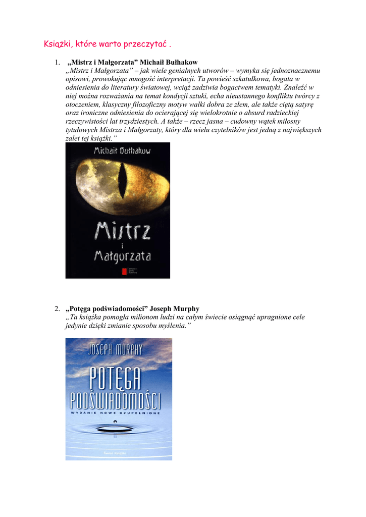 Książki, które warto przeczytać . 1. „Mistrz i Małgorzata” Michaił Bułhakow „Mistrz i Małgorzata” – jak wiele genialnych utworów – wymyka się jednoznacznemu opisowi, prowokując mnogość interpretacji. Ta powieść szkatułkowa, bogata w odniesienia do literatury światowej, wciąż zadziwia bogactwem tematyki. Znaleźć w niej można rozważania na temat kondycji sztuki, echa nieustannego konfliktu twórcy z otoczeniem, klasyczny filozoficzny motyw walki dobra ze złem, ale także ciętą satyrę oraz ironiczne odniesienia do ocierającej się wielokrotnie o absurd radzieckiej rzeczywistości lat trzydziestych. A także – rzecz jasna – cudowny wątek miłosny tytułowych Mistrza i Małgorzaty, który dla wielu czytelników jest jedną z największych zalet tej książki.” 2. „Potęga podświadomości” Joseph Murphy „Ta książka pomogła milionom ludzi na całym świecie osiągnąć upragnione cele jedynie dzięki zmianie sposobu myślenia.” 3. „Bóg nigdy nie mruga” Brett Regina „Książka, którą trzymasz w ręce, stanie się bliska każdemu, kto kiedykolwiek znalazł się na życiowym zakręcie oraz wszystkim szukającym inspiracji. Niech każda z pięćdziesięciu lekcji będzie manifestem – jak bohaterka jednego z esejów, pewna sportowa czapka z prostym hasłem: „Życie jest dobre”. Bo takie jest. Naprawdę.” 4. „Pomóc Jani” Schofield Michael „Kilkuletnia Jani wydaje się być zwyczajnym dzieckiem, które może trochę zbyt często fantazjuje. Z czasem rodzice odkrywają jednak, że fantazje dziewczynki nie są tylko wytworem dziecięcej wyobraźni, a objawem poważnej choroby. Jani staje się niebezpieczna dla siebie i swojego młodszego braciszka.” 5. „Lodowaty grób” Charlaine Harris „Miałam wtedy 15 lat. Poraził mnie piorun, który wpadł przez okno naszego wynajmowanego mieszkania. Od tamtej chwili potrafię odnajdywać zwłoki i czytać w głowach umarłych. Moje życie – prywatne śledztwa, współpraca z policją i jako takie pieniądze. To zlecenie było inne. Nigdy przedtem nie szukałam ofiar seryjnego morderstwa. Ciała znalazłam dość szybko – tyle, że to był dopiero początek piekła.” 6. „Weronika postanawia umrzeć” Paulo Coelho „Umiera się na wiele sposobów: z miłości, z tęsknoty, z rozpaczy, ze zmęczenia, z nudów, ze strachu… Umiera się nie dlatego, by przestać żyć, lecz po to, by żyć inaczej. Kiedy świat zacieśnia się do rozmiarów pułapki, śmierć zdaje się być jedynym ratunkiem, ostatnią kartą, na którą stawia się własne życie. Weronika postanawia umrzeć bez wyraźnego powodu, bez żalu i bez patosu. Może dlatego, że gdy szukała łatwych rozwiązań, jej życie stało się mdłe, jak potrawa bez przypraw, pozbawione ziarna szaleństwa. A gdzie szukać szaleństwa, jeśli nie w domu wariatów, pośród tych, którzy obdarzeni nim zostali w nadmiarze? Weronika uczy się na nowo życia, poznaje siebie samą, zmartwychwstaje. Weronika chce żyć inaczej.” 7. „Milion małych kawałków” James Frey „James budzi się na pokładzie samolotu z wybitymi zębami, złamanym nosem i rozciętym policzkiem. Nie wie, dokąd leci ani co się z nim działo przez ostatnie dwa tygodnie. Ma dwadzieścia trzy lata, od dziesięciu lat jest uzależniony od alkoholu, a od trzech – od narkotyków. Kiedy zgłasza się na odwyk do najstarszego ośrodka w Stanach, chlubiącego się rekordowo wysoką skutecznością siedemnastu procent wyleczonych, lekarze nie wiedzą, jakim cudem wciąż żyje.” 8. „Mój przyjaciel Leonard” James Frey „‘‘Czasem udaję, że Lilly jest ze mną. Zwracam się do pustego krzesła naprzeciwko mnie, obejmuję ramionami nicość i mówię, że ją kocham. Gdy wychodzę z domu, mówię jej, że niedługo wrócę. Po długim dniu mówię jej, że jestem zmęczony i chcę iść do łóżka. Nawet bez niej mam wszystko, czego potrzebuję, własny mały dom, dużego śmiesznego psa, uczciwie zarobione pieniądze, mam czas, czas tylko dla siebie, cenny czas tylko dla siebie, kiedy mogę robić to, co chcę. Mam proste rzeczy, proste życie, wszystko, czego potrzebuję.” 9. „Cudowny chłopiec” David Sheff „Zanim Nic Sheff uzależnił się od krystalicznej amfetaminy, był wspaniałym chłopakiem, wesołym, dowcipnym, wybitnie uzdolnionym uczniem, sportowcem grającym w szkolnej reprezentacji i największym autorytetem dla młodszego rodzeństwa. Kiedy wpadł w nałóg, stał się cieniem dawnego siebie, wstrząsanym tikiem nerwowym notorycznym kłamcą, który zdolny był okraść swojego ośmioletniego brata i wybrać życie na ulicy.” 10. „Dziewczyna o siedmiu imionach” Hyangseo Lee „To niebywała opowieść pozwalająca poznać życie pod jedną z najbardziej bezwzględnych i tajemniczych dyktatur świata, ale też historia kobiety, która walczy o wolność swojej rodziny.”