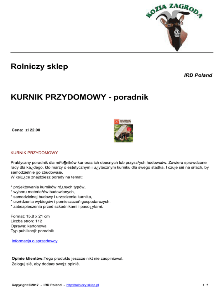 Rolniczy sklep IRD Poland KURNIK PRZYDOMOWY - poradnik Cena: zl 22.00 KURNIK PRZYDOMOWY Praktyczny poradnik dla mi³o¶ników kur oraz ich obecnych lub przysz³ych hodowców. Zawiera sprawdzone rady dla ka¿dego, kto marzy o estetycznym i u¿ytecznym kurniku dla swego stadka. I czuje siê na si³ach, by samodzielnie go zbudowaæ. W ksi±¿ce znajdziesz porady na temat: * projektowania kurników ró¿nych typów, * wyboru materia³ów budowlanych, * samodzielnej budowy i urz±dzenia kurnika, * urz±dzenia wybiegów i pomieszczeñ gospodarczych, * zabezpieczenia przed szkodnikami i paso¿ytami. Format: 15,8 x 21 cm Liczba stron: 112 Oprawa: kartonowa Typ publikacji: poradnik Informacja o sprzedawcy Opinie klientów:Tego produktu jeszcze nikt nie zaopiniowal. Zaloguj siê, aby dodaæ swoj± opiniê. Copyright ©2017 - IRD Poland - http://rolniczy.sklep.pl 1 1