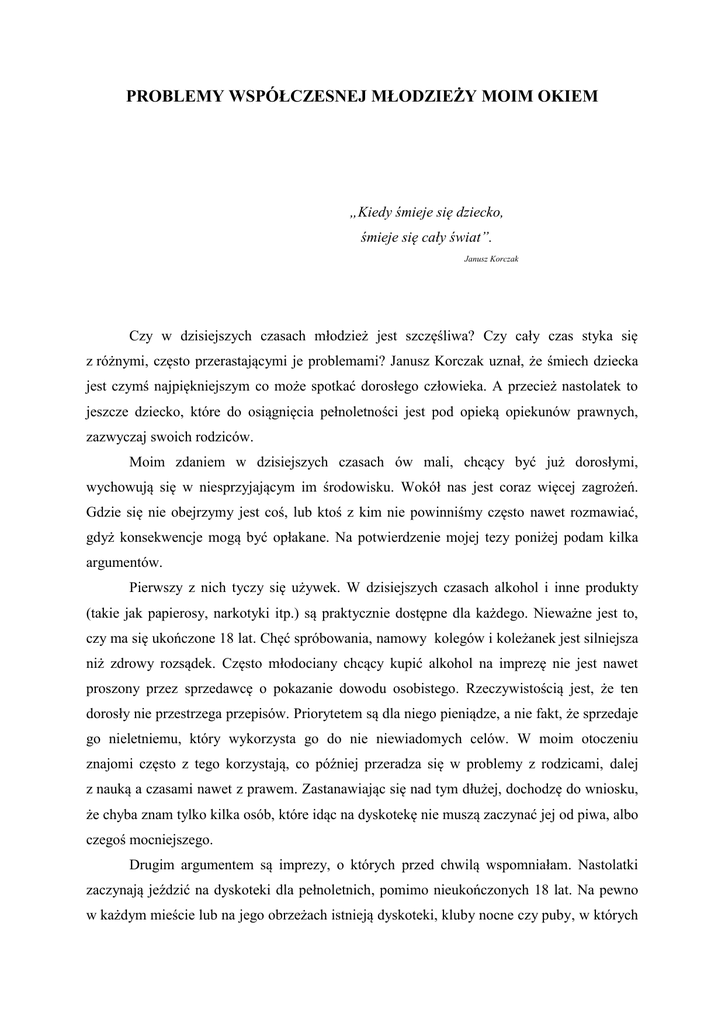 PROBLEMY WSPÓŁCZESNEJ MŁODZIEŻY MOIM OKIEM „Kiedy śmieje się dziecko, śmieje się cały świat”. Janusz Korczak Czy w dzisiejszych czasach młodzież jest szczęśliwa? Czy cały czas styka się z różnymi, często przerastającymi je problemami? Janusz Korczak uznał, że śmiech dziecka jest czymś najpiękniejszym co może spotkać dorosłego człowieka. A przecież nastolatek to jeszcze dziecko, które do osiągnięcia pełnoletności jest pod opieką opiekunów prawnych, zazwyczaj swoich rodziców. Moim zdaniem w dzisiejszych czasach ów mali, chcący być już dorosłymi, wychowują się w niesprzyjającym im środowisku. Wokół nas jest coraz więcej zagrożeń. Gdzie się nie obejrzymy jest coś, lub ktoś z kim nie powinniśmy często nawet rozmawiać, gdyż konsekwencje mogą być opłakane. Na potwierdzenie mojej tezy poniżej podam kilka argumentów. Pierwszy z nich tyczy się używek. W dzisiejszych czasach alkohol i inne produkty (takie jak papierosy, narkotyki itp.) są praktycznie dostępne dla każdego. Nieważne jest to, czy ma się ukończone 18 lat. Chęć spróbowania, namowy kolegów i koleżanek jest silniejsza niż zdrowy rozsądek. Często młodociany chcący kupić alkohol na imprezę nie jest nawet proszony przez sprzedawcę o pokazanie dowodu osobistego. Rzeczywistością jest, że ten dorosły nie przestrzega przepisów. Priorytetem są dla niego pieniądze, a nie fakt, że sprzedaje go nieletniemu, który wykorzysta go do nie niewiadomych celów. W moim otoczeniu znajomi często z tego korzystają, co później przeradza się w problemy z rodzicami, dalej z nauką a czasami nawet z prawem. Zastanawiając się nad tym dłużej, dochodzę do wniosku, że chyba znam tylko kilka osób, które idąc na dyskotekę nie muszą zaczynać jej od piwa, albo czegoś mocniejszego. Drugim argumentem są imprezy, o których przed chwilą wspomniałam. Nastolatki zaczynają jeździć na dyskoteki dla pełnoletnich, pomimo nieukończonych 18 lat. Na pewno w każdym mieście lub na jego obrzeżach istnieją dyskoteki, kluby nocne czy puby, w których można bawić się do białego rana. Coraz więcej młodzieży z tego korzysta, wybierając się na nocne imprezy, które przeznaczone są tylko dla pełnoletnich. Takie zabawy często kończą się dla nich różnymi problemami, mam tu na myśli choćby bójki, kontakty z niewłaściwymi osobami, a coraz częściej nawet macierzyństwo. Głównym tego problemem, moim zdaniem, jest brak zainteresowania rodziców, którzy w dzisiejszych czasach są zabiegani, zmęczeni pracą i pogonią za pieniędzmi by żyło się lepiej. Uważają, że jeśli kupią własnej pociesze najnowszego iPad’a są wspaniałymi rodzicami. Niestety nie tędy droga. Najbardziej przez to cierpią dzieci, którym nie poświęca się wystarczająco dużej ilości uwagi. Często w zamian woleliby porozmawiać z rodzicami, pośmiać się, lub chociaż spędzić z nimi trochę czasu. Choć bywa i tak, że młodociany ma szczęśliwą i kochającą rodzinę, troszczącą się o niego ale popada w nieodpowiednie towarzystwo, buzują w nim hormony. Zaczynają się kłamstwa, wykręty. Idą na dyskoteki pod przykrywką nocy spędzonej u koleżanki itp. Młodzież chce szybciej dorosnąć. Dziewczyny w wieku 12 lat wykonują ostry make up, noszą krótkie spódniczki, bluzki z głębokimi dekoltami, wysokie obcasy. Po takiej przemianie nie wyglądają już jak dzieci z podstawówki. Jak już wspomniałam konsekwencje mogą być różne od niewinnego flirtu ze starszym od siebie chłopakiem, często dorosłym, niezdającym sobie sprawy z wieku poderwanej dziewczyny, do gwałtów i niechcianego macierzyństwa. Kolejnym argumentem, który może potwierdzić moją tezę jest to, że również w Internecie czeka na nas niebezpieczeństwo. Coraz częściej w sieci poznajemy nowych ludzi. Niektóre takie kontakty mogą mieć zły wpływ na nas i na naszą psychikę. Nie wiemy czy na pewno po drugiej stronie siedzi ktoś w naszym wieku, ktoś kto chce tylko poszerzyć swoje kontakty, czy raczej ma w planach co innego. My często nieświadomi zagrożeń, lub wiedzący, że takie rzeczy mają miejsce, ale przecież „nas to nie dotyczy” rozmawiamy raz, drugi, trzeci… Ludzie to wykorzystują i namawiają nas do niewłaściwych rzeczy. Chcą spotkań w świecie rzeczywistym, działają na naszą ambicję. Często nie zauważamy, że miejsce wyznaczone przez naszego nowego kolegę jest gdzieś na uboczu, miejscu, gdzie jest mało ludzi. Jesteśmy tak zafascynowani randką, że nie zauważamy, że coś jednak jest nie tak. W niektórych przypadkach, podczas realnych spotkań z osobami poznanymi w sieci, dochodzi do popełniania przestępstw. Zemsta, gwałt, pobicie, czasami nawet zabójstwo, to tylko kilka z możliwych. Uważam, że w dzisiejszych czasach wśród nas pojawia się coraz więcej zagrożeń. Te wymienione przeze mnie to jak kropla w morzu. Nie dopuszczajmy do tego, byśmy i my mieli takie problemy. Każdy rodzic powinien starać się pokazać swojemu dziecku taką drogę życia, by omijało te zagrożenia z daleka. Każdy młody powinien dziesięć razy zastanowić się czy warto, zanim coś zrobi. A co jeśli jest już na to za późno? Wsparcie i zrozumienie to najważniejsze dla nieletniego. Nie można spychać go poza margines, każdy popełnia błędy. Problemy dzieci dla dorosłych wydają się błahe, ale przecież każdy był w tym wieku. Każdy miał własne problemy, nie widział poza nimi niczego. To one były dla nas wierzchołkiem góry lodowej. Ile razy chcieliśmy uciec z domu albo i umrzeć wierząc, że cały świat jest przeciwko nam? Jedyne co różniło teraz już dorosłego od dzisiejszej młodzieży to komputeryzacja. Kiedyś w czasie wolnym grało się w piłkę na boisku, teraz gra się w sieci. Pamiętajmy, że uśmiech dziecka jest najpiękniejszą rzeczą jaka może spotkać dorosłego. Dążmy do tego by radość i szc
