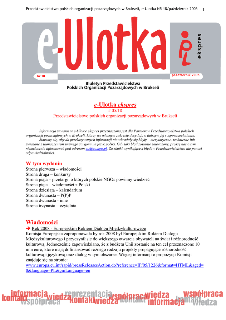 1 ekspres Przedstawicielstwo polskich organizacji pozarządowych w Brukseli, e-Ulotka NR 18/październik 2005 październik 2005 Nr 18 Biuletyn Przedstawicielstwa Polskich Organizacji Pozarządowych w Brukseli e-Ulotka ekspres # 05/18 Przedstawicielstwo polskich organizacji pozarządowych w Brukseli Informacja zawarta w e-Ulotce ekspres przeznaczona jest dla Partnerów Przedstawicielstwa polskich organizacji pozarządowych w Brukseli, którzy we własnym zakresie decydują o dalszym jej rozpowszechnianiu. Staramy się, aby do przekazywanych informacji nie wkradały się błędy – merytoryczne, techniczne lub związane z tłumaczeniem unijnego żargonu na język polski. Gdy taki błąd zostanie zauważony, proszę nas o tym niezwłocznie informować pod adresem [email protected]. Za skutki wynikające z błędów Przedstawicielstwo nie ponosi odpowiedzialności. W tym wydaniu Strona pierwsza – wiadomości Strona druga – konkursy Strona piąta – przetargi, o których polskie NGOs powinny wiedzieć Strona piąta – wiadomości z Polski Strona dziesiąta – kalendarium Strona dwunasta – P(P)P Strona dwunasta - inne Strona trzynasta – czytelnia Wiadomości Rok 2008 - Europejskim Rokiem Dialogu Międzykulturowego Komisja Europejska zaproponowała by rok 2008 był Europejskim Rokiem Dialogu Międzykulturowego i przyczynił się do większego otwarcia obywateli na świat i różnorodność kulturową. Jednocześnie zapowiedziano, że z budżetu Unii zostanie na ten cel przeznaczone 10 mln euro, które mają dofinansować różnego rodzaju projekty propagujące różnorodność kulturową i językową oraz dialog w tym obszarze. Więcej informacji o propozycji Komisji znajduje się na stronie: www.europa.eu.int/rapid/pressReleasesAction.do?reference=IP/05/1226&format=HTML&aged= 0&language=PL&guiLanguage=en Przedstawicielstwo polskich organizacji pozarządowych w Brukseli, e-Ulotka NR 18/październik 2005 2 Przygotowania Polski do nowego okresu programowania 2007-2013 Rząd przyjął "Informację nt. systemu, zakresu i rodzaju dokumentów negocjowanych z organami Unii Europejskiej mających wpływ na realizację Narodowego Planu Rozwoju (NPR) 20072013." Przy tej okazji potwierdzono, że Polska będzie dążyć do najszybszego uzgodnienia budżetu UE na lata 2007-13, a punktem wyjścia do dalszych negocjacji powinien być kompromis przedstawiony w Luksemburgu. Ministrowie podkreślili też, że realizacja NPR-u na lata 20072013 zależy od decyzji przyszłego rządu oraz od wyników negocjacji z Komisją Europejską oraz pozostałymi państwami członkowskimi. Jak napisano w komunikacie wydanym po zakończeniu posiedzenia Rady Ministrów "Konieczne jest też zapewnienie zgodności proponowanych kierunków działań w ramach funduszy strukturalnych w Polsce z kierunkami interwencji, które będą finansowane poza funduszami strukturalnymi (np. rozwój obszarów wiejskich, Schengen, 7 Program ramowy, Program na rzecz innowacyjności i wzrostu)". Więcej informacji o stanowisku rządu znajduje się na stronie: www.kprm.gov.pl/441_14671.htm Poparcie dla członkostwa Turcji w UE – badanie Eurostatu „Nowe" państwa członkowskie bardziej popierają przyszłe członkostwo Turcji niż obywatele „starej Unii”- wynika z badania Eurobarometru. Badanie przeprowadzono w maju-czerwcu 2005 r. w 25 państwach członkowskich, dwóch państwach akcesyjnych (Bułgarii i Rumunii), dwóch państwach kandydujących (Chorwacji i Turcji) oraz na terytorium Cypru Północnego. Wyniki pokazują, że ponad połowa obywateli UE jest przeciwna akcesji Turcji. Z ankiety wynika, że jedynie w trzech krajach ponad 50% obywateli popiera członkostwo Turcji w UE — w Polsce (54%), Słowenii (53%) i na Węgrzech (51%). Turcja jest krajem, którego członkostwo w UE ma najmniejsze poparcie. Obywatele nowych państw członkowskich bardziej popierają przystąpienie Turcji do Wspólnoty (48%), niż obywatele UE-15 (32%). Najczęściej wymieniane powody sprzeciwu wobec akcesji Turcji są takie same w nowych i starych państwach członkowskich. Turcja jest za duża, zbyt biedna i nie jest częścią Europy ze względów religijnych (98% populacji to muzułmanie). Co więcej, dziedzictwo kulturowe turcji różni się od przede wszystkim chrześcijańskiej UE. Więcej informacji znajduje się na stronie: www.rzeczpospolita.pl/serwis_ue/news/news_051003.html Konkursy Wsparcie przemian w Tadżykistanie Do 17 października 2005 r. Delegacja Komisji Europejskiej w Kazachstanie przyjmuje wnioski do programu Tacis Bistro. Ogólnym celem programu jest wspieranie procesu przemian w kierunku społeczeństwa demokratycznego i gospodarki rynkowej w Tadżykistanie. Obszarami współpracy są: wsparcie reform instytucjonalnych, prawnych i administracyjnych, rozwój infrastruktury, społeczne konsekwencje przemian. Przewidziana kwota wsparcia dla jednego projektu nie może przekroczyć 200 tys. euro. Więcej informacji znajduje się na stronie: www.delkaz.cec.eu.int/index.php?link_to=project_lists&lang=en „Return” – działania przygotowawcze w zarządzaniu powrotami nielegalnych imigrantów Do 31 października Dyrekcja Generalna Wolność Bezpieczeństwo i Sprawiedliwość Komisji Europejskiej przyjmuje wnioski o dofinansowanie działań w ramach programu „Return”. Program ten jest ważnym składnikiem polityki imigracyjnej i azylowej oraz zwalczania nielegalnej imigracji. Przedstawicielstwo polskich organizacji pozarządowych w Brukseli, e-Ulotka NR 18/październik 2005 3 Celem działań przygotowawczych jest wspieranie państw członkowskich w zarządzaniu powrotem imigrantów we wszystkich wymiarach. Program ma być zachętą dla współpracy między państwami UE, a także współpracy z krajami powrotu. „Return” ma charakter międzynarodowy i włącza więcej niż jedną organizację z różnych krajów, tak jak i partnerów z krajów powrotu. Grupami docelowymi są osoby z wszystkich krajów spoza UE, które niel