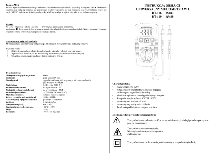 instrukcja obsługi uniwersalny multimetr 3 w 1 dt-116 #5487 dt