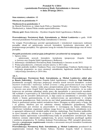 Protokół Nr 1/2014 z posiedzenia Powiatowej Rady Zatrudnienia w Jaworze w dniu 20 lutego 2014 r. Stan statutowy członków: 12 Obecnych na posiedzeniu: 9 Nieobecnych na posiedzeniu: 3 (p. Henryk Pawłowicz, p. Adam Jacek Pilch, p. Stanisław Witek) Nieobecność p. Adama Pilcha została usprawiedliwiona. Obecny gość: Beata Zalewska – Dyrektor Zespołu Szkół Agrobiznesu z Bolkowa Przewodniczący Powiatowej Rady Zatrudnienia, p. Michał Lenkiewicz o godz. 10.00 otworzył posiedzenie Powiatowej Rady Zatrudnienia w Jaworze. Na wstępie Przewodniczący powitał zgromadzonych i wnioskował rozpoczęcie realizacji porządku obrad od opiniowania nowych kierunków kształcenia (pierwotnie pkt 4 proponowanego porządku). Nie zgłoszono uwag do wniosku Przewodniczącego oraz do treści porządku. Porządek posiedzenia został przyjęty jednogłośnie i przedstawiał się następująco: 1. Sprawy różne: – opiniowanie nowych kierunków kształcenia (propozycje Zespołu Szkół w Jaworze oraz Zespołu Szkół Agrobiznesu z Bolkowa). 2. Informacja z działalności Powiatowej Rady Zatrudnienia w Jaworze za rok 2013. 3. Wykaz pracodawców, z którymi zawarto umowy w 2013 roku. 4. Projekt podziału środków Funduszu Pracy oraz Europejskiego Funduszu Społecznego na realizację programów na rzecz promocji zatrudnienia, łagodzenia skutków bezrobocia i aktywizację zawodową w 2014 roku. Ad. 1. Przewodniczący Powiatowej Rady Zatrudnienia, p. Michał Lenkiewicz oddał głos p. Beacie Zalewskiej – Dyrektor Zespołu Szkół Agrobiznesu z Bolkowa. Pani Zalewska przedstawiła szczegóły dotyczące propozycji otwarcia trzech nowych kierunków: technik inżynierii środowiska i melioracji, technik żywienia i usług gastronomicznych oraz technik organizacji reklamy. Analizy rynku pracy przeprowadzone przez Powiatowy Urzędu Pracy w Jaworze oraz przez Zespół Szkół Agrobiznesu doprowadziły do wniosków, że na rynku krajowym nie powinno zabraknąć miejsc pracy dla specjalistów w powyższych zawodach. Jak wynikało z wypowiedzi p. B. Zalewskiej technik inżynierii środowiska i melioracji często zaliczany jest do zawodów deficytowych, co daje szanse na zatrudnienie w zawodzie. Jeśli chodzi o branżę gastronomiczną, to nie zaobserwowano jej spowolnienia w związku z kryzysem gospodarczym. Stale rozwija się sieć lokali gastronomicznych szybkiej obsługi. Pracę w gastronomii można znaleźć stosunkowo łatwo. Dostępne są oferty pracy w kraju, jak i za granicą. Możliwe jest też założenie własnej działalności gospodarczej. Duże zapotrzebowanie jest również na pracowników w rozwijającej się branży reklamowej. Absolwenci technikum organizacji reklamy mogą liczyć na znalezienie zatrudnienia m.in. w agencjach reklamowych, działach public relations, marketingu. Pani Dyrektor podkreśliła, że nowe kierunki są zbliżone do wiodących w Zespole Szkół Agrobiznesu, dzięki czemu możliwe będzie zapewnienie wykwalifikowanej kadry do przedmiotów zawodowych. Baza lokalowa zostanie odpowiednio zaadaptowana, by proces kształcenia przebiegał zgodnie z podstawą programową. Po krótkiej dyskusji Przewodniczący PRZ zarządził głosowanie. Decyzja o pozytywnym zaopiniowaniu wniosku o utworzenie nowych kierunków kształcenia zapadła jednogłośnie. Przewodniczący Powiatowej Rady Zatrudnienia, p. Michał Lenkiewicz przedstawił do zaopiniowania wniosek Pani Doroty Subocz, Dyrektor Zespołu Szkół w Jaworze, o utworzenie od 1 września 2014 r. nowego kierunku kształcenia w Zespole w zawodzie technik usług kosmetycznych. Według analizy Powiatowego Urzędu Pracy w Jaworze zawód ten można zaliczyć do przyszłościowych, ponieważ wzrasta zapotrzebowanie na usługi kosmetyczne. Absolwenci tego kierunku będą mogli szukać zatrudnienia w salonach kosmetycznych, odnowy biologicznej, SPA, czy założyć własną działalność gospodarczą dzięki dofinansowaniu z Urzędu Pracy. Decyzja o pozytywnym zaopiniowaniu nowego kierunku kształcenia zapadła jednogłośnie. Ad. 2. Przewodniczący Powiatowej Rady Zatrudnienia, p. Michał Lenkiewicz przeszedł do kolejnego punktu posiedzenia – Informacji z działalności PRZ, która w formie pisemnej została przekazana wszystkim członkom. Informacja przedstawia główne sprawy, którymi w 2013 roku zajmowała się PRZ. W związku z brakiem pytań i uwag Informacja została przyjęta jednogłośnie. Ad. 3. Kolejnym punktem obrad było omówienie Wykazu pracodawców, z którymi zawarto umowy w 2013 roku na zorganizowanie stażu, prac interwencyjnych, robót publicznych i umowy o refundację kosztów wyposażenia lub doposażenia stanowiska pracy. Podsumowania informacji zawartych w Wykazie dokonała p. Katarzyna Piwczyńska – Pisula, Kierownik Centrum Aktywizacji Zawodowej. Z wypowiedzi p. Kierownik wynikało, że w 2013 roku Powiatowy Urząd Pracy wspierał podmioty gospodarcze środkami finansowymi z Funduszu Pracy oraz Europejskiego Funduszu Społecznego. Wsparcie otrzymały łącznie 302 podmioty gospodarcze. Środki finansowe na zorganizowanie staży w miejscu pracy dostało 245 podmiotów, na wyposażenie lub doposażenie stanowiska pracy – 38 podmiotów, na prace interwencyjne – 15, a na roboty publiczne – 4 podmioty. Na zgłoszone stanowiska pracy pracownicy PUP skierowali 143 osoby bezrobotne, a na staż 481 osób. W ramach udzielonego wsparcia wydatkowano kwotę prawie 1,5 mln zł z EFS oraz prawie 3,5 mln zł z FP. W krótkiej dyskusji członkowie PRZ poruszyli kwestię staży w miejscu pracy. Ad. 4. Kolejnym punktem obrad było omówienie projektu podziału środków Funduszu Pracy oraz Europejskiego Funduszu Społecznego na realizację programów na rzecz promocji zatrudnienia, łagodzenia skutków bezrobocia i aktywizację zawodową w 2014 roku. Powiatowy Urząd Pracy w Jaworze dysponuje kwotą 2 168,5 tys. zł z Funduszu Pracy. W ramach tej kwoty planowane jest zaktywizowanie 764 osób bezrobotnych. Powiatowy