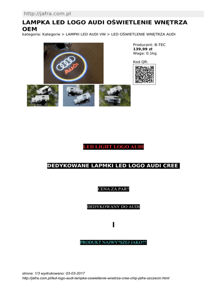 http://jafra.com.pl LAMPKA LED LOGO AUDI OŚWIETLENIE WNĘTRZA OEM kategoria: Kategorie > LAMPKI LED AUDI VW > LED OŚWIETLENIE WNĘTRZA AUDI Producent: B-TEC 139,99 zł Waga: 0.1kg Kod QR: LED LIGHT LOGO AUDI DEDYKOWANE LAPMKI LED LOGO AUDI CREE CENA ZA PAR? DEDYKOWANY DO AUDI PRODUKT NAJWY?SZEJ JAKO?? strona: 1/3 wydrukowano: 03-03-2017 http://jafra.com.pl/led-logo-audi-lampka-oswietlenie-wnetrza-cree-chip-jafra-szczecin.html SPECYFIKACJA TECHNICZNA LED SMD: Najw. jako?? produktu modu? LED do instalacji wewn?trz samochodu Wspó?praca z komp: nie pokazuje b??dów na komputerze Temp. barwy ?wiat?a: bia?y - 5000K - 6000K Zasilanie: 12V DC Wy?wietlane LOGO: AUDI Czas pracy LED: do 50000 godzin Technologia: LED CREE 3535 High Power Ilo?? LED: 1 szt CREE Zastosowanie AUDI: A1 A3 / S3 A4 / S4 / RS4 A5 / S5 A6 / S6 / RS6 A7 / S7 A8 / S8 Q3 / Q5 / Q7 TT Zastosowanie ogólne: o?wietlenie wn?trza, pod drzwi, pod nogi, baga?nik, schowek Monta?: dok?adny zamiennik oryginalnych lampek o?wietlenia wn?trza AUDI Gwarancja: 12 m-cy gwarancji, gwarancja wystawiana i rozpatrywana przez nasz? firm? w Szczecinie wymiary oryginalnych lampek wn?trza AUDI d?ug. ca?kowita: 36mm, ?r. projektora 21.90mm, ?r. monta?owa 19.40mm Wymiary: Oferowany Towar jest Nowy, Fabrycznie Zapakowany !!! strona: 2/3 wydrukowano: 03-03-2017 http://jafra.com.pl/led-logo-audi-lampka-oswietlenie-wnetrza-cree-chip-jafra-szczecin.html strona: 3/3 wydrukowano: 03-03-2017 http://jafra.com.pl/led-logo-audi-lampka-oswietlenie-wnetrza-cree-chip-jafra-szczecin.html