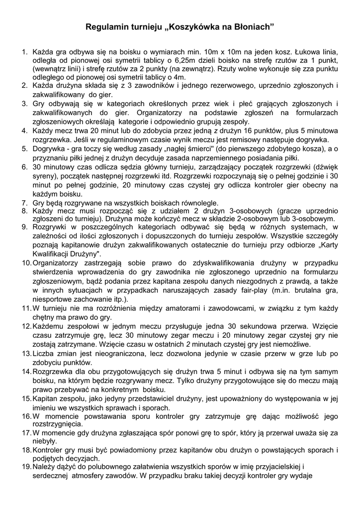 Regulamin turnieju „Koszykówka na Błoniach” 1. Każda gra odbywa się na boisku o wymiarach min. 10m x 10m na jeden kosz. Łukowa Iinia, odległa od pionowej osi symetrii tablicy o 6,25m dzieli boisko na strefę rzutów za 1 punkt, (wewnątrz linii) i strefę rzutów za 2 punkty (na zewnątrz). Rzuty wolne wykonuje się zza punktu odległego od pionowej osi symetrii tablicy o 4m. 2. Każda drużyna składa się z 3 zawodników i jednego rezerwowego, uprzednio zgłoszonych i zakwalifikowany do gier. 3. Gry odbywają się w kategoriach określonych przez wiek i płeć grających zgłoszonych i zakwalifikowanych do gier. Organizatorzy na podstawie zgłoszeń na formularzach zgłoszeniowych określają kategorie i odpowiednio grupują zespoły. 4. Każdy mecz trwa 20 minut lub do zdobycia przez jedną z drużyn 16 punktów, plus 5 minutowa rozgrzewka. Jeśli w regulaminowym czasie wynik meczu jest remisowy następuje dogrywka. 5. Dogrywka - gra toczy się według zasady „nagłej śmierci'' (do pierwszego zdobytego kosza), a o przyznaniu piłki jednej z drużyn decyduje zasada naprzemiennego posiadania piłki. 6. 30 minutowy czas odlicza sędzia główny turnieju, zarządzający początek rozgrzewki (dźwięk syreny), początek następnej rozgrzewki itd. Rozgrzewki rozpoczynają się o pełnej godzinie i 30 minut po pełnej godzinie, 20 minutowy czas czystej gry odlicza kontroler gier obecny na każdym boisku. 7. Gry będą rozgrywane na wszystkich boiskach równolegle. 8. Każdy mecz musi rozpocząć się z udziałem 2 drużyn 3-osobowych (gracze uprzednio zgłoszeni do turnieju). Drużyna może kończyć mecz w składzie 2-osobowym lub 3-osobowym. 9. Rozgrywki w poszczególnych kategoriach odbywać się będą w różnych systemach, w zależności od ilości zgłoszonych i dopuszczonych do turnieju zespołów. Wszystkie szczegóły poznają kapitanowie drużyn zakwalifikowanych ostatecznie do turnieju przy odbiorze „Karty Kwalifikacji Drużyny". 10. Organizatorzy zastrzegają sobie prawo do zdyskwalifikowania drużyny w przypadku stwierdzenia wprowadzenia do gry zawodnika nie zgłoszonego uprzednio na formularzu zgłoszeniowym, bądź podania przez kapitana zespołu danych niezgodnych z prawdą, a także w innych sytuacjach w przypadkach naruszających zasady fair-play (m.in. brutalna gra, niesportowe zachowanie itp.). 11. W turnieju nie ma rozróżnienia między amatorami i zawodowcami, w związku z tym każdy chętny ma prawo do gry. 12. Każdemu zespołowi w jednym meczu przysługuje jedna 30 sekundowa przerwa. Wzięcie czasu zatrzymuje grę, lecz 30 minutowy zegar meczu i 20 minutowy zegar czystej gry nie zostają zatrzymane. Wzięcie czasu w ostatnich 2 minutach czystej gry jest niemożliwe. 13. Liczba zmian jest nieograniczona, lecz dozwolona jedynie w czasie przerw w grze lub po zdobyciu punktów. 14. Rozgrzewka dla obu przygotowujących się drużyn trwa 5 minut i odbywa się na tym samym boisku, na którym będzie rozgrywany mecz. Tylko drużyny przygotowujące się do meczu mają prawo przebywać na konkretnym boisku. 15. Kapitan zespołu, jako jedyny przedstawiciel drużyny, jest upoważniony do występowania w jej imieniu we wszystkich sprawach i sporach. 16. W momencie powstawania sporu kontroler gry zatrzymuje grę dając możliwość jego rozstrzygnięcia. 17. W momencie gdy drużyna zgłaszająca spór ponowi grę to spór, który ją przerwał uważa się za niebyły. 18. Kontroler gry musi być powiadomiony przez kapitanów obu drużyn o powstających sporach i podjętych decyzjach. 19. Należy dążyć do polubownego załatwienia wszystkich sporów w imię przyjacielskiej i serdecznej atmosfery zawodów. W przypadku braku takiej decyzji kontroler gry wydaje werdykt ostateczny. 20. W przypadku brutalnej, niesportowej i pozbawionej zasad fair-play gry kontroler może podejmować decyzję o faulach niezależnie od grających zawodników. 21. Rozstrzyganie sporów nie powoduje wstrzymania odliczania czasu czystej gry, a werdykt jest zaliczany do ostatecznego wyniku. 22. Rzut monetą decyduje która z drużyn rozpoczyna grę – zawodnicy rozpoczynający ustawiają się na zewnątrz linii 6,25m. 23. Obowiązuje zasada 24 sekund na wykonanie rzutu. Nieoddanie rzutu w ciągu 24 sekund karane będzie utratą piłki na hasło kontrolera gry, w formie słów „dwadzieścia cztery". 24. Niedozwolone jest zdobywanie punktów poprzez wyskok i wkładanie piłki do kosza. 25. Rzut za 2 punkty uznany jest pod warunkiem trzymania obu stóp przez rzucającego wyraźnie poza linią 6,25m. 26. Faule zgłaszane są przez samych zawodników. Złośliwe faule zauważone przez kontrolera gier są karane rzutem wolnym i przyznaniem piłki drużynie przeciwnej. 27. Dwa złośliwe faule tego samego zawodnika powoduje usunięcie tego zawodnika z gry w danym meczu. 28. Po faulach zwykłych następuje przyznanie piłki drużynie poszkodowanej. 29. Wszelkie wznowienia gry, jak i rozpoczęcie gry następuje w sposób jednakowy z końca boiska (po zdobytym koszu, po faulu zwykłym, po aucie, po przejęciu piłki). Jakakolwiek zmiana posiadania piłki w czasie gry musi obowiązkowo powodować wprowadzenie piłki poza linię 6,25m wg zasady z punktu 29. 30. Rozpoczęcie jak i wznowienie gry polega na ustawieniu drużyny, która zdobyła punkt, faulowała lub wyrzuciła piłkę na aut, wewnątrz linii 6,25m i oddaniu piłki drużynie przeciwnej, ustawionej poza linią 6,25m. 31. Wszelkie łamanie zasad gry prowadzi do straty piłki na rzecz drużyny przeciwnej. 32. Brutalność w grze lub złe zachowanie danej drużyny podczas turnieju może doprowadzić do wykluczenia drużyny z turnieju na podstawie decyzji sędziego głównego. 33. Sędzia główny ma prawo do podejmowania decyzji w każdej kwestii wyraźnie nie określonej w niniejszym Regulaminie. Maj 2012