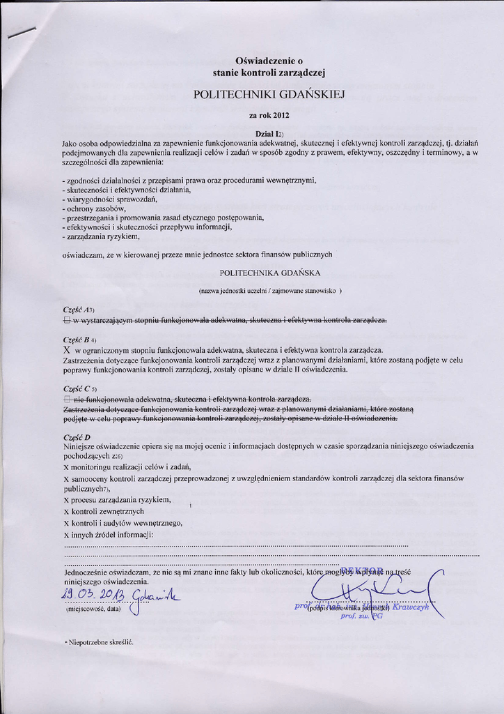 Oświadczenie o stanie kontroli zarządczej PG za rok 2012