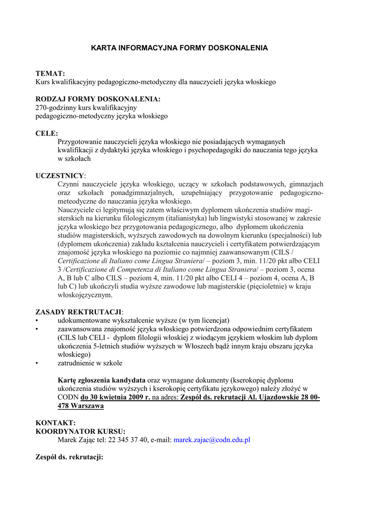 KARTA INFORMACYJNA FORMY DOSKONALENIA TEMAT: Kurs kwalifikacyjny pedagogiczno-metodyczny dla nauczycieli języka włoskiego RODZAJ FORMY DOSKONALENIA: 270-godzinny kurs kwalifikacyjny pedagogiczno-metodyczny języka włoskiego CELE: Przygotowanie nauczycieli języka włoskiego nie posiadających wymaganych kwalifikacji z dydaktyki języka włoskiego i psychopedagogiki do nauczania tego języka w szkołach UCZESTNICY: Czynni nauczyciele języka włoskiego, uczący w szkołach podstawowych, gimnazjach oraz szkołach ponadgimnazjalnych, uzupełniający przygotowanie pedagogicznometeodyczne do nauczania języka włoskiego. Nauczyciele ci legitymują się zatem właściwym dyplomem ukończenia studiów magisterskich na kierunku filologicznym (italianistyka) lub lingwistyki stosowanej w zakresie języka włoskiego bez przygotowania pedagogicznego, albo dyplomem ukończenia studiów magisterskich, wyższych zawodowych na dowolnym kierunku (specjalności) lub (dyplomem ukończenia) zakładu kształcenia nauczycieli i certyfikatem potwierdzającym znajomość języka włoskiego na poziomie co najmniej zaawansowanym (CILS / Certificazione di Italiano come Lingua Straniera/ – poziom 3, min. 11/20 pkt albo CELI 3 /Certificazione di Competenza di Italiano come Lingua Straniera/ – poziom 3, ocena A, B lub C albo CILS – poziom 4, min. 11/20 pkt albo CELI 4 – poziom 4, ocena A, B lub C) lub ukończyli studia wyższe zawodowe lub magisterskie (pięcioletnie) w kraju włoskojęzycznym. ZASADY REKTRUTACJI: • udokumentowane wykształcenie wyższe (w tym licencjat) • zaawansowana znajomość języka włoskiego potwierdzona odpowiednim certyfikatem (CILS lub CELI - dyplom filologii włoskiej z wiodącym językiem włoskim lub dyplom ukończenia 5-letnich studiów wyższych w Włoszech bądź innym kraju obszaru języka włoskiego) • zatrudnienie w szkole Kartę zgłoszenia kandydata oraz wymagane dokumenty (kserokopię dyplomu ukończenia studiów wyższych i kserokopię certyfikatu językowego) należy złożyć w CODN do 30 kwietnia 2009 r. na adres: Zespół ds. rekrutacji Al. Ujazdowskie 28 00478 Warszawa KONTAKT: KOORDYNATOR KURSU: Marek Zając tel: 22 345 37 40, e-mail: [email protected] Zespół ds. rekrutacji: Katarzyna Baldwin tel: 22 345 37 15, e-mail: [email protected] Renata Sobota tel: 22 345 37 65, e-mail: [email protected] TERMIN: Od 6 czerwca 2009 do 31 marca 2010 RAMOWY PLAN ZAJĘĆ (warsztatu, konferencji, seminarium) → należy podać układ godzin, tematykę bądź moduły oraz imię i nazwisko (wykładowcy, organizatora): L.p. Przedmiot Ilość godzin 1. Metodyka języka włoskiego 90 godzin 2. Elementy psychopedagogiki 30 godzin 3. Wiedza z zakresu kultury i historii Włoch 50 godzin 4. Wiedza z zakresu kultury i historii krajów obszaru języka włoskiego 40 godzin 6. Praca indywidualna / pisanie pracy z dydaktyki języka włoskiego oraz z zakresu kultury i historii Hiszpanii i krajów obszaru języka włoskiego 60 godzin Razem 270 godzin Praktyki pedagogiczne języka włoskiego 50 godzin METODY PRACY: KADRA: Pracownicy naukowi wyższych uczelni specjalizujący się w dziedzinach: Dydaktyka języka włoskiego, Wiedza z zakresu kultury i historii Włoch, Psychopedagogika RODZAJ CERTYFIKATU: Świadectwo ukończenia kursu kwalifikacyjnego pedagogiczno-metodycznego języka włoskiego WYMAGANIA DOTYCZĄCE OTRZYMANIA CERTYFIKATU: – uczestnictwo w zajęciach, zaliczenie poszczególnych przedmiotów zgodnie z harmonogramem i wymaganiami, – zdanie egzaminów końcowych, – odbycie praktyki w szkole, – dostarczenie do CODN pełnej dokumentacji odnoszącej się do programu kursu kwalifikacyjnego.
