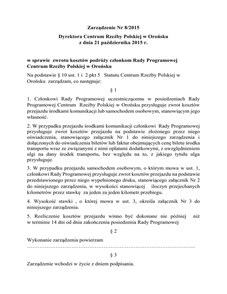 Zarządzenie Nr 8/2015 Dyrektora Centrum Rzeźby Polskiej w Orońsku z dnia 21 października 2015 r. w sprawie zwrotu kosztów podróży członkom Rady Programowej Centrum Rzeźby Polskiej w Orońsku Na podstawie § 10 ust. 1 i 2 pkt 5 Statutu Centrum Rzeźby Polskiej w Orońsku zarządzam, co następuje: §1 1. Członkowi Rady Programowej uczestniczącemu w posiedzeniach Rady Programowej Centrum Rzeźby Polskiej w Orońsku przysługuje zwrot kosztów przejazdu środkami komunikacji lub samochodem osobowym, stanowiącym jego własność. 2. W przypadku przejazdu środkami komunikacji członkowi Rady Programowej przysługuje zwrot kosztów przejazdu na podstawie złożonego przez niego oświadczenia, stanowiącego załącznik Nr 1 do niniejszego zarządzenia i dołączonych do oświadczenia biletów lub faktur obejmujących cenę biletu środka transportu wraz ze związanymi z nimi opłatami dodatkowymi, z uwzględnieniem ulgi na dany środek transportu, bez względu na to, z jakiego tytułu ulga przysługuje. 3. W przypadku przejazdu samochodem osobowym, o którym mowa w ust. 1, członkowi Rady Programowej przysługuje zwrot kosztów przejazdu na podstawie przedstawionego przez niego wypełnionego druku, stanowiącego załącznik Nr 2 do niniejszego zarządzenia, w wysokości stanowiącej iloczyn przejechanych kilometrów przez stawkę za jeden za jeden kilometr przebiegu. 4. Wysokość stawki , o której mowa w ust. 3, określa załącznik Nr 3 do niniejszego zarządzenia. 5. Rozliczenie kosztów przejazdu winno być dokonane nie później w terminie 14 dni od dnia zakończenia posiedzenia Rady Programowej niż §2 Wykonanie zarządzenia powierzam ………………………………………………………………………………….. §3 Zarządzenie wchodzi w życie z dniem podpisania. Załącznik Nr 1 do Zarządzania Nr 8/2015 Dyrektora Centrum Rzeźby Polskiej w Orońsku z dnia 21 października 2015 r. Imię i nazwisko ……………………………… - członek Rady Programowej Centrum Rzeźby Polskiej w Orońsku Miejscowość-data …………………………..……….. Oświadczam, że w celu udziału w obradach Rady Programowej Centrum Rzeźby Polskiej w Orońsku, organizowanych w dniu 24.10.2015 r., ………..……..…….. odbyłem (łam) podróż ………………………… do Centrum Rzeźby Polskiej w Orońsku z miejscowości ……..………..………… do Orońska, natomiast dnia …………………… podróż powrotną z Orońska do ……………..………. 1. Przedkładam bilety ……………………………………………… 2. Bilet powrotny ……………………………………/ przedłożę w terminie 14 dni. Zwrot na konto …………………………….... Podpis: ………………………………………. Załącznik Nr 2 do Zarządzania Nr 8/2015 Dyrektora Centrum Rzeźby Polskiej w Orońsku z dnia 21 października 2015 r. Ewidencja przebiegu pojazdu Na zwi s ko, Imi ę, a dres za mi es zka ni a członka Ra dy Progra mowej uzywa jącego poja zd /wła ś ci ci el a Numer rejestracyjny pojazdu: Pojemność silnika: Ustalona stawka zł/ km Ewidencja przebiegu pojazdu . Podróż związana z udziałem w obradach Rady Programowej CRP w Orońsku Nr Data wyjazdu Opis trasy wyjazdu (skąd-dokąd) Cel wyjazdu 1 2 3 4 Liczba Stawka za Wartość faktycznie 1km (5) x (6) przejechanych przebiegu zł gr kilometrów zł gr 5 6 7 Uwagi 8 Podsumowanie podróży: Miejscowość, data …………………………………………………………………. Podpis …………………………………………… Załącznik Nr 3 do Zarządzania Nr 8 /2015 Dyrektora Centrum Rzeźby Polskiej w Orońsku z dnia 21 października 2015 r. Stawka za 1 km przebiegu pojazdu: Dla samochodu osobowego: - o pojemności skokowej do 900 cm 3 0.2085 zł - o pojemności skokowej powyżej 900 cm 3 0. 3343zł