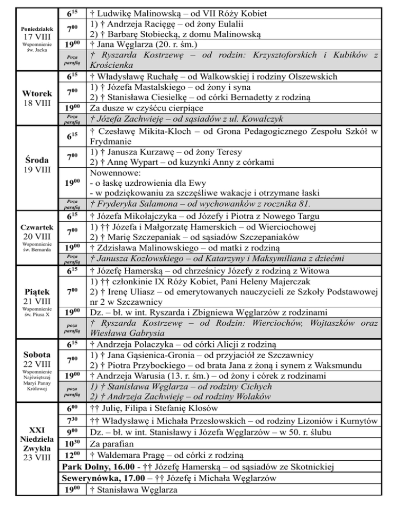 Intencje mszalne od 16.08 do 23.08.2015 r.