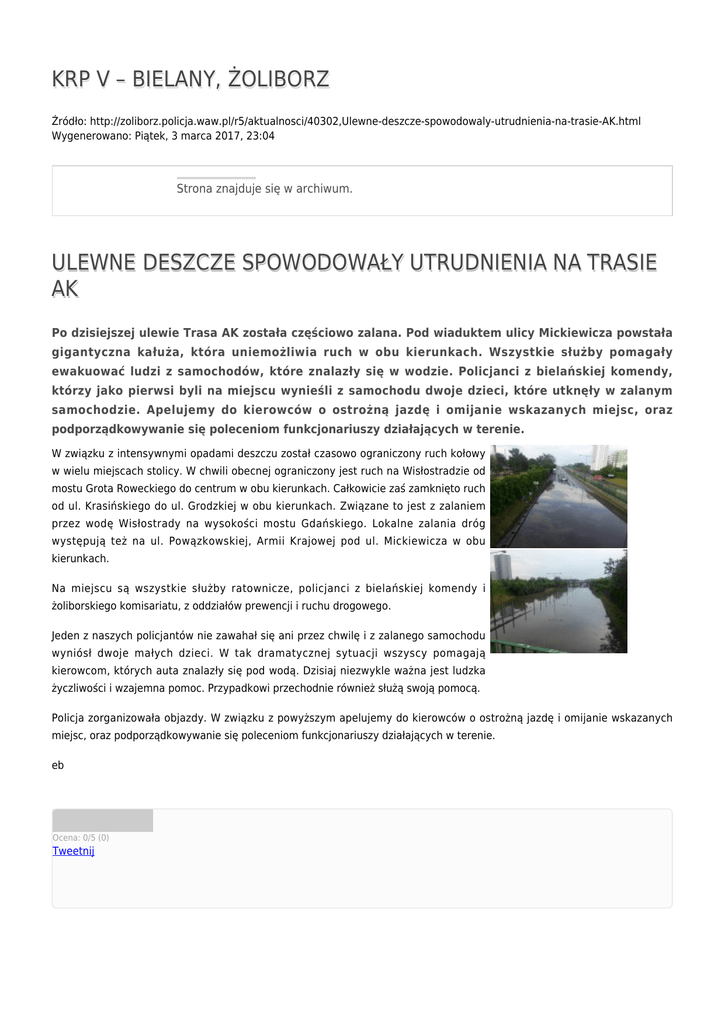 KRP V – BIELANY, ŻOLIBORZ Źródło: http://zoliborz.policja.waw.pl/r5/aktualnosci/40302,Ulewne-deszcze-spowodowaly-utrudnienia-na-trasie-AK.html Wygenerowano: Piątek, 3 marca 2017, 23:04 Strona znajduje się w archiwum. ULEWNE DESZCZE SPOWODOWAŁY UTRUDNIENIA NA TRASIE AK Po dzisiejszej ulewie Trasa AK została częściowo zalana. Pod wiaduktem ulicy Mickiewicza powstała gigantyczna kałuża, która uniemożliwia ruch w obu kierunkach. Wszystkie służby pomagały ewakuować ludzi z samochodów, które znalazły się w wodzie. Policjanci z bielańskiej komendy, którzy jako pierwsi byli na miejscu wynieśli z samochodu dwoje dzieci, które utknęły w zalanym samochodzie. Apelujemy do kierowców o ostrożną jazdę i omijanie wskazanych miejsc, oraz podporządkowywanie się poleceniom funkcjonariuszy działających w terenie. W związku z intensywnymi opadami deszczu został czasowo ograniczony ruch kołowy w wielu miejscach stolicy. W chwili obecnej ograniczony jest ruch na Wisłostradzie od mostu Grota Roweckiego do centrum w obu kierunkach. Całkowicie zaś zamknięto ruch od ul. Krasińskiego do ul. Grodzkiej w obu kierunkach. Związane to jest z zalaniem przez wodę Wisłostrady na wysokości mostu Gdańskiego. Lokalne zalania dróg występują też na ul. Powązkowskiej, Armii Krajowej pod ul. Mickiewicza w obu kierunkach. Na miejscu są wszystkie służby ratownicze, policjanci z bielańskiej komendy i żoliborskiego komisariatu, z oddziałów prewencji i ruchu drogowego. Jeden z naszych policjantów nie zawahał się ani przez chwilę i z zalanego samochodu wyniósł dwoje małych dzieci. W tak dramatycznej sytuacji wszyscy pomagają kierowcom, których auta znalazły się pod wodą. Dzisiaj niezwykle ważna jest ludzka życzliwości i wzajemna pomoc. Przypadkowi przechodnie również służą swoją pomocą. Policja zorganizowała objazdy. W związku z powyższym apelujemy do kierowców o ostrożną jazdę i omijanie wskazanych miejsc, oraz podporządkowywanie się poleceniom funkcjonariuszy działających w terenie. eb Ocena: 0/5 (0) Tweetnij