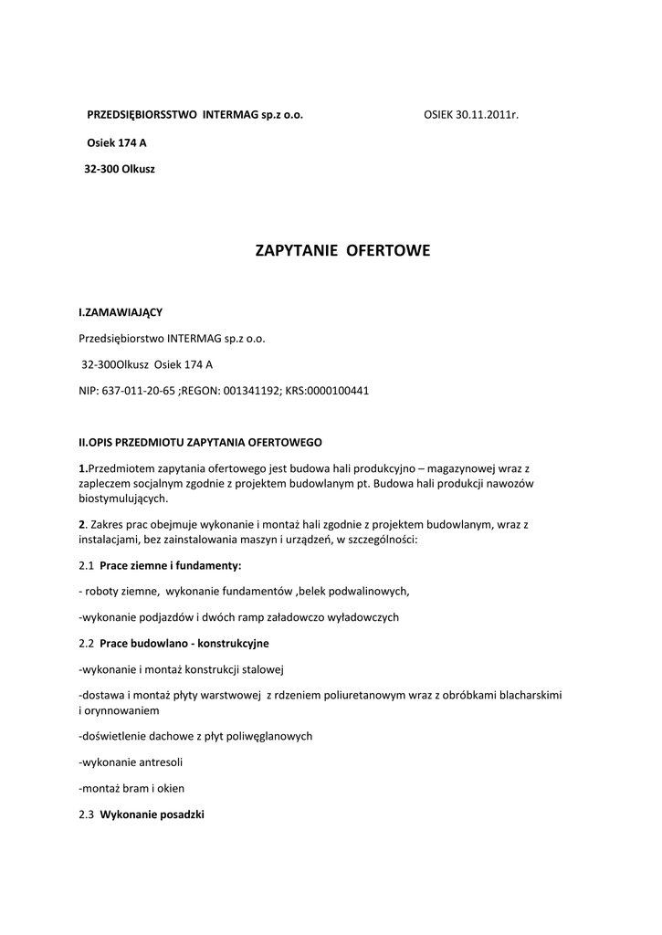 PRZEDSIĘBIORSSTWO INTERMAG sp.z o.o. OSIEK 30.11.2011r. Osiek 174 A 32-300 Olkusz ZAPYTANIE OFERTOWE I.ZAMAWIAJĄCY Przedsiębiorstwo INTERMAG sp.z o.o. 32-300Olkusz Osiek 174 A NIP: 637-011-20-65 ;REGON: 001341192; KRS:0000100441 II.OPIS PRZEDMIOTU ZAPYTANIA OFERTOWEGO 1.Przedmiotem zapytania ofertowego jest budowa hali produkcyjno – magazynowej wraz z zapleczem socjalnym zgodnie z projektem budowlanym pt. Budowa hali produkcji nawozów biostymulujących. 2. Zakres prac obejmuje wykonanie i montaż hali zgodnie z projektem budowlanym, wraz z instalacjami, bez zainstalowania maszyn i urządzeń, w szczególności: 2.1 Prace ziemne i fundamenty: - roboty ziemne, wykonanie fundamentów ,belek podwalinowych, -wykonanie podjazdów i dwóch ramp załadowczo wyładowczych 2.2 Prace budowlano - konstrukcyjne -wykonanie i montaż konstrukcji stalowej -dostawa i montaż płyty warstwowej z rdzeniem poliuretanowym wraz z obróbkami blacharskimi i orynnowaniem -doświetlenie dachowe z płyt poliwęglanowych -wykonanie antresoli -montaż bram i okien 2.3 Wykonanie posadzki -wykonanie podbudowy pod posadzkę oraz posadzki niepylącej zbrojonej drutem ( w wariancie; I -posadzka zatarta - fibrobeton, II- posadzka żywiczna chemoutwardzalna) 2.4 Wykonanie pomieszczeń socjalnych - wykonanie pomieszczeń socjalnych wewnątrz hali wraz z wykończeniem i białym montażem 2.5 Wykonanie instalacji elektrycznej zewnętrznej i wewnętrznej 2.6 Wykonanie projektu i instalacji gazowej zewnętrznej i systemu ogrzewania hali promiennikami i nagrzewnicami gazowymi 2.7 Wykonanie instalacji wodnej i kanalizacyjnej 3. Zamawiający preferuje oferty na kompleksowe wykonanie budowy złożone przez wykonawców prac budowlano – konstrukcyjnych ujętych w p 2.2 . 4. Zamawiający dopuszcza przyjmowanie ofert cząstkowych przez wykonawców specjalizujących się w danej branży i możliwość powierzenia części zamówienia podwykonawcom pod warunkiem ustanowienia kierownika budowy całej inwestycji przez wykonawcę prac budowlano – konstrukcyjnych ujętych w p 2.2 . 5. Zamawiający umożliwia dostęp do dokumentacji technicznej niezbędnej do wykonania oferty (patrz załączniki). Informacji nt. przedmiotowego zadania udziela bezpośrednio dyr. Tadeusz Woszczek i umożliwia do wglądu w siedzibie firmy projekt budowlany. 6.Wykonawca na czas realizacji zadania zabezpieczy własną bazę socjalną III.TERMIN WYKONANIA ZAMÓWIENIA Termin wykonania zamówienia do 30.06.2012r IV.OPIS SPOSOBU PRZYGOTOWANIA OFERT Oferent powinien stworzyć ofertę opatrzoną czytelnym podpisem i pieczątką firmową zawierającą: datę sporządzenia, adres siedziby firmy lub samodzielnego oddziału, adres e-mail do bieżącej korespondencji, nazwisko i numer telefonu osoby wyznaczonej do kontaktu, numer NIP, skan lub kserokopię aktualnego odpisu KRS lub wpisu do ewidencji działalności gospodarczej. V.MIEJSCE ORAZ TERMIN SKŁADANIA OFERT -Oferta powinna być składana za pośrednictwem: poczty elektronicznej na adres [email protected] , [email protected], faksem nr.32 642 70 44, poczty lub osobiście na adres : 32-300 Olkusz Osiek 174 A do dnia 15.01.2012 ( obowiązuje termin odbioru oferty przez zamawiającego). -Oferent może przed upływem terminu składania ofert zmienić lub wycofać swoją ofertę. -Zamawiający może w troku badania oferty żądać wyjaśnień dotyczących treści oferty. -Zapytanie ofertowe zamieszczono na stronie www.intermag.pl VI. OCENA OFERT Zamawiający dokona oceny ofert na podstawie następujących kryteriów Lp. Nazwa Sposób oceny 1 Cena za wykonanie poszczególnych elementów składowych zapytania ofertowego od ptu2.1 do ptu2.7 Kompleksowe wykonanie prac Kierownictwo budowy Najkorzystniejsza cena na poszczególne składowe zapytania ofertowego 2 3 4 Warunki płatności Doświadczenie wykonawcy, referencje, okres rękojmi, wiarygodność ekonomiczna Łączna max ilość punktów Wykonanie zadania inwestycyjnego przez jednego oferenta Przejęcie kierownictwa budowy dla całej inwestycji Najkorzystniejsze warunki z pośród ofert Maksymalna ilość punktów 60 10 10 20 100 VII.INFORMACJE DOTYCZĄCE WYBORU OFERTY Ocena zostanie dokonana do dnia 20.01.2012 a wynikach oferenci zostaną poinformowani za pośrednictwem poczty elektronicznej. W przypadku równorzędnej oceny dwóch lub więcej ofert, Zamawiający dopuszcza przeprowadzenie bezpośredniego przetargu z udziałem zainteresowanych stron. Wybór oferty przez Zamawiającego jest ostateczny i nie podlega odwołaniu. VIII.DODATKOWE INFORMACJE Dodatkowych informacji udziela dyr. Tadeusz Woszczek pod numerem telefonu 606 79 40 97 VIII.ZAŁĄCZNIKI Załączniki w postaci plików PDF będą udostępnione zainteresowanym stronom po wcześniejszym kontakcie z dyr. Tadeuszem Woszczek