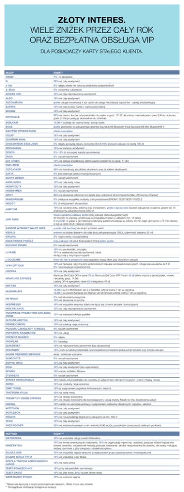 ZŁOTY INTERES. WIELE ZNIŻEK PRZEZ CAŁY ROK ORAZ BEZPŁATNA OBSŁUGA VIP DLA POSIADACZY KARTY STAŁEGO KLIENTA. SKLEP RABAT* @KOM 7% na akcesoria 3i 20% na cały asortyment à Tab 5% rabatu (oferta nie dotyczy produktów przecenionych) A. Blikle 5% na wyroby cukiernicze ADIDAS NEO 10% na cały nieprzeceniony asortyment ALDO 10% na cały asortyment AUTONATURA gratis usługa konserwacji 4 szt. opon lub usługa neutralizacji zapachów - zabieg antybakteryjny BARTEK 10% na parę butów Bartek z najnowszej kolekcji BERING 10% na cały asortyment BIERHALLE 20% na dania z kuchni od poniedziałku do piątku w godz. 12-17. W soboty i niedziele jedno piwo 0,4l do rachunku gratis (zniżki przysługują okazicielowi raz dziennie) BONJOUR 12,90 zł za białą lub czarną kawę i porcję ciasta BOSE gratis pokrowiec do zakupionego głośnika SoundLink® Bluetooth III lub SoundLink® Mini Bluetooth® II CALYPSO FITNESS CLUB oferta specjalna CELIO* 10% na cały asortyment CENTRUM WINA 10% na cały asortyment CHOLEWIŃSKI EXCLUSIVE 5% rabatu (powyżej zakupu na kwotę 250 zł) 10% (powyżej zakupu na kwotę 700 zł) DEICHMANN 10% na wybrany asortyment DENON 5%-15% (o szczegóły zapytaj sprzedawcę) DUKA 5% na cały asortyment EAT GREEN 10% na zestaw śniadaniowy (oferta ważna codziennie do godz. 11:30) ENEL-MED oferta specjalna FOTOJOKER 30% na fotoobrazy (na płótnie, aluminium oraz za szkłem akrylowym) GATTA 5% (nie obejmuje kolekcji licencjonowanych) GERRY WEBER 5% na cały asortyment HANA SUSHI 15% na całą kartę menu HEAVY DUTY 10% na cały asortyment HOBBY4MEN 5% na cały asortyment iSPOT 20% na akcesoria ochronne non Apple (etui, pokrowce do komputerów Mac, iPhone’ów i iPadów) IMAGINARIUM 5% zniżka na wszystkie produkty z linii produktowej DRONY, BEEP BEEP i PUZZLE INGLOT 5% (z wyłączeniem akcesoriów) JUBITOM 10% na biżuterię złotą, srebrną oraz z brylantami, gratis czyszczenie biżuterii zakupionej w salonie, grawer od 15 znaków przy zakupie powyżej 3000 zł JUPI PARK trzecia godzina zabawy gratis (przy zakupie biletu dwugodzinnego) 50 zł zniżki na imprezę urodzinową w przypadku imprezy z udziałem min. 10 dzieci 5 zł zniżki na pakiet z gimnastyką korekcyjną (pakiet obowiązuje w soboty, 45 min zajęć gimnastyki +75 min zabawy w sali w cenie 35 zł- cena po zniżce) KANTOR WYMIANY WALUT WIEK przelicznik hurtowy na skup i sprzedaż walut KIEHL’S prezent w postaci balsamu do ciała (przy zakupie powyżej 150 zł, pojemność balsamu 30 ml) KIPLING 5% na produkty z nowej kolekcji KRAKOWSKIE PRECLE przy zakupie 10 sztuk Krakowskich Precli jeden gratis KUCHNIE ŚWIATA 5% na cały asortyment LI PARIE 15% od poniedziałku do piątku 10% w weekendy (na cały asortyment, rabat nie łączy się z innymi promocjami) L'OCCITANE krem do rąk w prezencie oraz bezpłatny masaż dłoni przy dowolnym zakupie LYNX OPTIQUE 10% na oprawkę optyczną przy jednoczesnym zakupie soczewek korekcyjnych i druga para okularów za 1 zł 5% na oprawkę przeciwsłoneczną ŁODYGA 10% na cały asortyment MANICURE EXPRESS Manicure Gel Color OPI w cenie 75 zł, Manicure Gel Color OPI French 85 zł (oferta ważna w poniedziałek, wtorek i środę do godz. 14.00) Lakiery OPI w specjalnej cenie 42 zł (regularna 49 zł) MATRAS 15% na cały asortyment McDONALD'S 12,00 zł za 2 x McChicken lub 2 x WieśMac (oferta ważna 7 dni w tygodniu) 12,00 zł za zestaw McWrap lub Bigmac lub McChicken (oferta ważna 7 dni w tygodniu) MX MUSIC 5% na instrumenty muzyczne 10% na akcesoria muzyczne NESPRESSO 10% na wszystkie ekspresy (oferta nie łączy się z innymi akcjami promocyjnymi) NEW BALANCE 10% na cały nieprzeceniony asortyment PAKOWANIE PREZENTÓW GIRLANDA SNÓW 10% na wybrane kolekcje pudełek PATRIZIA ARYTON 10% na cały asortyment PIERRE CARDIN 10% na kolekcję nieprzecenioną PIJALNIA CZEKOLADY E.WEDEL 5% na cały asortyment POPRAWKI KRAWIECKIE 15% na usługi PREZENT MARZEŃ 5% rabatu PROFILAB 5% na usługi QUIKSILVER 10% na nieprzeceniony asortyment (bez akcesoriów) RED RUBIN 15% zniżki w każdy poniedziałek oraz bezpłatne odświeżenie jednej sztuki biżuterii przy trzecim zakupie SALON PIĘKNOŚCI DENIQUE akcje i promocje specjalne SAMSONITE 5% na cały asortyment SOPHIE THAO 15% na cały asortyment SOUL 10% na cały asortyment (bez wyprzedaży) SPHINX 10% rabatu na Menu Główne STENDERS 5% na cały asortyment STREET RESTAURACJA 10% rabatu od poniedziałku do czwartku (z wyłączeniem ofert promocyjnych - lunch i Happy Hours) SWISS 10% na produkty nieprzecenione TIME TREND 10% (z wyłączeniem zegarków limitowanych i złotych) TRATTORIA ITALIA 10% na kartę menu TRENDY BY VISION EXPRESS 10% na okulary korekcyjne 20% na okulary korekcyjne dla korzystających z usługi stylisty Arkadii (w dniu świadczenia usługi) WIKING 10% rabatu na wszystkie potrawy z wyłączeniem zestawów obiadowych, napojów i alkoholi WITTCHEN 10% na cały asortyment WORLDBOX 10% na cały asortyment WÓJCIK 15% na nową kolekcję Wójcik przy zakupach za min. 100 zł YEGO 10% na cały asortyment YVES ROCHER 30% na wybrany kosmetyk o min. wartości 6,90 (oprócz produktów oznaczonych zielonym punktem) PARTNER RABAT** DIETOSFERA 10% na wszystkie usługi poradni Dietosfera MADEBYYOU 10% na formę ceramiczną do malowania, 10% na organizację imprez (np. urodziny), podczas których będzie malowana ceramika, poczęstunek herbatą podczas malowania i słodka niespodzianka dla dziecka, dla osoby malującej drobny upominek z gliny związany z działalnością firmy SALSA LIBRE 10% na wszystkie zajęcia taneczne (z wyłączeniem grupy zaawansowane i choreograficzne) STUDIO TAŃCA RYTM 15% na wszystkie kursy tańca SZKOŁA TAŃCÓW AFRYKAŃSKICH UANGA 15% na kursy tańca TEATR POWSZECHNY 15% przy zakupie biletu normalnego TEATR SABAT 10% na bilet show, 15% na bilet dinner show WAVE DANCE STUDIO 10% na wybrane zajęcia * Rabaty nie łączą się z innymi promocjami ani rabatami. Oferta może ulec zmianie. ** Szczegółowe info