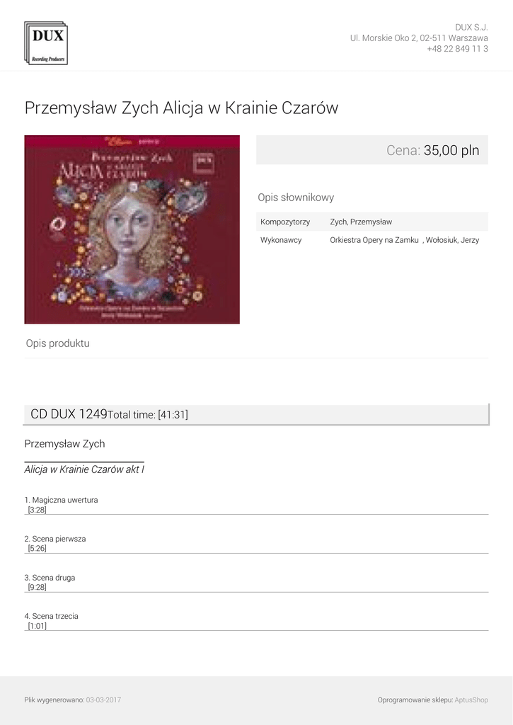 DUX S.J. Ul. Morskie Oko 2, 02-511 Warszawa +48 22 849 11 3 Przemysław Zych Alicja w Krainie Czarów Cena: 35,00 pln Opis słownikowy Kompozytorzy Zych, Przemysław ∎ Wykonawcy Orkiestra Opery na Zamku ∎, Wołosiuk, Jerzy ∎ Opis produktu CD DUX 1249Total time: [41:31] Przemysław Zych Alicja w Krainie Czarów akt I 1. Magiczna uwertura [3:28] 2. Scena pierwsza [5:26] 3. Scena druga [9:28] 4. Scena trzecia [1:01] Plik wygenerowano: 03-03-2017 Oprogramowanie sklepu: AptusShop DUX S.J. Ul. Morskie Oko 2, 02-511 Warszawa +48 22 849 11 3 5. Scena czwarta [5:04] 6. Scena piąta [3:51] 7. Scena szósta [4:52] 8. Scena siódma [8:20] CD DUX 1250Total time: [40:28] Przemysław Zych Alicja w Krainie Czarów akt II 1. Scena ósma [2:39] 2. Scena dziewiąta [6:02] 3. Scena dziesiąta [5:06] 4. Scena jedenasta [2:55] 5. Scena dwunasta [1:43] 6. Scena trzynasta [4:19] 7. Scena czternasta [14:19] 8. Scena piętnasta [3:22] Plik wygenerowano: 03-03-2017 Oprogramowanie sklepu: AptusShop DUX S.J. Ul. Morskie Oko 2, 02-511 Warszawa +48 22 849 11 3 Wykonawcy: Orkiestra Opery na Zamku Jerzy Wołosiuk /dyrygent/ Plik wygenerowano: 03-03-2017 Powered by TCPDF (www.tcpdf.org) Oprogramowanie sklepu: AptusShop