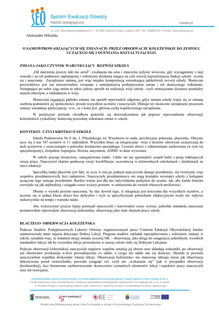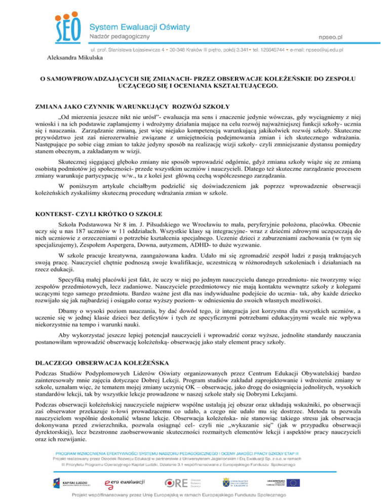Aleksandra Mikulska O SAMOWPROWADZAJĄCYCH SIĘ ZMIANACH- PRZEZ OBSERWACJE KOLEŻEŃSKIE DO ZESPOŁU UCZĄCEGO SIĘ I OCENIANIA KSZTAŁTUJĄCEGO. ZMIANA JAKO CZYNNIK WARUNKUJĄCY ROZWÓJ SZKOŁY „Od mierzenia jeszcze nikt nie urósł”- ewaluacja ma sens i znaczenie jedynie wówczas, gdy wyciągniemy z niej wnioski i na ich podstawie zaplanujemy i wdrożymy działania mające na celu rozwój najważniejszej funkcji szkoły- ucznia się i nauczania. Zarządzanie zmianą, jest więc niejako kompetencją warunkującą jakikolwiek rozwój szkoły. Skuteczne przywództwo jest zaś nierozerwalnie związane z umiejętnością podejmowania zmian i ich skutecznego wdrażania. Następujące po sobie ciąg zmian to także jedyny sposób na realizację wizji szkoły- czyli zmniejszanie dystansu pomiędzy stanem obecnym, a zakładanym w wizji. Skutecznej sięgającej głęboko zmiany nie sposób wprowadzić odgórnie, gdyż zmiana szkoły wiąże się ze zmianą osobistą podmiotów jej społeczności- przede wszystkim uczniów i nauczycieli. Dlatego też skuteczne zarządzanie procesem zmiany warunkuje partycypację w/w., ta z kolei jest główną cechą współczesnego zarządzania. W poniższym artykule chciałbym podzielić się doświadczeniem jak poprzez wprowadzenie obserwacji koleżeńskich zyskaliśmy skuteczną procedurę wdrażania zmian w szkole. KONTEKST- CZYLI KRÓTKO O SZKOLE Szkoła Podstawowa Nr 8 im. J. Piłsudskiego we Wrocławiu to mała, peryferyjnie położona, placówka. Obecnie uczy się u nas 187 uczniów w 11 oddziałach. Wszystkie klasy są integracyjne- wraz z dziećmi zdrowymi uczęszczają do nich uczniowie z orzeczeniami o potrzebie kształcenia specjalnego. Uczenie dzieci z zaburzeniami zachowania (w tym się specjalizujemy), Zespołem Aspergera, Downa, autyzmem, ADHD- to duże wyzwanie. W szkole pracuje kreatywna, zaangażowana kadra. Udało mi się zgromadzić zespół ludzi z pasją traktujących swoją pracę. Nauczyciel chętnie podnoszą swoje kwalifikacje, uczestniczą w różnorodnych szkoleniach i działaniach na rzecz edukacji. Specyfiką małej placówki jest fakt, że uczy w niej po jednym nauczycielu danego przedmiotu- nie tworzymy więc zespołów przedmiotowych, lecz zadaniowe. Nauczyciele przedmiotowcy nie mają kontaktu wewnątrz szkoły z kolegami uczącymi tego samego przedmiotu. Bardzo ważne jest dla nas indywidualne podejście do ucznia- tak, aby każde dziecko rozwijało się jak najbardziej i osiągało coraz wyższy poziom- w odniesieniu do swoich własnych możliwości. Dbamy o wysoki poziom nauczania, by dać dowód tego, iż integracja jest korzystna dla wszystkich uczniów, a uczenie się w jednej klasie dzieci bez deficytów i tych ze specyficznymi potrzebami edukacyjnymi wcale nie wpływa niekorzystnie na tempo i warunki nauki. Aby wykorzystać jeszcze lepiej potencjał nauczycieli i wprowadzić coraz wyższe, jednolite standardy nauczania postanowiłam wprowadzić obserwację koleżeńską- obserwację jako stały element pracy szkoły. DLACZEGO OBSERWACJA KOLEŻEŃSKA Podczas Studiów Podyplomowych Liderów Oświaty organizowanych przez Centrum Edukacji Obywatelskiej bardzo zainteresowały mnie zajęcia dotyczące Dobrej Lekcji. Program studiów zakładał zaprojektowanie i wdrożenie zmiany w szkole, uznałam więc, że tematem mojej zmiany uczynię OK – obserwację, jako drogę do osiągnięcia jednolitych, wysokich standardów lekcji, tak by wszystkie lekcje prowadzone w naszej szkole stały się Dobrymi Lekcjami. Podczas obserwacji koleżeńskiej nauczyciele najpierw wspólne ustalają jej obszar oraz układają wskaźniki, po obserwacji zaś obserwator przekazuje n-lowi prowadzącemu co udało, a czego nie udało mu się dostrzec. Metoda ta pozwala nauczycielom wspólnie doskonalić własne lekcje. Obserwacja koleżeńska- nie stanowiąc takiego stresu jak obserwacja dokonywana przed zwierzchnika, pozwala osiągnąć cel- czyli nie „wykazanie się” (jak w przypadku obserwacji dyrektorskiej), lecz bezstronne zaobserwowanie skuteczności rozmaitych elementów lekcji i aspektów pracy nauczycieli oraz ich rozwijanie. Wspólne ustalenie jednolitych standardów lekcji daje podstawę na pełniejsze ich realizowanie przez poszczególnych nauczycieli, ponieważ każdy ma swój głos przy ich ustalaniu i nie są traktowane jako narzucone z góry. Każdy musi się też zastanowić nad własną pracą, nad prowadzonymi przez siebie lekcjami- czyli już sam etap wstępny przynosi pozytywne rezultaty w postaci podniesienia poziomu świadomości i poczucia celowości własnych działań. Umacnia się rola rady pedagogicznej- jako ciągle uczącego się i doskonalącego zespołu współpracowników. Ponadto lepiej zostanie wykorzystany potencjał poszczególnych nauczycieli- umiejętności zdobyte podczas różnorodnych szkoleń zostaną zaprezentowane w praktyce pozostałym, dzięki czemu inni nauczyciele też będą mogli urozmaicić i udoskonalić swój warsztat pracy- podczas obserwacji koleżeńskiej rozwijają się obie strony. W pracy z dziećmi ze specjalnymi potrzebami edukacyjnymi ważny jest jeszcze jeden aspekt- indywidualne sposoby i metody pracy, podejścia do poszczególnego ucznia oraz sposób pracy z konkretnym zespołem klasowym. Ponieważ nie mamy możliwości dostosowań architektonicznych, nie uczą się u nas uczniowie z niepełnosprawnością ruchową. Nasi wychowankowie to dzieci z zaburzeniami zachowania, niepełnosprawnością intelektualną, Zespołem Aspergera, Downa, ADHD itp. Kluczowym punktem w pracy z takimi uczniami jest dobranie odpowiednich metod i sposobów pracy (motywacji, kontaktu). Obserwacje koleżeńskie pozwalają na wymianę doświadczeń również w tym obszarze. Z jednej strony pozwalają nauczycielom na dobór metod najodpowiedniejszych, najskuteczniejszych w pracy z danym uczniem oraz zespołem klasowym, z drugiej zaś strony dają możliwość działania „jednym frontem” na każdej lek