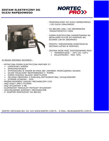 ZESTAW ELEKTRYCZNY DO OLEJU NAPĘDOWEGO - PRZEZNACZONY DO OLEJU NAPĘDOWEGO I DO OLEJU OPAŁOWEGO - DO BECZEK 200L I DO ZBIORNIKÓW MAGAZYNOWYCH 1000L - POMPA ELEKTRYCZNA ZAMONTOWANA NA METALOWEJ PŁYCIE DO MONTAŻU NA ŚCIANIE LUB NA ZBIORNIKU - PROSTA I NIEZAWODNA KONSTRUKCJA ZESTAWU ŁATWA W MONTAŻU - ZESTAW MOŻE MIEĆ ZASTOSOWANIE PRZY: TEMPERATURZE : -20°C DO +60°C WILGOTNOŚCI : MAX. 90% W SKŁAD ZESTAWU WCHODZI : - ROTACYJNA POMPA ELEKTRYCZNA PANTHER 57: ŁOPATKOWY WIRNIK SAMOZASYSAJĄCA WYPOSAŻONA W ZAWÓR BY-PASS ABY ZAPOBIEC PRZECIĄŻENIU SILNIKA SILNIK POŁĄCZONY BEZPOŚREDNIO Z POMPĄ POMPA POSIADA WŁASNY WENTYLATOR ŻELIWNA OBUDOWA Z POWŁOKĄ ANTYKOROZYJNĄ I WYŁĄCZNIKIEM STOPIEŃ OCHRONY : IP55 - PRZEPŁYWOMIERZ LINIOWY MECHANICZNY K33I - WĄŻ SSĄCY 2MB Z FILTREM - WĄŻ WYLEWOWY 4 MB - ALUMINIOWY MANUALNY PISTOLET WYLEWOWY - USZCZELNIENIE GUMOWE I MECHANICZNE - 2” ADAPTER MONTAZOWY DO BECZKI NORTEC INFOLINIA 801 521 522 WWW.NORTEC.COM.PL - E-MAIL: [email protected]