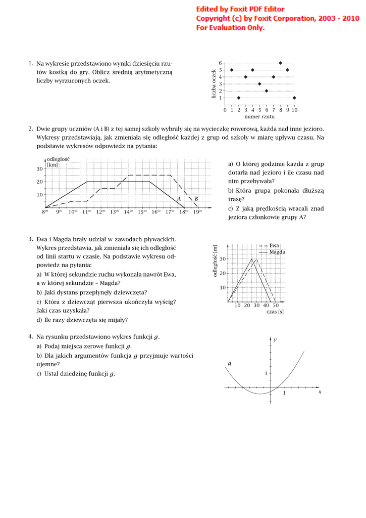 A 1. Na wykresie przedstawiono wyniki dziesięciu rzutów kostką do gry. Oblicz średnią arytmetyczną liczby wyrzuconych oczek. 2. Dwie grupy uczniów (A i B) z tej samej szkoły wybrały się na wycieczkę rowerową, każda nad inne jezioro. Wykresy przedstawiają, jak zmieniała się odległość każdej z grup od szkoły w miarę upływu czasu. Na podstawie wykresów odpowiedz na pytania: a) O której godzinie każda z grup dotarła nad jezioro i ile czasu nad nim przebywała? b) Która grupa pokonała dłuższą trasę? c) Z jaką prędkością wracali znad jeziora członkowie grupy A? 3. Ewa i Magda brały udział w zawodach pływackich. Wykres przedstawia, jak zmieniała się ich odległość od linii startu w czasie. Na podstawie wykresu odpowiedz na pytania: a) W której sekundzie ruchu wykonała nawrót Ewa, a w której sekundzie – Magda? b) Jaki dystans przepłynęły dziewczęta? c) Która z dziewcząt pierwsza ukończyła wyścig? Jaki czas uzyskała? d) Ile razy dziewczęta się mijały? 4. Na rysunku przedstawiono wykres funkcji 𝑔. a) Podaj miejsca zerowe funkcji 𝑔. b) Dla jakich argumentów funkcja 𝑔 przyjmuje wartości ujemne? c) Ustal dziedzinę funkcji 𝑔. A 5. Na rysunku obok przedstawiono wykres funkcji 𝑓. Oceń prawdziwość zdań. Wstaw znak X w odpowiednią kratkę. Funkcja 𝑓 przyjmuje wartość dodatnią tylko dla jednego argumentu. prawda fałsz Funkcja ta osiąga wartość 1 dla argumentu równego 2. prawda fałsz Funkcja nie przyjmuje wartości 0. prawda fałsz Wartość funkcji dla argumentu równego −1 jest taka sama jak dla prawda fałsz argumentu równego 1. 6. Na rysunku obok przedstawiono wykres funkcji 𝑓. Uzupełnij poniższe zdania, używając określeń z ramki. większa/-y od równa/-y mniejsza/-y od Największa wartość funkcji 𝑓 jest Wartość funkcji 𝑓 dla 𝑥 = 1 jest . . . . . . . . . . . . . . . . . . . . . . . . . . . . . . . . . . . . . . . . . . . . 3. wartości tej funkcji dla 𝑥 = −1. Argument, dla którego funkcja 𝑓 przyjmuje wartość −1, jest . . . . . . . . . . . . . . . . . . . . . . −2. Najmniejsza wartość funkcji 𝑓 jest . . . . . . . . . . . . . . . . . . . . . . −2. 7. Wykres funkcji 𝑦 = −3𝑥 + 6 naszkicowano na rysunku: 8. Narysuj wykres funkcji 𝑦 = −2𝑥 − 1, której dziedziną jest zbiór liczb całkowitych. 9. Dana jest funkcja 𝑦 = 23 𝑥. Sporządź wykres tej funkcji i ustal, czy jest to funkcja rosnąca, malejąca czy stała. 10. Wyraź wzorem zależność 𝑦 od 𝑥: a) 1 2 litra oleju waży 0,45 kg, a 𝑥 litrów tego oleju waży 𝑦 kg. b) Samochód przez 𝑦 godzin pokonał 650 km, jadąc ze stałą prędkością 𝑥 km h . 11. Czy podane wielkości są wprost proporcjonalne? Wstaw znak X w odpowiednią kratkę. Bok trójkąta równobocznego i obwód tego trójkąta. TAK NIE Bok trójkąta równobocznego i pole tego trójkąta. TAK NIE 12. Dane są wielkości 𝑥 = 13 𝑎 oraz 𝑦 = 6𝑎. Zapisz zależność 𝑦 od 𝑥. 1. 3,6 2. a) A — 1100 , 4,5 godz.; B — 1400 , 3 godz., b) B, c) 8 km/h 3. a) Ewa w 30 sekundzie, Magda w 25 sekundzie, b) 60 m, c) Magda; 45 s, d) 1 raz 4. a) 𝑥 = 12 , 𝑥 = −2, b) dla −2 < 𝑥 < 12 , c) zbiór liczb rzeczywistych 5. P, P, F, F 6. większa od, większa od, równy, mniejsza od 7. C 8. 9. funkcja rosnąca 10. a) 𝑦 = 0,9𝑥, b) 𝑦 = 11. T, N 12. 𝑦 = 18𝑥 650 𝑥
