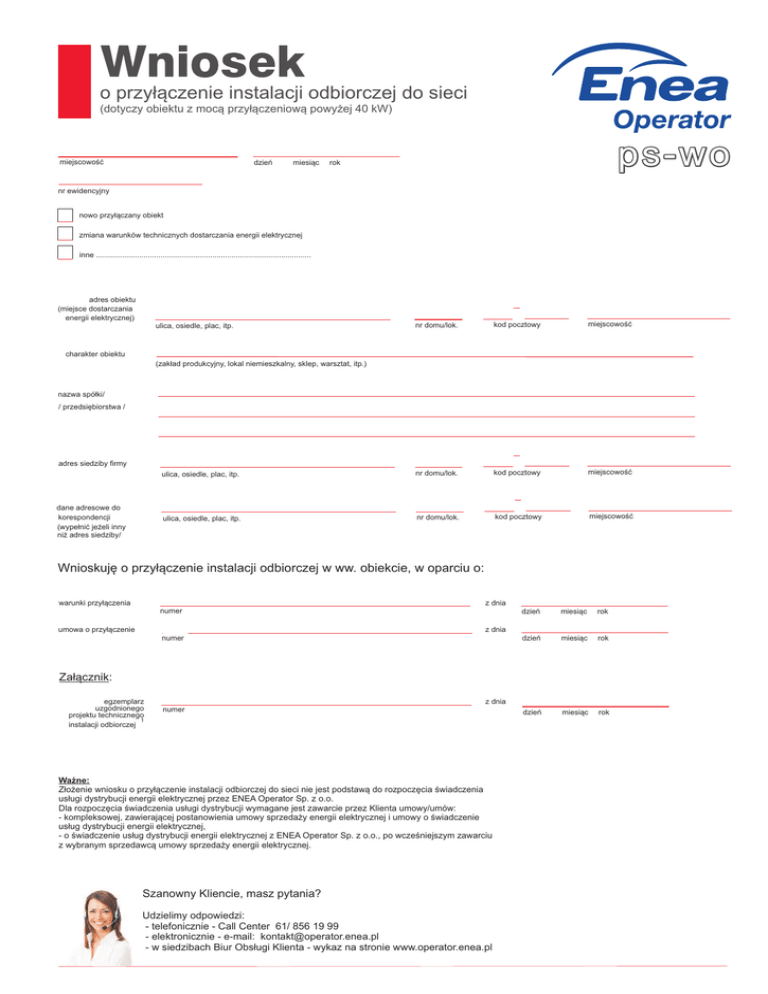 o przy³¹czenie instalacji odbiorczej do sieci (dotyczy obiektu z moc¹ przy³¹czeniow¹ powy¿ej 40 kW) miejscowoœæ dzieñ miesi¹c ps-wo rok nr ewidencyjny nowo przy³¹czany obiekt zmiana warunków technicznych dostarczania energii elektrycznej inne .................................................................................................... adres obiektu (miejsce dostarczania energii elektrycznej) nr domu/lok. kod pocztowy miejscowoœæ ulica, osiedle, plac, itp. nr domu/lok. kod pocztowy miejscowoœæ ulica, osiedle, plac, itp. nr domu/lok. kod pocztowy miejscowoœæ ulica, osiedle, plac, itp. charakter obiektu (zak³ad produkcyjny, lokal niemieszkalny, sklep, warsztat, itp.) nazwa spó³ki/ / przedsiêbiorstwa / adres siedziby firmy dane adresowe do korespondencji (wype³niæ je¿eli inny ni¿ adres siedziby/ Wnioskujê o przy³¹czenie instalacji odbiorczej w ww. obiekcie, w oparciu o: z dnia warunki przy³¹czenia numer umowa o przy³¹czenie dzieñ miesi¹c rok dzieñ miesi¹c rok dzieñ miesi¹c rok z dnia numer Za³¹cznik: egzemplarz uzgodnionego projektu technicznego 1 instalacji odbiorczej z dnia numer Wa¿ne: Czêœæ C - wype³nia Klient Z³o¿enie wniosku o przy³¹czenie instalacji odbiorczej do sieci nie jest podstaw¹ do rozpoczêcia œwiadczenia us³ugi dystrybucji energii elektrycznej przez ENEA Operator Sp. z o.o. Dla rozpoczêcia œwiadczenia us³ugi dystrybucji wymagane jest zawarcie przez Klienta umowy/umów: - kompleksowej, zawieraj¹cej postanowienia umowy sprzeda¿y energii elektrycznej i umowy o œwiadczenie us³ug dystrybucji energii elektrycznej, - o œwiadczenie us³ug dystrybucji energii elektrycznej z ENEA Operator Sp. z o.o., po wczeœniejszym zawarciu z wybranym sprzedawc¹ umowy sprzeda¿y energii elektrycznej. Szanowny Kliencie, masz pytania? Udzielimy odpowiedzi: - telefonicznie - Call Center 61/ 856 19 99 - elektronicznie - e-mail: [email protected] - w siedzibach Biur Obs³ugi Klienta - wykaz na stronie www.operator.enea.pl osoba do kontaktu ze strony Klienta imiê i nazwisko telefon, e-mail transformatory na napiêciu zasilania lp. moc w [kVA] przek³adnia grupa po³¹czeñ napiêcie zwarcia uwagi moc baterii w [kVAr] rodzaj regulacji 1 2 urz¹dzenia kompensacyjne lp. napiêcie w [V] nazwa 1 2 systemy ochrony od pora¿eñ wielkoœæ przek³adników napiêciowych wielkoœæ przek³adników pr¹dowych lokalizacja rozdzielni z uk³adem pomiarowym rodzaj i nastawa zabezpieczeñ Klienta urz¹dzenia pr¹dotwórcze niewspó³pracuj¹ce z sieci¹ energetyki zawodowej lp. typ - przeznaczenie, rodzaj blokady napiêcie moc [kW] 1 2 Oœwiadczenia Klienta: - oœwiadczam, ¿e uzyska³em zgodê na przeprowadzenie instalacji odbiorczej przez nieruchomoœæ nie Czêœæ B - wype³nia (zarz¹dca) nieruchomoœci stanowi¹c¹ mojejw³aœciciel w³asnoœci / Oœwiadczam, ¿e instalacja odbiorcza nie jest prowadzona przez nieruchomoœæ bêd¹c¹ w³asnoœci¹ strony trzeciej, 3 2 - oœwiadczam, ¿e zg³oszona do przy³¹czenia instalacja odbiorcza zosta³a wykonana przez podmiot posiadaj¹cy odpowiednie uprawnienia i kwalifikacje. numer telefonu 1 2 podpis (imiê i nazwisko przedstawiciela Klienta) je¿eli koniecznoœæ opracowania projektu instalacji odbiorczej wynika z warunków przy³¹czenia lub umowy o przy³¹czenie niew³aœciwe skreœliæ