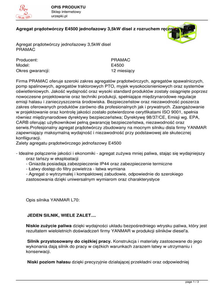 OPIS PRODUKTU Sklep internetowy urzepki.pl Agregat prądotwórczy E4500 jednofazowy 3,5kW disel z rozruchem ręcznym Agregat prądotwórczy jednofazowy 3,5kW disel PRAMAC Producent: Model: Okres gwarancji: PRAMAC E4500 12 miesiący Firma PRAMAC oferuje szeroki zakres agregatów prądotwórczych, agregatów spawalniczych, pomp spalinowych, agregatów traktorowych PTO, myjek wysokocisnieniowych oraz systemów oświetleniowych. Jakość wydajność oraz wysoki standard produktów zostały osiągnięte poprzez nowoczesne projektowanie oraz techniki produkcji, spełniające międzynarodowe regulacje emisji hałasu i zanieczyszczenia środowiska. Bezpieczeństow oraz niezawodność poszerza zakres oferowanych produktów zarówno dla profesionalnych jak i prywatnych. Zaangażowanie w projektowanie oraz kontrolę jakości zostało potwierdzone cerytfikatami ISO 9001, spełnia równiez międzynarodowe dyrektywy bezpieczeństwa; Dyrektywę 98/37/CE, Emisji wg. EPA, CARB oferując użytkownikowi pełną gwarancję bezpieczeństwa, niezawodność oraz serwis.Profesjonalny agregat prądotwórczy zbudowany na mocnym silniku disla firmy YANMAR zapewniający maksymalną wydajność i niezawodność przy podstawowej ale skutecznej konfiiguracji. Zalety agregatu prądotwórczego jednofazowy E4500 - Idealne połączenie jakości i ekonomiki - agregat zużywa mniej paliwa, stając się wydajniejszy oraz tańszy w eksploatacji - Gniazda posiadają zabezpieczenie IP44 oraz zabezpieczenie termiczne - Łatwy dostęp do filtry powietrza - łatwa wymiana - Agregat o wytrzymałej i kompaktowej zabudowie, odpowiednie do szerokiego zastosowania dzięki uniwersalnym wymiarom oraz charakterystyce Opis silnika YANMAR L70: JEDEN SILNIK, WIELE ZALET.... Niskie zużycie paliwa dzięki wydajności układu bezpośredniego wtrysku paliwa, który jest rezultatem wieloletnich doświadczeń firmy YANMAR w produkcji silników diesel'a. Silnik przystosowany do ciężkiej pracy. Konstrukcja i materiały zastosowane do jego wykonania dają silnik do pracy w ciężkich warunkach zarazem łatwy w utrzymaniu i konserwacji. Niski poziom hałasu dzięki precyzyjnie działającej przekładni oraz odpowiedniej page 1 / 3 OPIS PRODUKTU Sklep internetowy urzepki.pl konstrukcji tłumika. Łatwy i szybki rozruch. Ręczny rozruch silnika prawie tak lekki jak w silniku benzynowym. Specjalny sytem dekompresji. Właściwości techniczne Silnik Diesel'a z pionowym pojedynczym cylindrem, 4-suwowym, chłodzonym powietrzem, z bezpośrednim wtryskiem paliwa. Mechaniczny regulator obrotów Dane techniczne silnika L70 Model Cylinder Pojemność skokowa średnica x skok Obroty silnika Moc max. L70 1 pionowy 296 cm3 78x62 mm 3000 / 3600 obr/min Moc ciągła 4,04 kW / 5,5 KM / 3000 obr-1 4,41 kw / 6,0 KM / 3600 obr-1 5,05 kW / 7,0 KM / 3000 obr-1 5,66 kW / 7,7 KM / 3600 obr-1 Rozruch ręczny (opcja: starter elektryczny) System chłodzenia powietrze Pojemność zbiornika paliwa 3,50 l Pojemność miski olejowej 1,1 l Wymiary (dł x szer x wys) 383 x 421 x 450 mm Masa 33,0 kg Dane techniczne agregatu prądotwórczego E4500 Typ Prąd Moc maksymalna kW/kVA Moc ciągła kW/kVA Namięcie Częstotliwość Hz Współczynnik mocy cosø Rozruch Zużycie paliwa przy 75% obciążenia l/h Czas pracy przy 75% obciążenia na h Poziom cisnienia akustycznego przy 7m dB(A) Gwarantowany poziom hałasu LWA dB(A) E4500 jednofazowy 3,5 / 3,9 3,0 / 3,3 230V 50 0,9 ręczny 1,0 3,5 * * page 2 / 3 OPIS PRODUKTU Sklep internetowy urzepki.pl Długość mm Szerokość mm Wysokość mm Waga (suchy) kg Gniazda Zabezpieczenie elektryczne Zabezpieczenie gniazd 760 490 530 54 2 x SCHUKO IP 23 IP 54 Wyposażenie - Oryginalnie zapakowany zestaw - Instrukcja obsługi - Karta gwarancyjna - zabezpieczenie termiczne: tak - Czujnik niskiego poziomu oleju: nie - Gniazda elektryczne: 2 x 230V 16A - Zabezpieczenie na generatorze IP 23 - Zabezpieczenia na gniazdach IP 44 Cena: 8499.3 zł page 3 / 3