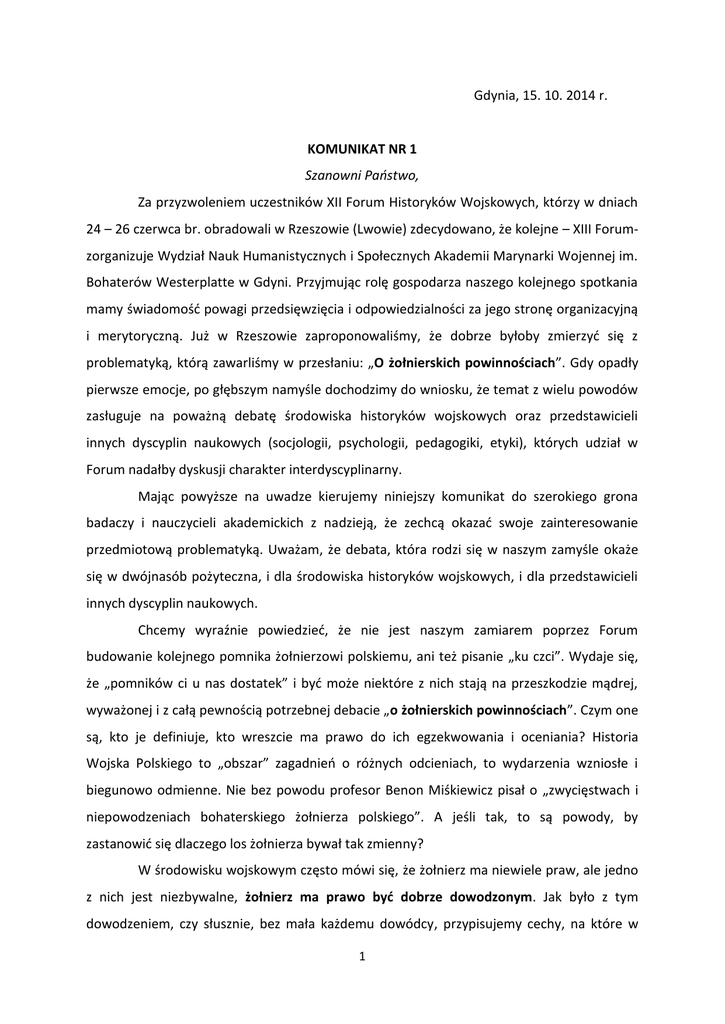 Gdynia, 15. 10. 2014 r. KOMUNIKAT NR 1 Szanowni Państwo, Za przyzwoleniem uczestników XII Forum Historyków Wojskowych, którzy w dniach 24 – 26 czerwca br. obradowali w Rzeszowie (Lwowie) zdecydowano, że kolejne – XIII Forumzorganizuje Wydział Nauk Humanistycznych i Społecznych Akademii Marynarki Wojennej im. Bohaterów Westerplatte w Gdyni. Przyjmując rolę gospodarza naszego kolejnego spotkania mamy świadomość powagi przedsięwzięcia i odpowiedzialności za jego stronę organizacyjną i merytoryczną. Już w Rzeszowie zaproponowaliśmy, że dobrze byłoby zmierzyć się z problematyką, którą zawarliśmy w przesłaniu: „O żołnierskich powinnościach”. Gdy opadły pierwsze emocje, po głębszym namyśle dochodzimy do wniosku, że temat z wielu powodów zasługuje na poważną debatę środowiska historyków wojskowych oraz przedstawicieli innych dyscyplin naukowych (socjologii, psychologii, pedagogiki, etyki), których udział w Forum nadałby dyskusji charakter interdyscyplinarny. Mając powyższe na uwadze kierujemy niniejszy komunikat do szerokiego grona badaczy i nauczycieli akademickich z nadzieją, że zechcą okazać swoje zainteresowanie przedmiotową problematyką. Uważam, że debata, która rodzi się w naszym zamyśle okaże się w dwójnasób pożyteczna, i dla środowiska historyków wojskowych, i dla przedstawicieli innych dyscyplin naukowych. Chcemy wyraźnie powiedzieć, że nie jest naszym zamiarem poprzez Forum budowanie kolejnego pomnika żołnierzowi polskiemu, ani też pisanie „ku czci”. Wydaje się, że „pomników ci u nas dostatek” i być może niektóre z nich stają na przeszkodzie mądrej, wyważonej i z całą pewnością potrzebnej debacie „o żołnierskich powinnościach”. Czym one są, kto je definiuje, kto wreszcie ma prawo do ich egzekwowania i oceniania? Historia Wojska Polskiego to „obszar” zagadnień o różnych odcieniach, to wydarzenia wzniosłe i biegunowo odmienne. Nie bez powodu profesor Benon Miśkiewicz pisał o „zwycięstwach i niepowodzeniach bohaterskiego żołnierza polskiego”. A jeśli tak, to są powody, by zastanowić się dlaczego los żołnierza bywał tak zmienny? W środowisku wojskowym często mówi się, że żołnierz ma niewiele praw, ale jedno z nich jest niezbywalne, żołnierz ma prawo być dobrze dowodzonym. Jak było z tym dowodzeniem, czy słusznie, bez mała każdemu dowódcy, przypisujemy cechy, na które w 1 żaden sposób nie zasłużył. Czy tylko dlatego, że wyróżnia ich mundur będący uosobieniem władzy, czy może są inne ku temu powody? A jeśli tak, to jakie? Czy jesteśmy gotowi do innej debaty, w której należałoby odejść od gloryfikowania martyrologii na rzecz racjonalizowania naszych ocen, zarówno wobec zdarzeń i ludzi znaczonych laurem zwycięstwa na polu bitwy, ale z jeszcze większą dociekliwością wobec klęsk i niepowodzeń, które przecież miały swoje przyczyny! Nie wszystko da się usprawiedliwić przewagą przeciwników i wiarołomnością sojuszników. Ile zła i zaniedbań było po naszej stronie? Na XI Forum w Kielcach rozmawialiśmy o mitach w polskiej historiografii wojskowej, może warto niektóre wątki tej dyskusji kontynuować, ale z wyraźnym akcentem na te zagadnienia, które decydują o tym, że żołnierz jest (był) dobrze lub źle dowodzony. „Powinności…”, o których chcemy rozmawiać, to obszar zagadnień bardzo rozległych i nie można ich zamykać w przestrzeni koszar, okopów czy twierdz. Żołnierz spełnia powinności wobec narodu (państwa), a jak to działa w drugą stronę? Przecież w Konstytucji 3-maja zapisano, że „wojsko to nic innego, jak siła z narodu wzięta”. Czy rzeczywiście tak to było w naszej historii, czy może znajdziemy przykłady dywersji i uchylania się od „zaszczytnego obowiązku”? Armia, nie ulega to żadnej wątpliwości podlega ciągłym zmianom. Czy to samo możemy powiedzieć o „powinnościach żołnierskich”, bez obawy, że narazimy się na zarzut ich relatywizowania? Jak ma się etos służby wywiedziony z wychowania rycerskiego, artykułów hetmańskich, czy choćby Korpusu Kadetów do wojskowej i wojennej rzeczywistości? Jak było z wychowaniem żołnierza-obywatela i w jakim zakresie Rzeczpospolita owo wychowanie spożytkowała? Czy nie nadużywamy słowa „patriotyzm”, próbując nim maskować ewidentne przykłady postaw nieetycznych, sprzeniewierzania się zasadom, a nawet pospolitej zdrady? Kim byli dowódcy, którzy w najwyższej potrzebie porzucili swoje oddziały (dywizje, armie), dlaczego z takim trudem przychodzi nam oceniać przeszłość, w której z jednakowym nasileniem występowały przesłanki do dumy, jak i wstydu? Wywołaliśmy tu kilka zaledwie problemów, które naszym zdaniem powinny znaleźć swoje odzwierciedlenia w dyskusji na Forum. Czy tak się stanie zależy to wyłącznie od jego uczestników i naszej determinacji w dążeniu do „oczyszczania” historii wojskowej ze zbędnego patosu i podnoszenia każdej bitwy lub potyczki do rangi wydarzenia o przełomowym, patriotycznym i propaństwowym charakterze. Rzeczowość i naukowa 2 odwaga powinny racjonalizować podejście do biografii wojskowych, z których zdecydowana większość to hagiografie, gdzie nasz bohater oczywiście „chciał”, ale wraże siły i okoliczności skutecznie paraliżowały jego wysiłki. Czy tak było w istocie? Oczywiście ta uwaga nie dotyczy wyższej kadry dowódczej „ludowego” Wojska Polskiego, którą z definicji potraktowano, jako „polskojęzyczne narzędzie”, z zakazem pochówku na wojskowej części warszawskich Powązek. Oczekuje się od armii i każdego żołnierza apolityczności, a nasza historia wyraźnie wskazuje, że takiego komfortu nigdy to wojsko nie miało. Jak wykonywać rozkaz przełożonych, nawet ten najdalej idący, by po latach nie narazić się na zarzut, że stało się po niewłaściwej stronie? Szanowni Państwo, Za wcześnie na 