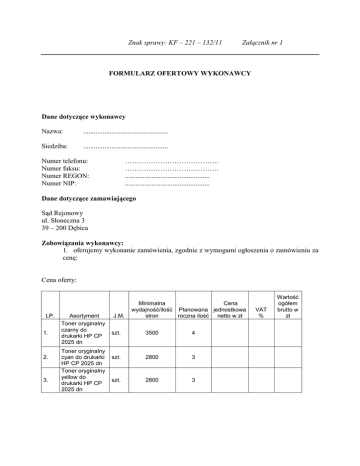 Znak sprawy: KF – 221 – 132/11 Załącznik nr 1 FORMULARZ OFERTOWY WYKONAWCY Dane dotyczące wykonawcy Nazwa: ................................................ Siedziba: ................................................ Numer telefonu: Numer faksu: Numer REGON: Numer NIP: …………………………………. …………………………………. ................................................ ................................................ Dane dotyczące zamawiającego Sąd Rejonowy ul. Słoneczna 3 39 – 200 Dębica Zobowiązania wykonawcy: 1. oferujemy wykonanie zamówienia, zgodnie z wymogami ogłoszenia o zamówieniu za cenę: Cena oferty: LP. 1. 2. 3. Asortyment Toner oryginalny czarny do drukarki HP CP 2025 dn Toner oryginalny cyan do drukarki HP CP 2025 dn Toner oryginalny yellow do drukarki HP CP 2025 dn J.M. Minimalna Cena wydajność/ilość Planowana jednostkowa stron roczna ilość netto w zł szt. 3500 4 szt. 2800 3 szt. 2800 3 VAT % Wartość ogółem brutto w zł Znak sprawy: KF – 221 – 132/11 4. 5. 6. 7. 8. Toner oryginalny magenta do drukarki HP CP 2025 dn toner oryginalny do drukarki NP. Oki 6500 dn szt. 2800 3 22000 10 42000 przy druku w czerni, 10500 przy druku w kolorze 1 15000 4 10 mln znaków 4 2500 8 3000 80 2500 6 szt. bęben światłoczuły oryginalny do urządzenia wielofunkcyjnego Epson Aculaser CX 11 NF szt. Toner oryginalny do kserokopiarki szt. Taskalfa 180 Taśma oryginalna do drukarki Tally Genicom T5040 szt. 9. Toner alternatywny czarny do drukarki HP 1000 10. Toner alternatywny czarny do drukarki HP 1010 11. Toner alternatywny czarny do drukarki HP 1100 2000 30 12. Toner alternatywny czarny do drukarki HP 1102 szt. 3700 12 13. Toner alternatywny czarny do drukarki HP 1160 7000 20 14. Toner alternatywny czarny do drukarki HP 2015 szt. szt. szt. szt. szt. Załącznik nr 1 Znak sprawy: KF – 221 – 132/11 15. Toner alternatywny czarny do drukarki HP 2055dn 6500 30 13000 4 4000 2 szt. 17. Toner alternatywny czarny do drukarki HP 3005 szt. Toner alternatywny cyan do urządzenia wielofunkcyjnego Epson Aculaser CX 11 NF szt. 4000 2 18. Toner alternatywny magenta do urządzenia wielofunkcyjnego Epson Aculaser CX 11 NF szt. 4000 2 19. Toner alternatywny yellow do urządzenia wielofunkcyjnego Epson Aculaser CX 11 NF szt. 4000 2 20. Toner alternatywny czarny do urządzenia wielofunkcyjnego Epson Aculaser CX 11 NF szt. 4500 2 21. Toner alternatywny czarny do urządzenia wielofunkcyjnego Epson Aculaser C1900 szt. 16. Załącznik nr 1 Znak sprawy: KF – 221 – 132/11 4500 2 22. Toner alternatywny cyan do urządzenia wielofunkcyjnego Epson Aculaser C1900 szt. 4500 2 23. Toner alternatywny magenta do urządzenia wielofunkcyjnego Epson Aculaser C1900 szt. 4500 2 24. Toner alternatywny yellow do urządzenia wielofunkcyjnego Epson Aculaser C1900 szt. 11000 4 11000 8 20000 16 8000 6 12000 4 8300 12 29. Toner alternatywny do kserokopiarki Konica 7115 toner alternatywny do kserokopiarki Develop ineo 210 Toner alternatywny czarny do drukarki Samsung Ml 4550 Toner alternatywny czarny do drukarki Samsung Ml 3051 Toner alternatywny czarny do drukarki Samsung Ml 3561 30. Toner alternatrywny do kserokopiarki Canon iR 2016 25. 26. 27. 28. szt. szt. szt. szt. szt. szt. Załącznik nr 1 Znak sprawy: KF – 221 – 132/11 31. Toner alternatywny czarny do drukarki HP Color LaserJet 3600 szt. 6000 2 32. Toner alternatywny cyan do drukarki HP Color LaserJet 3600 szt. 4000 2 szt. 4000 2 szt. 4000 2 45000 przy druku w czerni, 11250 przy druku w kolorze 1 21000 6 2000 1 2500 8 7000 60 18 ml 4 33. 34. 35. Toner alternatywny magenta do drukarki HP Color LaserJet 3600 Toner alternatywny yellow do drukarki HP Color LaserJet 3600 Bęben światłoczuły alternatywny do urządzenia szt. wielofunkcyjnego Epson Aculaser C 1900 37. Toner alternatywny do kserokopiarki Canon iR 2230 Toner alternatywny do faksu Canon L120 38. Toner alternatywny do faksu Panasonic KX-FL 613 36. 39. 40. Toner alternatywny czarny do drukarki Brother 5250 Tusz czarny alternatywny do drukarki HP DJ 460 CB szt. szt. szt. szt. szt. Załącznik nr 1 Znak sprawy: KF – 221 – 132/11 42. Tusz kolorowy alternatywny do drukarki HP DJ 460 CB Toner alternatywny czarny do drukarki Samsung Ml 2250 43. Zespół bębna alternatywny brother DR 3100 41. 17 ml 4 5000 20 25000 2 Załącznik nr 1 szt. szt. szt. Całkowita wartość zamówienia 2. oświadczamy, że akceptujemy wzór umowy, stanowiący załącznik nr 4 do SIWZ i nie wnosimy do niej zastrzeżeń. W przypadku wyboru naszej oferty zobowiązujemy się do zawarcia umowy na ww. warunkach w miejscu i terminie wyznaczonym przez Zamawiającego; 3. oświadczamy, że zapoznaliśmy się z warunkami umowy, przyjmujemy je bez zastrzeżeń; 4. oświadczamy nie podlegamy wykluczeniu z postępowania; 5. oświadczamy, że uważamy się za związanych mniejszą ofertą przez okres 30 dni od upływu terminu składania ofert; 6. pod groźbą odpowiedzialności karnej oświadczamy, że załączone do oferty dokumenty opisują stan faktyczny i prawny, aktualny na dzień otwarcia ofert ( art. 297 kk ); ……………………… Miejscowość, data ………………………………………………. pieczątka imienna i podpis osoby (osób) uprawnionych do składania oświadczeń woli w imieniu wykonawcy