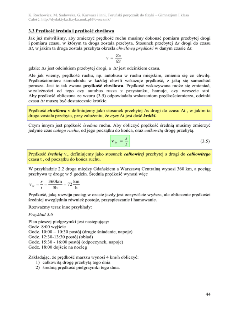 44 3.3 Prędkość średnia i prędkość chwilowa Jak już