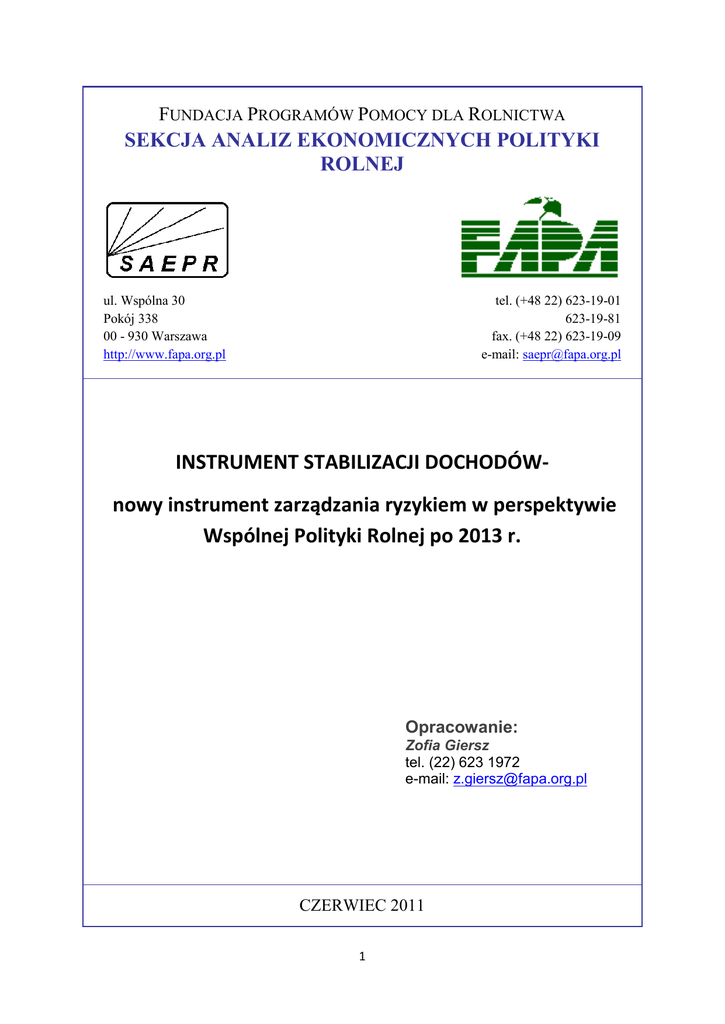 FUNDACJA PROGRAMÓW POMOCY DLA ROLNICTWA SEKCJA ANALIZ EKONOMICZNYCH POLITYKI ROLNEJ ul. Wspólna 30 Pokój 338 00 - 930 Warszawa http://www.fapa.org.pl tel. (+48 22) 623-19-01 623-19-81 fax. (+48 22) 623-19-09 e-mail: [email protected] INSTRUMENT STABILIZACJI DOCHODÓWnowy instrument zarządzania ryzykiem w perspektywie Wspólnej Polityki Rolnej po 2013 r. Opracowanie: Zofia Giersz tel. (22) 623 1972 e-mail: [email protected] CZERWIEC 2011 1 1.Komisja Europejska – plany w zakresie instrumentów ZARZĄDZANIA RYZYKIEM. Producenci rolni w swojej działalności są narażeni na ryzyka, głównie produkcyjne i rynkowe, które w sposób bezpośredni wpływają na kształtowanie dochodów, a w konsekwencji przekładają się na sytuację materialną gospodarstw. Komisja Europejska zauważa stale pogłębiającą się niestabilnośd sytuacji rolników w Unii Europejskiej przejawiającą się przede wszystkim w niepewności i spadku dochodów, które kształtują się obecnie na poziomie połowy dochodów w porównaniu z obszarami poza rolnictwem. Przyczyny tkwią z jednej strony w coraz słabszej efektywności mechanizmów stabilizujących rynek, a z drugiej głównie w zmianach klimatycznych, które powodują stale rosnące narażenie rolników na różnego rodzaju ryzyka. Z uwagi na jedną z podstawowych funkcji WPR, jaką jest zapewnienie unijnego oraz globalnego bezpieczeostwa żywnościowego oraz w obliczu nowych wyzwao, WPR jest reformowana. Jedną z propozycji KE (w ramach opcji 2, najbardziej prawdopodobnej do wprowadzenia) jest dostosowanie i uzupełnienie istniejących instrumentów tej polityki, w tym wzmocnienie istniejących narządzi w zakresie zarządzania ryzkiem, a także wprowadzenie opcjonalnego narzędzia stabilizacji dochodów, kompatybilnego z kategorią zieloną („green box”) WTO. W pracach nad przygotowaniem projektu ww. narzędzia stabilizacji dochodów Komisja Europejska wykorzystuje doświadczenia innych krajów, szczególnie te związane z zastosowaniem publicznego wsparcia i wzoruje się na modelu kanadyjskim. 2.Model kanadyjski Biznesowego Zarządzania Ryzykiem w Rolnictwie (Business Risk Management In Agriculture). Opis. Kanada jest krajem, w którym historycznie i zwyczajowo rząd zawsze był aktywnie zaangażowany we wsparcie sektora rolnego. Od 2008 roku polityka rolno-żywnościowa realizowana jest w formie systemu zarządzania ryzykiem biznesowym w rolnictwie nakierowanego na stabilizację dochodów. Punktem wyjścia dla takiej polityki jest pogląd, że w rolnictwie trzeba zmierzyd się z wieloma źródłami ryzyka (produkcyjnym, cenowym, finansowym, rynkowym, itp.), a każde z nich skutkuje w konsekwencji stratami w dochodach. Programy zawarte w tym systemie zarządzania ryzykiem umożliwiają rolnikom skorzystanie z maksymalnej ochrony w różnych sytuacjach. System składa się z czterech kluczowych programów: AgriInsurance (ubezpieczenia w rolnictwie), AgriInvest (inwestycje w rolnictwie), AgriStability (stabilizacja w rolnictwie) i AgriRecovery (regeneracja w rolnictwie), z których każdy jest współfinansowany przez rząd. AgriInsurance - ubezpieczenie upraw od specyficznych rodzajów ryzyka produkcyjnego (pogodowych, szkodników i chorób); finansowane w 40% przez rolników i w 60% przez rząd; 2 AgriInvest – fundusz ochrony rolników na wypadek obniżenia dochodów w granicach do 15%; finansowany w 50% przez rząd; odpowiednik rachunków oszczędnościowych producentów; AgriStability – płatnośd uruchamiana przez rząd w przypadku dużego spadku dochodów rolników (powyżej 15% w stosunku do średniej z poprzedzających 5 lat, tzw. średniej „olimpijskiej”); finansowanie w zależności od zakresu spadku dochodów: 70% przy spadku dochodów w granicach 15-30%, 80% przy spadku dochodów powyżej 30%; w przypadku braku dochodów (straty) rząd rekompensuje 60% strat. AgriRecovery – doraźny program pomocy uruchamiany w przypadku zdarzeo katastroficznych, stanowi uzupełnienie pozostałych programów i dodatkowe wsparcie w przypadku braku odpowiedniego pokrycia strat przez główne programy; finansowany całkowicie z publicznych środków (rządowych i lokalnych). Zalety. Współistnieje wiele programów, które wypełniają różne rodzaje i warstwy ryzyka oraz uzupełniają się nawzajem. Programy w znacznej mierze są finansowane przez środki rządowe, co stanowi poważną zachętę do uczestnictwa w tych programach. Symulacje wykazały, że bez subsydiów rolnicy kanadyjscy nie kupowaliby ubezpieczeo upraw w ogóle ze względu na zbyt wysokie ceny, natomiast z subsydiami ubezpieczają 1/3 gruntów. Programy są administrowane przez agendy rządowe. Płatności w AgriInsurance są realizowane bardzo szybko, stanowią swego rodzaju zaliczkowe płatności w stosunku do wypłat z Agristability. Agristability jest oparty na danych podatkowych, wzbogaconych dodatkowo o szczegółowe informacje pochodzące (wymagane do raportowania) od rolnika, dzięki czemu jest dokładnie nacelowany na indywidualne wahania dochodów poszczególnych rolników. Wady. Tradycja zabezpieczania ryzyk w rolnictwie przez paostwo powoduje, że są duże oczekiwania rolników w tym zakresie. System jest wielowarstwowy, co utrudnia administrację i realizację należności w odpowiednim czasie. Żaden z programów nie stanowi zachęty do rozwoju rynkowych instrumentów zarządzania ryzykiem. Rolnicy przyzwyczajeni do kluczowej i wiodącej roli paostwa w zabezpieczaniu przed ryzykiem (różnymi rodzajami ryzyka od naturalnych po katastroficzne) nie stosują indywidualnych metod zarządzania ryzykiem we własnym gospodarstwie, a nawet podejmują bardziej ryzykowne działania, które są jednocześnie bardziej zyskowne (specjalizacja). Występuje tzw. efekt wypychania innych strategii zarządzania ryzykiem. W programie AgriInsurance, w zakresie ubezpieczeo upraw nie uczestniczą prywatne firmy ubezpieczeniowe (jedynie agendy rządowe obsługujące program jak 3 u