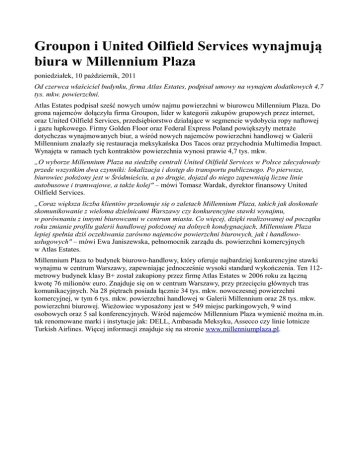 Groupon i United Oilfield Services wynajmują biura w Millennium Plaza poniedziałek, 10 październik, 2011 Od czerwca właściciel budynku, firma Atlas Estates, podpisał umowy na wynajem dodatkowych 4,7 tys. mkw. powierzchni. Atlas Estates podpisał sześć nowych umów najmu powierzchni w biurowcu Millennium Plaza. Do grona najemców dołączyła firma Groupon, lider w kategorii zakupów grupowych przez internet, oraz United Oilfield Services, przedsiębiorstwo działające w segmencie wydobycia ropy naftowej i gazu łupkowego. Firmy Golden Floor oraz Federal Express Poland powiększyły metraże dotychczas wynajmowanych biur, a wśród nowych najemców powierzchni handlowej w Galerii Millennium znalazły się restauracja meksykańska Dos Tacos oraz przychodnia Multimedia Impact. Wynajęta w ramach tych kontraktów powierzchnia wynosi prawie 4,7 tys. mkw. „O wyborze Millennium Plaza na siedzibę centrali United Oilfield Services w Polsce zdecydowały przede wszystkim dwa czynniki: lokalizacja i dostęp do transportu publicznego. Po pierwsze, biurowiec położony jest w Śródmieściu, a po drugie, dojazd do niego zapewniają liczne linie autobusowe i tramwajowe, a także kolej" – mówi Tomasz Wardak, dyrektor finansowy United Oilfield Services. „Coraz większa liczba klientów przekonuje się o zaletach Millennium Plaza, takich jak doskonałe skomunikowanie z wieloma dzielnicami Warszawy czy konkurencyjne stawki wynajmu, w porównaniu z innymi biurowcami w centrum miasta. Co więcej, dzięki realizowanej od początku roku zmianie profilu galerii handlowej położonej na dolnych kondygnacjach, Millennium Plaza lepiej spełnia dziś oczekiwania zarówno najemców powierzchni biurowych, jak i handlowousługowych" – mówi Ewa Janiszewska, pełnomocnik zarządu ds. powierzchni komercyjnych w Atlas Estates. Millennium Plaza to budynek biurowo-handlowy, który oferuje najbardziej konkurencyjne stawki wynajmu w centrum Warszawy, zapewniając jednocześnie wysoki standard wykończenia. Ten 112metrowy budynek klasy B+ został zakupiony przez firmę Atlas Estates w 2006 roku za łączną kwotę 76 milionów euro. Znajduje się on w centrum Warszawy, przy przecięciu głównych tras komunikacyjnych. Na 28 piętrach posiada łącznie 34 tys. mkw. nowoczesnej powierzchni komercyjnej, w tym 6 tys. mkw. powierzchni handlowej w Galerii Millennium oraz 28 tys. mkw. powierzchni biurowej. Wieżowiec wyposażony jest w 549 miejsc parkingowych, 9 wind osobowych oraz 5 sal konferencyjnych. Wśród najemców Millennium Plaza wymienić można m.in. tak renomowane marki i instytucje jak: DELL, Ambasada Meksyku, Assecco czy linie lotnicze Turkish Airlines. Więcej informacji znajduje się na stronie www.millenniumplaza.pl.