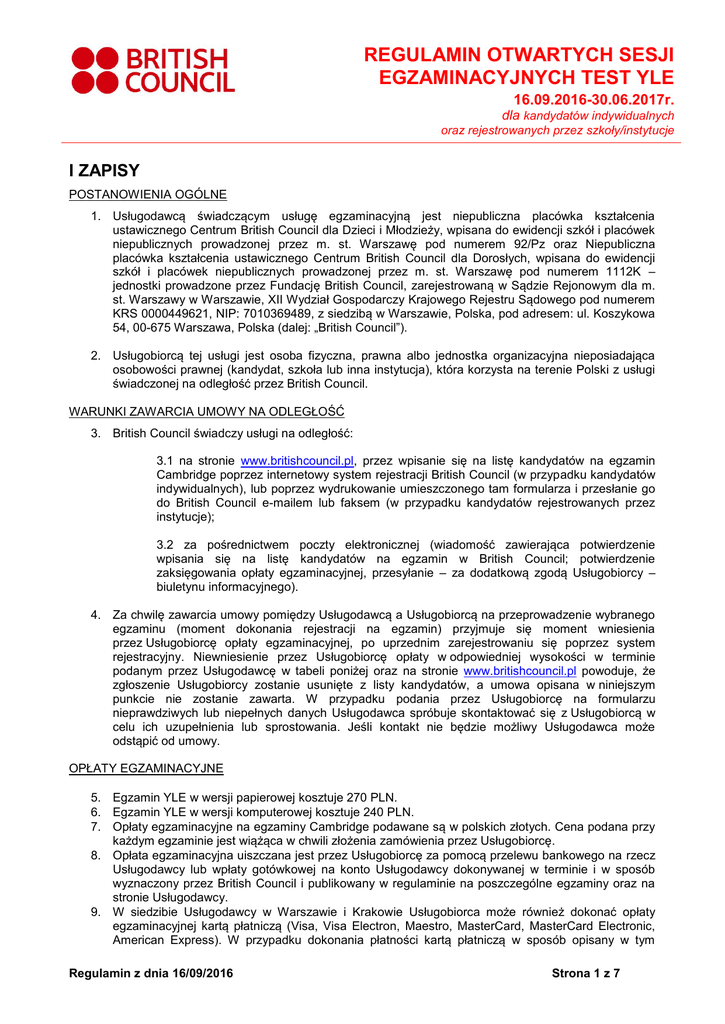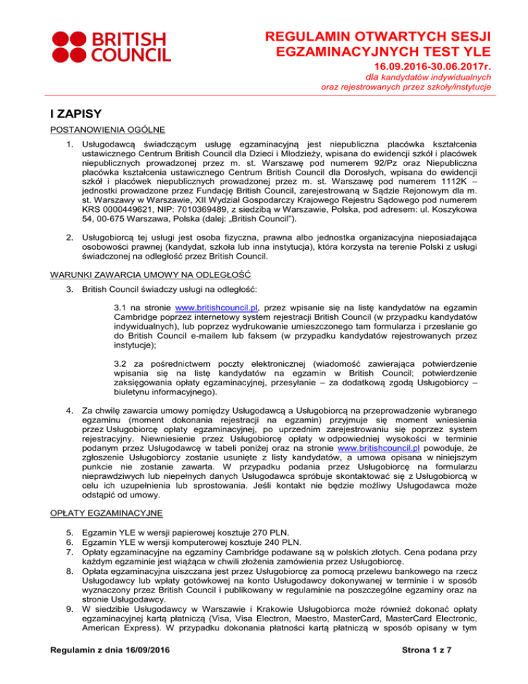 REGULAMIN OTWARTYCH SESJI EGZAMINACYJNYCH TEST YLE 16.09.2016-30.06.2017r. dla kandydatów indywidualnych oraz rejestrowanych przez szkoły/instytucje I ZAPISY POSTANOWIENIA OGÓLNE 1. Usługodawcą świadczącym usługę egzaminacyjną jest niepubliczna placówka kształcenia ustawicznego Centrum British Council dla Dzieci i Młodzieży, wpisana do ewidencji szkół i placówek niepublicznych prowadzonej przez m. st. Warszawę pod numerem 92/Pz oraz Niepubliczna placówka kształcenia ustawicznego Centrum British Council dla Dorosłych, wpisana do ewidencji szkół i placówek niepublicznych prowadzonej przez m. st. Warszawę pod numerem 1112K – jednostki prowadzone przez Fundację British Council, zarejestrowaną w Sądzie Rejonowym dla m. st. Warszawy w Warszawie, XII Wydział Gospodarczy Krajowego Rejestru Sądowego pod numerem KRS 0000449621, NIP: 7010369489, z siedzibą w Warszawie, Polska, pod adresem: ul. Koszykowa 54, 00-675 Warszawa, Polska (dalej: „British Council”). 2. Usługobiorcą tej usługi jest osoba fizyczna, prawna albo jednostka organizacyjna nieposiadająca osobowości prawnej (kandydat, szkoła lub inna instytucja), która korzysta na terenie Polski z usługi świadczonej na odległość przez British Council. WARUNKI ZAWARCIA UMOWY NA ODLEGŁOŚĆ 3. British Council świadczy usługi na odległość: 3.1 na stronie www.britishcouncil.pl, przez wpisanie się na listę kandydatów na egzamin Cambridge poprzez internetowy system rejestracji British Council (w przypadku kandydatów indywidualnych), lub poprzez wydrukowanie umieszczonego tam formularza i przesłanie go do British Council e-mailem lub faksem (w przypadku kandydatów rejestrowanych przez instytucje); 3.2 za pośrednictwem poczty elektronicznej (wiadomość zawierająca potwierdzenie wpisania się na listę kandydatów na egzamin w British Council; potwierdzenie zaksięgowania opłaty egzaminacyjnej, przesyłanie – za dodatkową zgodą Usługobiorcy – biuletynu informacyjnego). 4. Za chwilę zawarcia umowy pomiędzy Usługodawcą a Usługobiorcą na przeprowadzenie wybranego egzaminu (moment dokonania rejestracji na egzamin) przyjmuje się moment wniesienia przez Usługobiorcę opłaty egzaminacyjnej, po uprzednim zarejestrowaniu się poprzez system rejestracyjny. Niewniesienie przez Usługobiorcę opłaty w odpowiedniej wysokości w terminie podanym przez Usługodawcę w tabeli poniżej oraz na stronie www.britishcouncil.pl powoduje, że zgłoszenie Usługobiorcy zostanie usunięte z listy kandydatów, a umowa opisana w niniejszym punkcie nie zostanie zawarta. W przypadku podania przez Usługobiorcę na formularzu nieprawdziwych lub niepełnych danych Usługodawca spróbuje skontaktować się z Usługobiorcą w celu ich uzupełnienia lub sprostowania. Jeśli kontakt nie będzie możliwy Usługodawca może odstąpić od umowy. OPŁATY EGZAMINACYJNE 5. Egzamin YLE w wersji papierowej kosztuje 270 PLN. 6. Egzamin YLE w wersji komputerowej kosztuje 240 PLN. 7. Opłaty egzaminacyjne na egzaminy Cambridge podawane są w polskich złotych. Cena podana przy każdym egzaminie jest wiążąca w chwili złożenia zamówienia przez Usługobiorcę. 8. Opłata egzaminacyjna uiszczana jest przez Usługobiorcę za pomocą przelewu bankowego na rzecz Usługodawcy lub wpłaty gotówkowej na konto Usługodawcy dokonywanej w terminie i w sposób wyznaczony przez British Council i publikowany w regulaminie na poszczególne egzaminy oraz na stronie Usługodawcy. 9. W siedzibie Usługodawcy w Warszawie i Krakowie Usługobiorca może również dokonać opłaty egzaminacyjnej kartą płatniczą (Visa, Visa Electron, Maestro, MasterCard, MasterCard Electronic, American Express). W przypadku dokonania płatności kartą płatniczą w sposób opisany w tym Regulamin z dnia 16/09/2016 Strona 1 z 7 REGULAMIN OTWARTYCH SESJI EGZAMINACYJNYCH TEST YLE 16.09.2016-30.06.2017r. dla kandydatów indywidualnych oraz rejestrowanych przez szkoły/instytucje punkcie do zawarcia umowy dochodzi w siedzibie Usługodawcy i nie jest to w związku z tym umowa zawierana na odległość. 10. Usługobiorcy, który uiścił opłatę egzaminacyjną, ale w wyznaczonym terminie nie zarejestrował się na egzamin poprzez system rejestracyjny, przysługuje zwrot opłaty egzaminacyjnej w pełnej kwocie. W takiej sytuacji pomiędzy Usługobiorcą a Usługodawcą nie dochodzi do zawarcia umowy na przeprowadzenie egzaminu. 11. Fundacja British Council nie przyjmuje płatności w formie gotówkowej. REJESTRACJA - POSTANOWIENIA OGÓLNE 12. Jeżeli liczba kandydatów zarejestrowanych na dany egzamin w określonym centrum egzaminacyjnym British Council nie osiągnie minimum określonego przepisami British Council i Cambridge English Language Assessment, British Council zwróci wniesioną przez Usługobiorców opłatę egzaminacyjną. 13. Zgłoszenia po terminie rejestracji oraz dokumenty niekompletne nie zostaną uwzględnione. REJESTRACJA KANDYDATÓW INDYWIDUALNYCH 14. Aby zarejestrować dziecko na egzamin YLE należy: 14.1 Wybrać preferowaną lokalizację, termin oraz format egzaminu w systemie rejestracji on-line na egzaminy YLE, udostępnionej na stronie http://www.britishcouncil.pl/egzaminy/cambridgeenglish/rejestracja i dokonać rejestracji. 14.2 Wnieść opłatę egzaminacyjną nie później niż w terminie płatności, podanym w ww. systemie: 15. Potwierdzeniem rejestracji będzie e-mail przesłany przez Centrum Egzaminacyjne British Council. 16. Zawiadomienia o terminie i miejscu egzaminu kandydaci otrzymują pocztą elektroniczną na około 7 dni przed egzaminem. Opiekunowie kandydatów, którzy nie otrzymają zawiadomienia o terminie egzaminu tydzień przed częścią pisemną egzaminu proszeni są o niezwłoczny kontakt z centrum egzaminacyjnym Fundacji British Council. KANDYDACI REJESTROWANI PRZEZ SZKOŁY LUB INSTYTUCJE 17. Szkoły/instytucje rejestrujące swoich uczniów na egzamin dokonują w imieniu swoich słuchaczy wszelkich formalności z