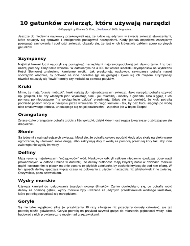 10 gatunków zwierząt, które używają narzędzi © Copyright by Charles Q. Choi, „LiveScience” 2009, 14 grudnia. Jeszcze do niedawna naukowcy przekonywali nas, że ludzie są jedynymi w świecie zwierząt stworzeniami, które nauczyły się sprawnie i inteligentnie posługiwać narzędziami. Kiedy jednak stopniowo zaczęliśmy poznawać zachowania i zdolności zwierząt, okazało się, że jest w ich królestwie całkiem sporo sprytnych gatunków. Szympansy Najbliżsi krewni ludzi nauczyli się posługiwać narzędziami najprawdopodobniej już dawno temu. I to bez naszej pomocy. Skąd takie wnioski? W datowanym na 4 300 lat wstecz siedlisku szympansów na Wybrzeżu Kości Słoniowej znaleziono kamienne młotki. Jak przekonują naukowcy, szympansy potrafią nawet sporządzić włócznie, by polować na inne naczelne (gł. na galago) i żywić się ich mięsem. Szympansy również nauczyły się "łowić" termity czy mrówki za pomocą patyków. Kruki Mimo, że mają "ptasie móżdżki", kruki należą do najmądrzejszych zwierząt. Jako narzędzi potrafią używać np. gałązek, liści czy własnych piór. Wymiatają nimi jak miotełką insekty z gniazda, albo sięgają z ich pomocą po niedostępne "na wyciągnięcie dzioba" przedmioty. Udało się też dowieść, że kruki potrafią podnieść poziom wody w naczyniu przez wrzucanie do niego kamieni tak, by bez trudu sięgnąć po wodę albo smakowitego robaka, unoszącego się na jej powierzchni zupełnie jak w bajce Ezopa! Orangutany Żyjące dziko orangutany potrafią zrobić z liści gwizdki, dzięki którym ostrzegają towarzyszy o zbliżającym się drapieżniku. Słonie Są jednymi z najmądrzejszych zwierząt. Mówi się, że potrafią celowo upuścić kłody albo skały na elektryczne ogrodzenia, by utorować sobie drogę, albo zakrywają doły z wodą za pomocą przeżutej kory tak, aby inne zwierzęta nie wypiły im wody. Delfiny Mają renomę największych "mózgowców" wód. Naukowcy odkryli całkiem niedawno (podczas obserwacji prowadzonych w Zatoce Rekina w Australii), że delfiny butlonose mają zwyczaj nosić w dziobach morskie gąbki i ocierać nimi o piasek na dnie oceanu (w płytkich zatokach), by odsłonić kryjącą się pod nim ofiarę. W ten sposób delfiny spędzają więcej czasu na polowaniu z użyciem narzędzia niż jakiekolwiek inne zwierzę. Oczywiście, poza człowiekiem. Wydry morskie Używają kamieni do rozłupywania twardych skorup ślimaków. Zanim dowiedziano się, co potrafią robić delfiny za pomocą gąbek, wydry morskie były uważane za jedynych przedstawicieli wodnego królestwa, które potrafią posługiwać się narzędziami. Goryle Są nie tylko wyjątkowo silne (w przybliżeniu 10 razy silniejsze niż przeciętny dorosły człowiek), ale też potrafią nieźle główkować. Goryle potrafią na przykład używać gałęzi do mierzenia głębokości wody, albo budować z nich prowizoryczne mosty nad grzęzawiskami. Ośmiornice Całkiem niedawno odkryto, że pewien gatunek ośmiornicy, zamieszkującej u wybrzeży Indonezji, używa łupiny orzecha kokosowego jak przenośnej zbroi i chowa się do niej. Makaki Zamieszkujące w pobliżu buddyjskiej świątyni w Lop Buri (Tajlandia), znane są z tego, że wyrywają turystom włosy i używają ich jak nici dentystycznych (!). Zauważono nawet, że niektóre samice specjalnie spowalniają swoje ruchy tak, by młode nauczyły się, jak używać tego narzędzia. Koszatniczki Nawet gryzonie potrafią nauczyć się używania narzędzi. W jednym z eksperymentów okazało się, że koszatniczki nauczyły się posłużyć miniaturowymi grabiami, by przyciągnąć do siebie ziarna słonecznika, znajdujące się po drugiej stronie ogrodzenia. Inne przypadki Myszołowy i sokoły egipskie używają kamieni do rozbijania jaj. Zięby Darwina i wrony używają kolców do wyciągania larw lub do podważania kory drzewa. Termity odprawiają pogrzeb usypując kopiec.