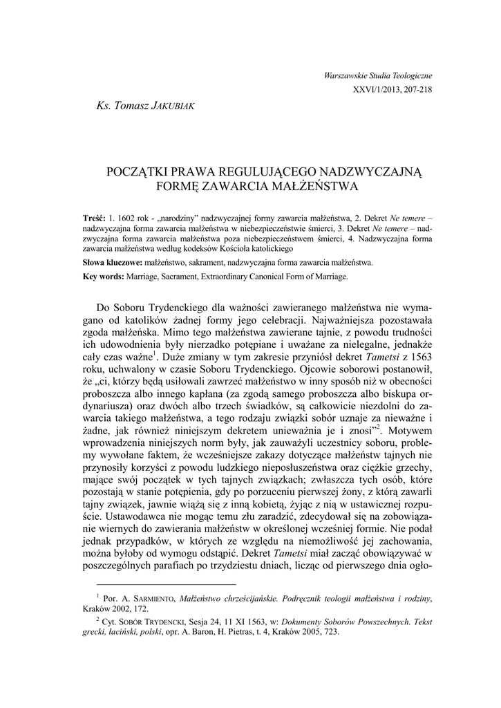 Warszawskie Studia Teologiczne XXVI/1/2013, 207-218 Ks. Tomasz JAKUBIAK POCZĄTKI PRAWA REGULUJĄCEGO NADZWYCZAJNĄ FORMĘ ZAWARCIA MAŁśEŃSTWA Treść: 1. 1602 rok - „narodziny” nadzwyczajnej formy zawarcia małŜeństwa, 2. Dekret Ne temere – nadzwyczajna forma zawarcia małŜeństwa w niebezpieczeństwie śmierci, 3. Dekret Ne temere – nadzwyczajna forma zawarcia małŜeństwa poza niebezpieczeństwem śmierci, 4. Nadzwyczajna forma zawarcia małŜeństwa według kodeksów Kościoła katolickiego Słowa kluczowe: małŜeństwo, sakrament, nadzwyczajna forma zawarcia małŜeństwa. Key words: Marriage, Sacrament, Extraordinary Canonical Form of Marriage. Do Soboru Trydenckiego dla waŜności zawieranego małŜeństwa nie wymagano od katolików Ŝadnej formy jego celebracji. NajwaŜniejsza pozostawała zgoda małŜeńska. Mimo tego małŜeństwa zawierane tajnie, z powodu trudności ich udowodnienia były nierzadko potępiane i uwaŜane za nielegalne, jednakŜe cały czas waŜne1. DuŜe zmiany w tym zakresie przyniósł dekret Tametsi z 1563 roku, uchwalony w czasie Soboru Trydenckiego. Ojcowie soborowi postanowił, Ŝe „ci, którzy będą usiłowali zawrzeć małŜeństwo w inny sposób niŜ w obecności proboszcza albo innego kapłana (za zgodą samego proboszcza albo biskupa ordynariusza) oraz dwóch albo trzech świadków, są całkowicie niezdolni do zawarcia takiego małŜeństwa, a tego rodzaju związki sobór uznaje za niewaŜne i Ŝadne, jak równieŜ niniejszym dekretem uniewaŜnia je i znosi”2. Motywem wprowadzenia niniejszych norm były, jak zauwaŜyli uczestnicy soboru, problemy wywołane faktem, Ŝe wcześniejsze zakazy dotyczące małŜeństw tajnych nie przynosiły korzyści z powodu ludzkiego nieposłuszeństwa oraz cięŜkie grzechy, mające swój początek w tych tajnych związkach; zwłaszcza tych osób, które pozostają w stanie potępienia, gdy po porzuceniu pierwszej Ŝony, z którą zawarli tajny związek, jawnie wiąŜą się z inną kobietą, Ŝyjąc z nią w ustawicznej rozpuście. Ustawodawca nie mogąc temu złu zaradzić, zdecydował się na zobowiązanie wiernych do zawierania małŜeństw w określonej wcześniej formie. Nie podał jednak przypadków, w których ze względu na niemoŜliwość jej zachowania, moŜna byłoby od wymogu odstąpić. Dekret Tametsi miał zacząć obowiązywać w poszczególnych parafiach po trzydziestu dniach, licząc od pierwszego dnia ogło1 Por. A. SARMIENTO, MałŜeństwo chrześcijańskie. Podręcznik teologii małŜeństwa i rodziny, Kraków 2002, 172. 2 Cyt. SOBÓR TRYDENCKI, Sesja 24, 11 XI 1563, w: Dokumenty Soborów Powszechnych. Tekst grecki, łaciński, polski, opr. A. Baron, H. Pietras, t. 4, Kraków 2005, 723. 208 KS. TOMASZ JAKUBIAK szenia w kaŜdej parafii3. Jak podkreśla Rittner, jeśli uchwały Soboru Trydenckiego były publikowane w ogólności, bez szczegółowej publikacji dekretu Tametsi w konkretnej parafii, tam jego postanowienia nie miały mocy obowiązującej. Na obowiązywanie dekretu wpływ miała równieŜ jego publikacja nie jako prawa powszechnego, lecz partykularnego. W tym drugim przypadku, jego normy równieŜ nie obowiązywały w danej parafii, chyba Ŝe prawidłową publikację zastąpiło ogólne przekonanie, Ŝe zawsze i stale stosowano się do formy trydenckiej – w przeświadczeniu, Ŝe wynika ona z prawa powszechnego. Ze względu na powyŜsze wątpliwości, na mocy osobnych konstytucji papieskich katolicy zawierający małŜeństwo mieszane nie byli na wskazanych w tych dokumentach terytoriach zobligowani do zachowania formy kanonicznej4. 1. 1602 rok - „narodziny” nadzwyczajnej formy zawarcia małŜeństwa Jak to bywa z Ŝyciem, okazało się ono bardziej skomplikowane niŜ przewidział to ustawodawca. Na terenach misyjnych były miejsca, gdzie dostęp do kapłana mogącego pobłogosławić związek małŜeński był bardzo utrudniony. W Niderlandach, kiedy religią przewaŜającą stał się kalwinizm, duchowni katoliccy byli prześladowani, a zachowanie jedynej przepisanej przez dekret Tametsi formy zawierania małŜeństw przez katolików okazywał się niemoŜliwy. Kanoniści zostali zmuszeni do uznania przewagi prawa naturalnego osoby do zawarcia małŜeństwa nad prawem pozytywnym, takŜe tym stanowionym na soborze. W czasie konsultacji prowadzonych w Rzymie początkowo dominował pogląd niedopuszczający Ŝadnych wyjątków od norm zawartych w dekrecie Tametsi. Z czasem jednak w dekrecie z dn. 26 września 1602 roku, zatwierdzonym przez papieŜa w 1603 roku, znalazła się norma dopuszczająca waŜne zawieranie małŜeństw w obecności dwóch świadków, w regionach, w których występował brak kapłanów albo gdzie musieli się oni ukrywać z powodu prześladowań religijnych. Rok 1602 uznawany jest za czas narodzenia się tzw. nadzwyczajnej formy zawarcia małŜeństwa, mimo Ŝe technicznie w tekstach prawnych takie określenie nie występowało5. Praktycznych rozwiązań dotyczących wspomnianej materii dostarczała praktyka Kurii Rzymskiej. Niezachowanie formy dopuszczone było jedynie w okre3 Por. TamŜe, 721- 725. 4 Por. E. RITTNER, Prawo kościelne katolickie, Lwów 1907, 338. 340 5 Por. R. NAVARRO-VALLS, "The Form of the Celebration of Marriage", w: Exegetical Commentary on the Code of Canon Law, red. Á. MARZOA, J. MIRAS, R. RODRÍGUEZ-OCAÑA, English language ed. E. CAPARROS, P. LAGGES, Vol III/2, Montreal Chicago 2004, 1470. Cronin w komentarzu dekretu Ne Temere, jako jeden z pierwszych dokumentów Stolicy Apostolskiej poświęcony niniejszej materii, wymienia dokument z 18.01.1663 roku zamieszczony w: Collectanea S. Congregationis de Propaganda Fide seu Decreta Instructiones Rescripta Pro Apostolicis Missionibus, vol. 2, Romae 1907, n. 1386-1388 – por. CH. J. CRONIN, The New Matrimonial Legislation. A Commentary on Decree of the Sacred Congregation of the Council, Ne temere, published on the 2nd of August 1907, by ordered of Pope Pius X, on Be