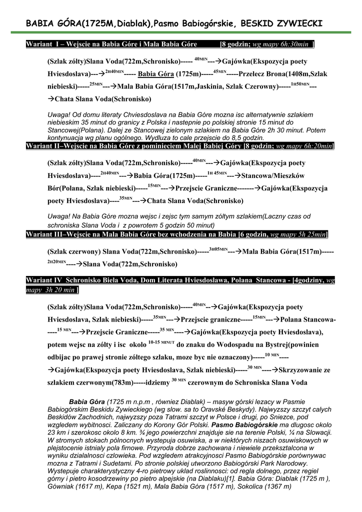 BABIA GÓRA(1725M,Diablak),Pasmo Babiogórskie, BESKID ZYWIECKI Wariant I – Wejscie na Babia Góre i Mala Babia Góre [8 godzin; wg mapy 6h:30min ] (Szlak zólty)Slana Voda(722m,Schronisko)----- 40MIN---àGajówka(Ekspozycja poety Hviesdoslava)---à2H40MIN----- Babia Góra (1725m)-----45MIN-----Przelecz Brona(1408m,Szlak niebieski)-----25MIN---àMala Babia Góra(1517m,Jaskinia, Szlak Czerowny)-----1H50MIN--àChata Slana Voda(Schronisko) Uwaga! Od domu literaty Chviesdoslava na Babia Góre mozna isc alternatywnie szlakiem niebieskim 35 minut do granicy z Polska i nastepnie po polskiej stronie 15 minut do Stancowej(Polana). Dalej ze Stancowej zielonym szlakiem na Babia Góre 2h 30 minut. Potem kontynuacja wg planu ogólnego. Wydluza to cale przejscie do 8,5 godzin. Wariant II–Wejscie na Babia Góre z pominieciem Malej Babiej Góry [8 godzin; wg mapy 6h:20min] (Szlak zólty)Slana Voda(722m,Schronisko)-----40MIN---àGajówka(Ekspozycja poety Hviesdoslava)----2H40MIN---àBabia Góra(1725m)-----1H 45MIN---àStancowa/Mieszków Bór(Polana, Szlak niebieski)-----15MIN---àPrzejscie Graniczne-------àGajówka(Ekspozycja poety Hviesdoslava)----35MIN---àChata Slana Voda(Schronisko) Uwaga! Na Babia Góre mozna wejsc i zejsc tym samym zóltym szlakiem(Laczny czas od schroniska Slana Voda i z powrotem 5 godzin 50 minut) Wariant III–Wejscie na Mala Babia Góre bez wchodzenia na Babia [6 godzin, wg mapy 5h 25min] (Szlak czerwony) Slana Voda(722m,Schronisko)-----3H05MIN---àMala Babia Góra(1517m)----2H20MIN ----àSlana Voda(722m,Schronisko) Wariant IV Schronisko Biela Voda, Dom Literata Hviesdoslawa, Polana Stancowa - [4godziny, wg mapy 3h 20 min ] (Szlak zólty)Slana Voda(722m,Schronisko)-----40MIN--àGajówka(Ekspozycja poety Hviesdoslava, Szlak niebieski)-----35MIN---àPrzejscie graniczne-----15MIN---àPolana Stancowa----15 MIN---àPrzejscie Graniczne-----35 MIN----àGajówka(Ekspozycja poety Hviesdoslava), potem wejsc na zólty i isc okolo 10-15 MINUT do znaku do Wodospadu na Bystrej(powinien odbijac po prawej stronie zóltego szlaku, moze byc nie oznaczony)-----10 MIN---àGajówka(Ekspozycja poety Hviesdoslava, Szlak niebieski)-----30 MIN----àSkrzyzowanie ze szlakiem czerwonym(783m)-----idziemy 30 MIN czerownym do Schroniska Slana Voda Babia Góra (1725 m n.p.m , równiez Diablak) – masyw górski lezacy w Pasmie Babiogórskim Beskidu Zywieckiego (wg slow. sa to Oravské Beskydy). Najwyzszy szczyt calych Beskidów Zachodnich, najwyzszy poza Tatrami szczyt w Polsce i drugi, po Sniezce, pod wzgledem wybitnosci. Zaliczany do Korony Gór Polski. Pasmo Babiogórskie ma dlugosc okolo 23 km i szerokosc okolo 8 km. ¾ jego powierzchni znajduje sie na terenie Polski, ¼ na Slowacji. W stromych stokach pólnocnych wystepuja osuwiska, a w niektórych niszach osuwiskowych w plejstocenie istnialy pola firnowe. Przyroda dobrze zachowana i niewiele przeksztalcona w wyniku dzialalnosci czlowieka. Pod wzgledem atrakcyjnosci Pasmo Babiogórskie porównywac mozna z Tatrami i Sudetami. Po stronie polskiej utworzono Babiogórski Park Narodowy. Wystepuje charakterystyczny 4-ro pietrowy uklad roslinnosci: od regla dolnego, przez regiel górny i pietro kosodrzewiny po pietro alpejskie (na Diablaku)[1]. Babia Góra: Diablak (1725 m ), Gówniak (1617 m), Kepa (1521 m), Mala Babia Góra (1517 m), Sokolica (1367 m) Hala Rysianka(1322m, schr. PTTK), Romanka(1357m), BESKID ZYWIECKI Wariant I( Hala Rysianka(schr. PTTK), Romanka [8 godzin, 22km, wg mapy 6h 55min] (Szlak Zielony)Sopotnia Wielka (715 m) -----1H30MIN --àHala Uszczawne (1145 m, Wierzcholek Gawory, Szlak Zielony ----1H 00MIN --àHala Miziowa(1330m, Schronisko PTTK, Wejscie na Szlak Czerwony)---- 1H20MIN -àTrzy Kopce(1216m, Szlak Czerowony) –0H40MIN – Hala Rysianka(1322m, Schronisko PTTK, Szlak Zólty)----0H20MIN--àdo Hali Pawlusia(Wierzcholek 1186m, Szlak Zólty---- 0H35MIN--àRomanka(1357m, Szlak Niebieski)---0H50MIN-àKotarnica(1060m, Szlak Czarny)----0H 50MIN--àSopotnia Wielka Wariant II Hala Rysianka(schr. PTTK) [ 7 godzin, wg mapy 6h 00min] (Szlak Zielony)Sopotnia Wielka (715 m)---1H30MIN-àHala Uszczawne (1145 m, Wierzcholek Gawory, Szlak Zielony----1H 00MIN-àHala Miziowa(1330m, Schronisko PTTK, Wejscie na Szlak Czerwony)---- 1H20MIN-àTrzy Kopce(1216m, Szlak Czerowony)----0H40MIN-àHala Rysianka(1322m, Schronisko PTTK, Szlak Niebieski)----1H30MIN-àSopotnia Kolonia Wariant III Hala Rysianka(schr. PTTK), Romanka [5 godzin, wg mapy 4h 35min] (Szlak Niebieski) Sopotnia Wielka Kolonia----- 2H00MIN ---à Hala Rysianka(1322m, Schronisko PTTK, Szlak Zólty)----0H20MIN --àdo Hali Pawlusia(Wierzcholek 1186m, Szlak Zólty)----0H35MIN -àRomanka(1357m, Szlak Niebieski)----0H50MIN-àKotarnica(1060m, Szlak Czarny)----0H 50MIN --àSopotnia Wielka Hala Rysianka(1150m-1260m) – wielka polana w Beskidzie Zywieckim na wschodnich i poludniowo-wschodnich zboczach Rysianki. Hala Rysianka jest jedna z najbardziej widokowych hal w Beskidach. Panorama z niej obejmuje m.in. Pilsko, Babia Góre, a przy dobrej pogodzie równiez Tatry i Mala Fatre. W poblizu hali znajduje sie rezerwat Romanka utworzony w 1963 roku, dla zachowania pierwotnego fragmentu dawnej Puszczy Karpackiej - boru swierkowego regla górnego w rejonie szczytu Romanki. Rezerwat obejmuje podszczytowe partie Romanki (1200m-1366m). Powierzchnia rezerwatu wynosi okolo 125 ha (od 2005 roku) - wczesniej niecale 100 ha. Najwazniejszym skladnikiem roslinnosci rezerwatu sa okazy swierków w wieku 150 - 200 lat. W poblizu hali znajduje sie takze rezerwat pod Rysianka utworzony w 1970 na wysokosci 950-1170 m n.p.m. Powierzchnia (27,54 ha), obejmuje zródla potoku Sopotni. Romanka (1366 m) – szczyt w Grupie Lipowskiego Wierchu i Romanki. Stoki Romanki podczas II wojny swiatowej byly schronieniem oddzialów partyzanckich, które pod koniec wojny toczyly walki z okupantem. Dzialal tutaj oddzial partyzancki „Romanka”. Jedna ze spektakularnych akcji bylo spacyfikowanie schroniska na Rysiance, gdzie znajdowal sie