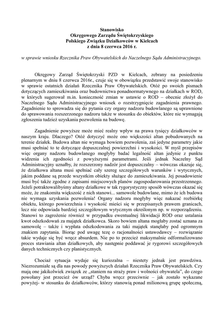 Stanowisko Okręgowego Zarządu Świętokrzyskiego Polskiego Związku Działkowców w Kielcach z dnia 8 czerwca 2016 r. w sprawie wniosku Rzecznika Praw Obywatelskich do Naczelnego Sądu Administracyjnego. Okręgowy Zarząd Świętokrzyski PZD w Kielcach, zebrany na posiedzeniu plenarnym w dniu 8 czerwca 2016r., czuje się w obowiązku przedstawić swoje stanowisko w sprawie ostatnich działań Rzecznika Praw Obywatelskich. Otóż po swoich pismach dotyczących zamieszkiwania oraz budownictwa ponadnormatywnego na działkach w ROD, w których sugerował m.in. konieczność zmian w ustawie o ROD – obecnie złożył do Naczelnego Sądu Administracyjnego wniosek o rozstrzygnięcie zagadnienia prawnego. Zagadnienie to sprowadza się do pytania czy organy nadzoru budowlanego są uprawnione do sprawowania rozszerzonego nadzoru także w stosunku do obiektów, które nie wymagają zgłoszenia tudzież uzyskania pozwolenia na budowę. Zagadnienie powyższe może mieć realny wpływ na prawa tysięcy działkowców w naszym kraju. Dlaczego? Otóż dotyczyć może ono większości altan pobudowanych na terenie działek. Budowa altan nie wymaga bowiem pozwolenia, zaś jedyne parametry jakie musi spełniać to te dotyczące dopuszczalnej powierzchni i wysokości. W myśl przepisów więc organy nadzoru budowlanego mogłyby badać legalność altan jedynie z punktu widzenia ich zgodności z powyższymi parametrami. Jeśli jednak Naczelny Sąd Administracyjny uznałby, że rozszerzony nadzór jest dopuszczalny – wówczas okazuje się, że działkowa altana musi spełniać cały szereg szczegółowych warunków i wytycznych, jakim poddane są przede wszystkim obiekty służące do zamieszkiwania. Jej posadowienie musi być także zgodne z zapisami miejscowych planów zagospodarowania przestrzennego. Jeżeli potraktowalibyśmy altany działkowe w tak rygorystyczny sposób wówczas okazać się może, że znakomita większość z nich stanowi... samowole budowlane, mimo że ich budowa nie wymaga uzyskania pozwolenia! Organy nadzoru mogłyby więc nakazać rozbiórkę obiektu, którego powierzchnia i wysokość mieści się w przepisanych prawem granicach, lecz nie odpowiada bardziej szczegółowym wytycznym określonym np. w rozporządzeniu. Stanowi to zagrożenie również w przypadku ewentualnej likwidacji ROD oraz ustalania kwot odszkodowań za majątek działkowca. Skoro bowiem altana mogłaby zostać uznana za samowolę – także i wypłata odszkodowania za taki majątek stanęłaby pod ogromnym znakiem zapytania. Biorąc pod uwagę tezę o racjonalności ustawodawcy – rozwiązanie takie wydaje się być wręcz absurdem. Nie po to przecież maksymalnie odformalizowano proces stawiania altan działkowych, aby następnie poddawać je rygorowi szczegółowych danych technicznych czy planistycznych. Chociaż sytuacja wydaje się kuriozalna – niestety jednak jest prawdziwa. Niezrozumiałe są dla nas powody powyższych działań Rzecznika Praw Obywatelskich. Czy mają one jakikolwiek związek ze „staniem na straży praw i wolności obywatela”, do czego powołany jest przecież ów urząd? Chyba wręcz przeciwnie – jak zostało wykazane powyżej- w stosunku do działkowców, którzy stanowią ponad milionową grupę społeczną, przyczynić się mogą raczej do zupełnego ich wypaczenia. Zupełnie niejasnym jest w imieniu i na rzecz czyich interesów zwrócił się Pan Rzecznik Do Naczelnego Sądu Administracyjnego. Nauczeni doświadczeniem oraz pełni obaw o respektowanie praw setek tysięcy polskich działkowców – zwracamy się do Rzecznika Praw Obywatelskich o wycofanie swojego wniosku, który doprowadzić może do podważenia legalności ich altan na terenie działek rodzinnych, pomimo ich oczywistej zgodności z przepisami prawa. Wyrażamy stanowczy sprzeciw wobec działań, które godzą w prawa i spokój obywateli oraz rodzą obawy dotyczące legalności ich majątku. Okręgowy Zarząd Świętokrzyski Polskiego Związku Działkowców w Kielcach