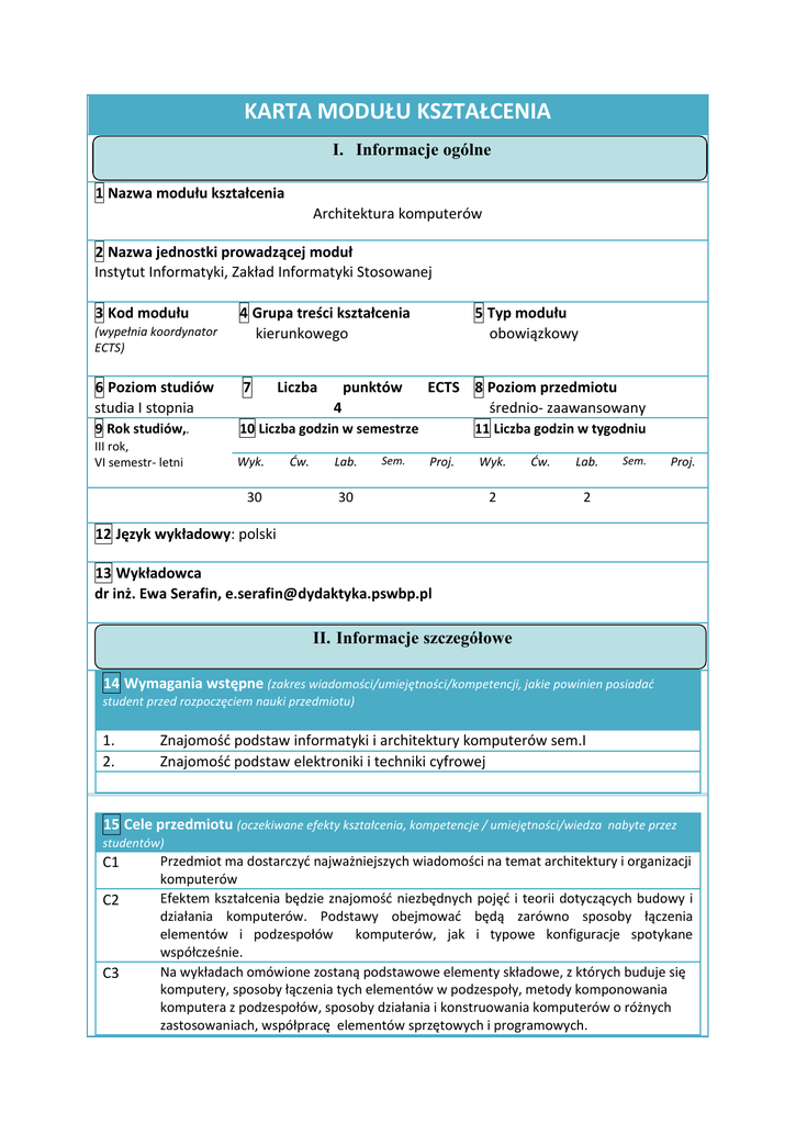KARTA MODUŁU KSZTAŁCENIA I. Informacje ogólne I. 1 Nazwa modułu kształcenia Architektura komputerów 2 Nazwa jednostki prowadzącej moduł Instytut Informatyki, Zakład Informatyki Stosowanej 3 Kod modułu (wypełnia koordynator ECTS) 4 Grupa treści kształcenia kierunkowego 6 Poziom studiów studia I stopnia 7 Liczba punktów 9 Rok studiów,. 10 Liczba godzin w semestrze III rok, VI semestr- letni Wyk. 4 30 Ćw. Lab. Sem. 5 Typ modułu obowiązkowy ECTS 8 Poziom przedmiotu średnio- zaawansowany 11 Liczba godzin w tygodniu Proj. 30 Wyk. 2 Ćw. Lab. Sem. Proj. 2 12 Język wykładowy: polski 13 Wykładowca dr inż. Ewa Serafin, [email protected] II. Informacje szczegółowe 14 Wymagania wstępne (zakres wiadomości/umiejętności/kompetencji, jakie powinien posiadać student przed rozpoczęciem nauki przedmiotu) 1. 2. Znajomość podstaw informatyki i architektury komputerów sem.I Znajomość podstaw elektroniki i techniki cyfrowej 15 Cele przedmiotu (oczekiwane efekty kształcenia, kompetencje / umiejętności/wiedza nabyte przez studentów) C1 C2 C3 Przedmiot ma dostarczyć najważniejszych wiadomości na temat architektury i organizacji komputerów Efektem kształcenia będzie znajomość niezbędnych pojęć i teorii dotyczących budowy i działania komputerów. Podstawy obejmować będą zarówno sposoby łączenia elementów i podzespołów komputerów, jak i typowe konfiguracje spotykane współcześnie. Na wykładach omówione zostaną podstawowe elementy składowe, z których buduje się komputery, sposoby łączenia tych elementów w podzespoły, metody komponowania komputera z podzespołów, sposoby działania i konstruowania komputerów o różnych zastosowaniach, współpracę elementów sprzętowych i programowych. 16 Efekty kształcenia w zakresie wiedzy, umiejętności i kompetencji społecznych odniesienie do celów kształcenia nr student, który zaliczył przedmiot, potrafi: EK01 EK02 EK03 EK04 EK05 EK06 Wykonywać obliczenia na liczbach binarnych Pisać proste programy na poziomie assemblera Rozpoznawać podstawowe cechy architektur Podać organizację pamięci systemu komputerowego Prawidłowo opisać budowę i organizację jednostki centralnej Analizować systemy mikroprocesorowe i komputerowe 17 Treści programowe forma zajęć - wykłady liczba godzin odniesienie do celów kształcenia Poziomy maszynowe i języki maszynowe, architektura listy rozkazów. Tryby adresowania. Reprezentacja danych. Działania na danych. 2 K_W06, K_W20, K_W26, K_U01, K_K01, K_U11 2 W3 Sterowanie przebiegiem programu. Warunki i rozgałęzienia. 2 W4 Organizacja i hierarchia pamięci. 4 W5 Buforowanie informacji. Pamięć podręczna – organizacja i obsługa. 2 W6 Komunikacja z otoczeniem – magistrale. 4 W7 Potokowe przetwarzanie rozkazów. 2 W8 Prognoza i realizacja rozgałęzień. 2 W9 Modele przetwarzania informacji. Współpraca wielu jednostek wykonawczych. Przetwarzanie współbieżne. 2 K_W06, K_W20, K_W26, K_U01, K_K01, K_U11 K_W06, K_W20, K_W26, K_U01, K_K01, K_U11 K_W06, K_W20, K_W26, K_U01, K_K01, K_U11 K_W06, K_W20, K_W26, K_U01, K_K01, K_U11 K_W06, K_W20, K_W26, K_U01, K_K01, K_U11 K_W06, K_W20, K_W26, K_U01, K_K01, K_U11 K_W06, K_W20, K_W26, K_U01, K_K01, K_U11 K_W06, K_W20, K_W26, K_U01, K_K01, K_U11 Ochrona danych i zarządzanie pamięci. 2 W1 W2 W10 W11 2 K_W06, K_W20, K_W26, K_U01, K_K01, K_U11 K_W06, K_W20, K_W26, K_U01, K_K01, K_U1106, W12 W13 Koncepcja pamięci wirtualnej. Segmentacja i stronicowanie. Obsługa zdarzeń – przerwania i wyjątki. suma godzin 2 K_W06, K_W20, K_W26, K_U01, 2 K_W06, K_W20, K_W26, K_U01, K_K01, K_U11 30 forma zajęć - laboratoria L1 L2 L3 L4 L5 L6 L7 L8 L9 L108 L11 L12 Poznanie wybranego programu do symulacji komputerowej układów cyfrowych i praktyczna realizacja zadanych elementów. Analiza i realizacja zadanych układów logicznych z pomocą programu symulacyjnego. Realizacja układowa półsumatora i sumatora (wielobitowego) Analiza sekwencyjnych układów przełączających (układy z pamięcią) przerzutników asynchronicznych. Analiza rejestrów i ich realizacja układowa rejestry z równoległym wprowadzaniem i wyprowadzaniem informacji, rejestry przesuwne. Przykłady rozwiązań technicznych liczników (jednokierunkowe, rewersyjne) Praktyczne wykonanie i symulacja działania komparatora 4-bitowego w programie. Kodery i dekodery – realizacja praktyczna i symulacja działania Przykłady realizacji konwerterów kodów (np. NKB w Graya itp.). Multipleksery i demultipleksery. Projektowanie i realizacja pamięci RAM, ROM Schemat funkcjonalny mikrokomputera. Budowa systemu komputerowego – magistrale, BIOS – funkcje, upgrade. Program Setup BIOS. Pamięci zewnętrzne w komputerze – konfiguracja, podłączenie. Podstawy programowania komputerów w rozkazach liczba godzin odniesienie do celów kształcenia 4 K_W06, K_W21, K_U01, K_U11, K_K01 2 K_W06, K_W21, K_U01, K_U11, K_K01 2 K_W06, K_W21, K_U01, K_U11, K_K01 2 K_W06, K_W21, K_U01, K_U11, K_K01 2 K_W06, K_W21, K_U01, K_U11, K_K01 2 K_W06, K_W21, K_U01, K_U11, K_K01 2 K_W06, K_W21, K_U01, K_U11, K_K01 2 K_W06, K_W21, K_U01, K_U11, K_K01 4 K_W06, K_W21, K_U01, K_U11, K_K01 2 K_W06, K_W21, K_U01, K_U11, K_K01 2 K_W06, K_W21, K_U01, K_U11, K_K01 4 K_W06, K_W21, K_U01, K_U11, K_K01 maszynowych. Języki programowania. Translator. Proste programy na poziomie asemblera. suma godzin 30 18 Narzędzia/metody dydaktyczne 1. 2. Wykład wspomagany prezentacją multimedialną Ćwiczenia w laboratorium realizacja samodzielnych zadań symulacyjnych– sprzęt i oprogramowanie 19 Sposoby oceny (F – formująca, P – podsumowująca) F1. Laboratorium: sprawdziany wejściowe, sprawozdania. F2. Wykład: egzamin końcowy. 20 Obciążenie pracą studenta forma aktywności Godziny kontaktowe z nauczycielem Przygotowanie się do laboratorium Przygotowanie się do zajęć Przygotowanie do egzaminu SUMA SUMARYCZNA LICZBA PUNKTÓW ECTS DLA PRZEDMIOTU średnia liczba godzin na zrealizowanie aktywn