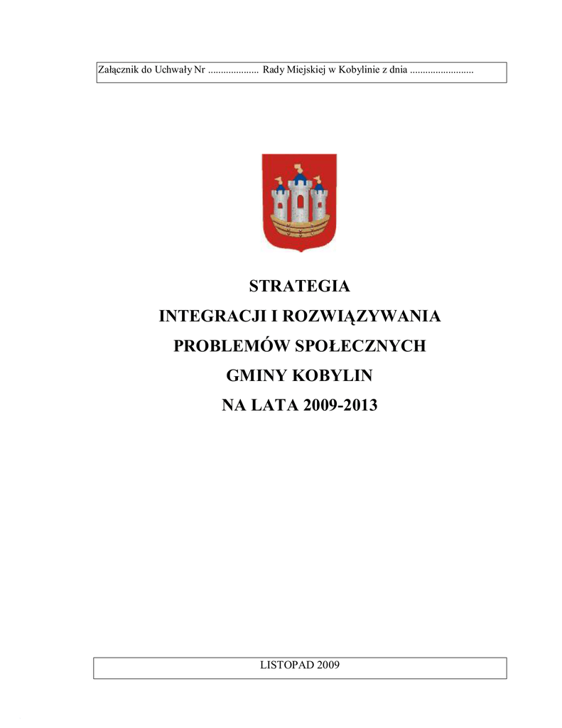 Załącznik do Uchwały Nr .................... Rady Miejskiej w Kobylinie z dnia ......................... STRATEGIA INTEGRACJI I ROZWIĄZYWANIA PROBLEMÓW SPOŁECZNYCH GMINY KOBYLIN NA LATA 2009-2013 LISTOPAD 2009 SPIS TREŚCI WPROWADZENIE ................................ ................................ ................................ .......3 1. CZĘŚĆ WSTĘPNA................................ ................................ ................................ ....6 1.1. PODSTAWY POLITYKI SPOŁECZNEJ................................ ............................. 7 1.2. UWARUNKOWANIA SPOŁECZNO-PRAWNE TWORZENIA STRATEGII ...8 1.3. PRZESŁANKI WYNIKAJĄCE Z DOKUMENTÓW STRATEGICZNYCH.......10 2. CZĘŚĆ DIAGNOSTYCZNA ................................ ................................ ..................20 2.1. CHARAKTERYSTYKA GMINY ................................ ................................ ......21 2.2. DEMOGRAFIA................................ ................................ ................................ ..22 2.3. PROBLEMY SPOŁECZNE IDENTYFIKOWANE PRZEZ OŚRODEK POMOCY SPOŁECZNEJ................................ ................................ ...................27 2.4. KWESTIA DZIECKA ................................ ................................ ........................ 35 2.5. KWESTIA OSÓB BEZROBOTNYCH ................................ .............................. 40 2.6. KWESTIA UZALEŻNIEŃ................................ ................................ .................46 2.7. KWESTIA NIEPEŁNOSPRAWNOŚCI ................................ ............................. 50 2.8. KWESTIA PRZESTĘPCZOŚCI................................ ................................ .........54 2.9. PROBLEMY SPOŁECZNE W OCENIE ŚRODOWISKA LOKALNEGO ........55 2.10. ANALIZA SWOT ................................ ................................ ............................ 64 2.11. ZASOBY UMOŻLIWIAJĄCE ROZWIĄZYWANIE PROBLEMÓW SPOŁECZNYCH ................................ ................................ ................................ 72 2.12. PODSUMOWANIE CZĘŚCI DIAGNOSTYCZNEJ ................................ ........77 3. CZĘŚĆ PROGRAMOWA................................ ................................ ....................... 80 3.1. MISJA ................................ ................................ ................................ ................81 3.2. CELE STRATEGICZNE, OPERACYJNE I KIERUNKI DZIAŁAŃ .................84 3.3. MONITORING I WDRAŻANIE STRATEGII ................................ ...................92 4. UWAGI KOŃCOWE................................ ................................ ............................... 97 SPIS DIAGRAMÓW, TABEL I WYKRESÓW ................................ ........................ 98 STRATEGIA INTEGRACJI I ROZWIĄZYWANIA PROBLEMÓW SPOŁECZNYCH GMINY KOBYLIN 2 WPROWADZENIE Mówiąc o gminnej strategii rozwiązywania problemów społecznych, należy mieć na myśli w szczególności działania publicznych i prywatnych instytucji pomocy społecznej (i pokrewnych), prowadzone na terenie gminy, podejmowane dla poprawy warunków zaspokojenia potrzeb przez wybrane kategorie osób i rodzin, mieszkańców gminy. W oparciu o uzyskane informacje i materiały został przygotowany dokument dla gminy Kobylin, który pozwoli na racjonalizację lokalnej polityki społecznej oraz wskaże obszary, które w najbliższym czasie powinny stać się przedmiotem szczególnej troski władz lokalnych. Metodyka opracowania dokumentu pozwoliła zaangażować środowisko lokalne w budowę strategii na najważniejszych etapach, od diagnozy do wdrożenia i realizacji. Przedłożony materiał został opracowany w Miejsko-Gminnym Ośrodku Pomocy Społecznej w Kobylinie przy merytorycznym wsparciu Ośrodka Kształcenia Służb Publicznych i Socjalnych – Centrum AV w Częstochowie. Pomoc zewnętrzna polegała głównie na doradztwie i systematyzacji układu głównych elementów wypracowanego dokumentu. Perspektywa czasowa obowiązywania niniejszego dokumentu została skomunikowana z głównymi dokumentami strategicznymi wpływającymi na rozwiązywanie lokalnych problemów, tj. Narodowymi Strategicznymi Ramami Odniesienia (Narodowa Strategia Spójności) oraz Narodową Strategią Integracji Społecznej, wyznaczającymi działania i stwarzającymi możliwość ubiegania się o środki zewnętrzne do 2013 roku. W pracach nad strategią uczestniczyli eksperci, specjaliści, przedstawiciele środowisk oświaty, kultury, ochrony zdrowia, sądownictwa, policji, pomocy społecznej, przedstawiciele organizacji pozarządowych i samorządu lokalnego. Strategia Integracji i Rozwiązywania Problemów Społecznych Gminy Kobylin na lata 2009-2013 składa się z trzech zasadniczych części, tj. części wstępnej, diagnostycznej i programowej. Część wstępna zawiera elementarne informacje dotyczące zasad konstruowania dokumentu – są w niej przedstawione podstawy polityki społecznej, uwarunkowania STRATEGIA INTEGRACJI I ROZWIĄZYWANIA PROBLEMÓW SPOŁECZNYCH GMINY KOBYLIN 3 społeczno-prawne tworzenia strategii oraz została dokonana analiza dokumentów strategicznych, z którymi powinna korespondować i być spójna strategia. Część diagnostyczna dokumentu zawiera charakterystykę gminy, informacje na temat sytuacji demograficzno-bytowej jej mieszkańców oraz diagnozę problemów społecznych gminy, opartą na badaniu źródeł zastanych oraz analizie specjalnie skonstruowanych do tego celu ankiet i wywiadów. Diagnoza obejmuje następujące kwestie: 1. Problemy społeczne identyfikowane przez Ośrodek Pomocy Społecznej; 2. Kwestia dziecka; 3. Kwestia osób bezrobotnych; 4. Kwestia uzależnień; 5. Kwestia niepełnosprawności; 6. Kwestia przestępczości; 7. Problemy społeczne w ocenie środowiska lokalnego; 8. Analiza SWOT; 9. Zasoby umożliwiające rozwiązywanie problemów społecznych. W podsumowaniu części diagnostycznej, po nałożeniu wyników