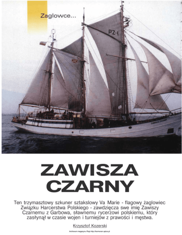 ZAWISZA CZARNY Ten trzymasztowy szkuner sztakslowy Va Marie - flagowy żaglowiec Związku Harcerstwa Polskiego - zawdzięcza swe imię Zawiszy Czarnemu z Garbowa, sławnemu rycerzowi polskiemu, który zasłynął w czasie wojen i turniejów z prawości i męstwa. Krzysztof Kozerski Archiwum magazynu Rejs http://kormoran.aplus.pl ZAWISZA CZARNY Rok budowy: 1952 Stocznia: Stocznia Północna w Gdańsku Materiał konstrukcyjny: stal Długość całkowita: 42,09 m Długość kadłuba: 36,1 m Szerokość: 6,7 m Zanurzenie:- 4,6 m Tonaż: 171,71 BRT Powierzchnia żagli: max. 625,5 m2 Silnik: 390 KM, diesel (oryginalna jednostka napędowa z U-Boota) Max. prędkość pod żaglami: około 12 węzłów Załoga: 6 osób załogi stałej + do 40 osób załogi szkolnej Pierwszy ZAWISZA CZARNY (ex SCHWARZER HUSAR '46, ZAWISZA CZARNY'39, HARCERZ'35, PETREA '34) został kupiony w 1934 roku od Szwedów. Wybudowany w 1901 roku jako żaglowy frachtowiec, był drewnianym, 3-masztowym szkunerem gaflowym; powierzchnia ożaglowania ok. 430 m., długość całkowita 37,6 m., szerokość 8,1 m., zanurzenie 3,1 m., wyporność 395 t. Statek pływając jako frachtowiec kilkakrotnie zmieniał właścicieli, aż wreszcie w 1934 roku został kupiony przez ZHP i przeprowadzony do Gdyni, gdzie zmieniono jego nazwę na HARCERZ. Żaglowiec poddano przebudowie w Stoczni Gdańskiej i już w roku 1935 pod nazwą ZAWISZA CZARNY, wyruszył pod dowództwem Mariusza Zaruskiego w swój pierwszy rejs szkoleniowy. Podczas II wojny światowej, żaglowiec zaanektowany przez Niemców s ł u ż y ł im pod nazwą SCHWARZER HUSAR, szkoląc kadetów Kriegsmarine. W roku 1947 przeholowano go do Gdyni. Zły stan techniczny i brak funduszy na remont żaglowca przesądziły o jego losie; zdecydowano się zatopić go w Zatoce Gdańskiej. Z jednostki pozostał jedynie drewniany galion, przedstawiający głowę rycerza, dłuta Mścisława Kościejowskiego harcerza i studenta warszawskiej ASR Dziś dziób ZAWISZY zdobi mosiężna kopia... ZAWISZA CZARNY jest drugą jednostką o tej nazwie. Został zbudowany w 1961 roku na bazie r y b a c k i e g o lugotrawlera CIETRZEW, zwodowanego w roku 1952 w Stoczni Północnej w Gdańsku. Cała seria tych statków została wycofana z eksploatacji z powodu zbyt małej stateczności. W roku 1967 żaglowiec poddano powtórnej przebudowie i przedłużeniu; także w 1980 roku ZAWISZA przeszedł kolejną modyfikację. ZAWISZA CZARNY uczestniczył w wielu zlotach żaglowców i Regatach Cutty Sark. Nigdy nie był najszybszą jednostką, alez pewnością najbardziej rozśpiewaną. Żaglowiec Archiwum magazynu Rejs http://kormoran.aplus.pl zwykle pływa w rejsy po Bałtyku, Morzu Północnym i Śródziemnym. W 1984 roku Zawisza brał udział w Operacji Żagiel na Wielkich Jeziorach w Kanadzie i USA; wcześniej odbyty się transatlantyckie regaty żaglowców. Podczas nich ZAWISZA wsławił się przeprowadzeniem akcji ratunkowej w bardzo ciężkich warunkach pogodowych, w okolicy Bermudów. Uratował wówczas część załogi (8 osób) angielskiego żaglowca MARQUES. Po podjęciu rozbitków na pokład ZAWISZA pozostał w rejonie katastrofy; mimo bardzo silnego wiatru i wysokiego stanu morza poszukiwał innych ofiar. Na Bermudach dokąd żaglowiec zawinął - jego załogę witano jak bohaterów. Załoga ZAWISZY otrzymała za tę akcję nagrodę „Fair Play" Komitetu Olimpijskiego. W 1989-1990 żaglowiec opłynął świat w kilkuetapowym rejsie. Dwa lata później uczestniczył w obchodach 500-lecia odkrycia Ameryki Columbus'92. Z tej okazji ZAWISZA wziął udział w atlantyckich Regatach Kolumba, przepływając dwukrotnie Atlantyk i startując we wszystkich wyścigach, za wyjątkiem ostatniego, w związku z decyzją jego kapitana o dotarciu do wybrzeży Labradoru przed powrotem do Europy. W styczniu i lutym tego roku żaglowiec pod dowództwem kpt. Waldemara Mieczkowskiego dokonał historycznego, dwukrotnego opłynięcia przylądka Horn, dotarł także do stacji badawczej Polskiej Akademii Nauk im. Henryka Arctowskiego nad Zatoką Admiralicji na Wyspie Króla Jerzego (Szetlandy Południowe). Fot. Kraszewski/PAP