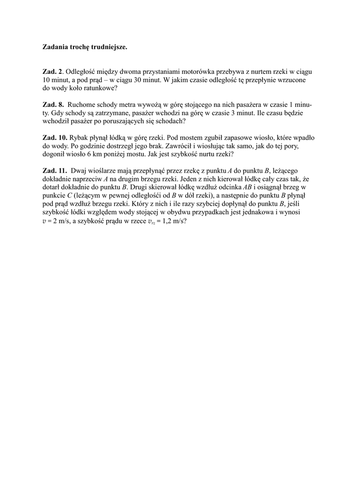 Zadania trochę trudniejsze. Zad. 2. Odległość między dwoma przystaniami motorówka przebywa z nurtem rzeki w ciągu 10 minut, a pod prąd – w ciągu 30 minut. W jakim czasie odległość tę przepłynie wrzucone do wody koło ratunkowe? Zad. 8. Ruchome schody metra wywoŜą w górę stojącego na nich pasaŜera w czasie 1 minuty. Gdy schody są zatrzymane, pasaŜer wchodzi na górę w czasie 3 minut. Ile czasu będzie wchodził pasaŜer po poruszających się schodach? Zad. 10. Rybak płynął łódką w górę rzeki. Pod mostem zgubił zapasowe wiosło, które wpadło do wody. Po godzinie dostrzegł jego brak. Zawrócił i wiosłując tak samo, jak do tej pory, dogonił wiosło 6 km poniŜej mostu. Jak jest szybkość nurtu rzeki? Zad. 11. Dwaj wioślarze mają przepłynąć przez rzekę z punktu A do punktu B, leŜącego dokładnie naprzeciw A na drugim brzegu rzeki. Jeden z nich kierował łódkę cały czas tak, Ŝe dotarł dokładnie do punktu B. Drugi skierował łódkę wzdłuŜ odcinka AB i osiągnął brzeg w punkcie C (leŜącym w pewnej odległośći od B w dół rzeki), a następnie do punktu B płynął pod prąd wzdłuŜ brzegu rzeki. Który z nich i ile razy szybciej dopłynął do punktu B, jeśli szybkość łódki względem wody stojącej w obydwu przypadkach jest jednakowa i wynosi v = 2 m/s, a szybkość prądu w rzece vrz = 1,2 m/s?