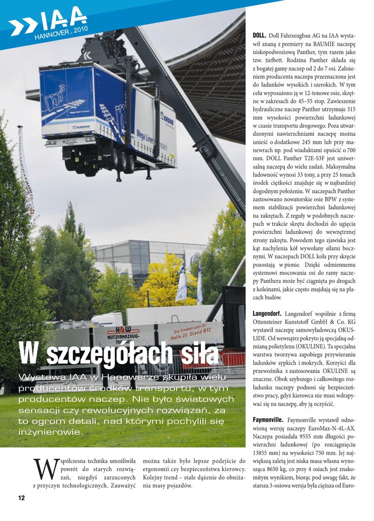 IAA 2010 DOLL. Doll Fahrzeugbau AG na IAA wystawił znaną z premiery na BAUMIE naczepę niskopodwoziową Panther, tym razem jako tzw. tiefbett. Rodzina Panther składa się z bogatej gamy naczep od 2 do 7 osi. Założeniem producenta naczepa przeznaczona jest do ładunków wysokich i szerokich. W tym celu wyposażono ją w 12-tonowe osie, skrętne w zakresach do 45–55 stop. Zawieszenie hydrauliczne naczep Panther utrzymuje 315 mm wysokości powierzchni ładunkowej w czasie transportu drogowego. Poza utwardzonymi nawierzchniami naczepę można unieść o dodatkowe 245 mm lub przy manewrach np. pod wiaduktami opuścić o 700 mm. DOLL Panther T2E-S3F jest uniwersalną naczepą do wielu zadań. Maksymalna ładowność wynosi 33 tony, a przy 25 tonach środek ciężkości znajduje się w najbardziej dogodnym położeniu. W naczepach Panther zastosowano nowatorskie osie BPW z systemem stabilizacji powierzchni ładunkowej na zakrętach. Z reguły w podobnych naczepach w trakcie skrętu dochodzi do ugięcia powierzchni ładunkowej do wewnętrznej strony zakrętu. Powodem tego zjawiska jest kąt nachylenia kół wywołany siłami bocznymi. W naczepach DOLL koła przy skręcie pozostają w pionie. Dzięki odmiennemu systemowi mocowania osi do ramy naczepy Panthera może być ciągnięta po drogach z koleinami, jakie często znajdują się na placach budów. W szczegółach siła Wystawa IAA w Hanowerze skupiła wielu producentów środków transportu, w tym producentów naczep. Nie było światowych sensacji czy rewolucyjnych rozwiązań, za to ogrom detali, nad którymi pochylili się inżynierowie. W spółczesna technika umożliwiła powrót do starych rozwiązań, niegdyś zarzuconych z przyczyn technologicznych. Zauważyć 12 można także było lepsze podejście do ergonomii czy bezpieczeństwa kierowcy. Kolejny trend – stałe dążenie do obniżania masy pojazdów. Langendorf. Langendorf wspólnie z firmą Ottensteiner Kunststoff GmbH & Co. KG wystawił naczepę samowyładowczą OKUSLIDE. Od wewnątrz pokryto ją specjalną odmianą polietylenu (OKULINE). Ta specjalna warstwa tworzywa zapobiega przywieraniu ładunków sypkich i mokrych. Korzyści dla przewoźnika z zastosowania OKULINE są znaczne. Obok szybszego i całkowitego rozładunku naczepy podnosi się bezpieczeństwo pracy, gdyż kierowca nie musi wdrapywać się na naczepę, aby ją oczyścić. Faymonville. Faymonville wystawił odnowioną wersję naczepy EuroMax-N-4L-AX. Naczepa posiadała 9555 mm długości powierzchni ładunkowej (po rozciągnięciu 13855 mm) na wysokości 750 mm. Jej największą zaletą jest niska masa własna wynosząca 8650 kg, co przy 4 osiach jest znakomitym wynikiem, biorąc pod uwagę fakt, że starsza 3-osiowa wersja była cięższa od Euro- Hüffermann stosował już od lat bezpieczne zabezpieczenia łańcuchowe, utrzymujące kontenery na przyczepie. Niestety ich montaż był czasochłonny. Dlatego Hüffermann opracował samoczynnie zamykający się, po postawieniu kontenera, zamek. Według producenta skraca to czas załadunku o 90 proc. Nie zabrakło także naczep z Turcji Schmidt. Niemiecka firma Schmidt przywiozła do Hanoweru naczepę skrzyniową do przewozu płaskich elementów wewnątrz zabudowy. Za pomocą 4 siłowników umieszczonych pod podłogą można zaaranżować wnętrze w celu przewiezienia, np. arkuszy blach pod kątem 45 stop. W praktyce oznacza to, że w naczepie o szerokości wnętrza 2470 mm i wysokości 2650 mm można przewieźć pod kątem arkusze o długości 13600 mm i szerokości (a więc wysokości) do 3,38 m. Niektórzy przewoźnicy stosowali w takich sytuacjach specjalne stojaki, ale w drodze powrotnej z innym ładunkiem często przeszkadzały. System samoczynnie chowanych w podłodze siłowników nie tylko skraca czas załadunku, ale i podnosi bezpieczeństwo pracy. Naczepa CD38 z zabudową INOGAM Max-N-4L-AX. W trakcie jazdy na pusto lub przy nie całkiem wykorzystanej ładowności, pierwsza oś jest unoszona, jak w typowych naczepach. Produkty Faymonville wyróżniają się dodatkowo ośmiowarstwową powłoką lakierniczą oraz najwyższym światowym poziomem jakości. Meusburger. Niemiecko-szwajcarski Meusburger specjalizuje się w naczepach plandekowych do transportu ładunków ponadnormatywnych. To popularne w krajach alpejskich rozwiązanie nie przyjęło się w Polsce pomimo niewątpliwych zalet. Wystawiona naczepa Kombitrailer posiada rozsuwaną na boki (do 1250 mm z każdej strony) konstrukcję nadwozia plandekowego oraz dwie osie, które można modułowo rozbudować o kolejne. Budowa typu tiefbett umożliwia przewiezienie pod plandeką ładunków o wysokości do 3650 mm, długości (w łożu) do 6970 mm lub 13600 mm na całości naczepy. Naczepa pomimo „gabarytowego” charakteru nadaje się do wszelkich innych ładunków, w tym spaletyzowanych. Idea towarzysząca jej powstawaniu bazowała na częstym widoku zestawów ponadnormatywnych powracających na pusto, gdyż nie były w stanie podjąć się innych ładunków. Wymiary i plandekowa zabudowa redukują puste przebiegi, a więc podnoszą rentowność przewoźnika. Hüffermann. Specjalista od naczep pod kontenery komunalne, firma Hüffermann, zaprezentowała nowoczesny zamek kontenerowy, eliminujący stosowane dotychczas łańcuchy. W transporcie kontenerów bramowych Van Eck. Holenderski Van Eck, specjalista od wyrafinowanych naczep, na IAA wystawił ciekawe naczepy dwupoziomowe. Bazujące na kesonowym podwoziu naczepy (podobnych rozwiązań można się dopatrzyć w naczepach do transportu prefabrykatów betonowych) przygotowano w wersjach do przewozów ładunków świeżych i dystrybucyjnych. Zdaniem producenta upowszechnienie się naczep tego typu mogłoby zredukować aż 80 proc. pustych przebiegów. Naczepy posiadają o 30–40 większą pojemność. Potrafią pomieścić do 82 palet na dwóch poziomach. Obsługę palet zapewnia winda w tylnej części naczepy. Kässbohrer. Niemiecko-turecki Kässbo